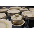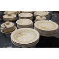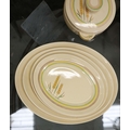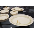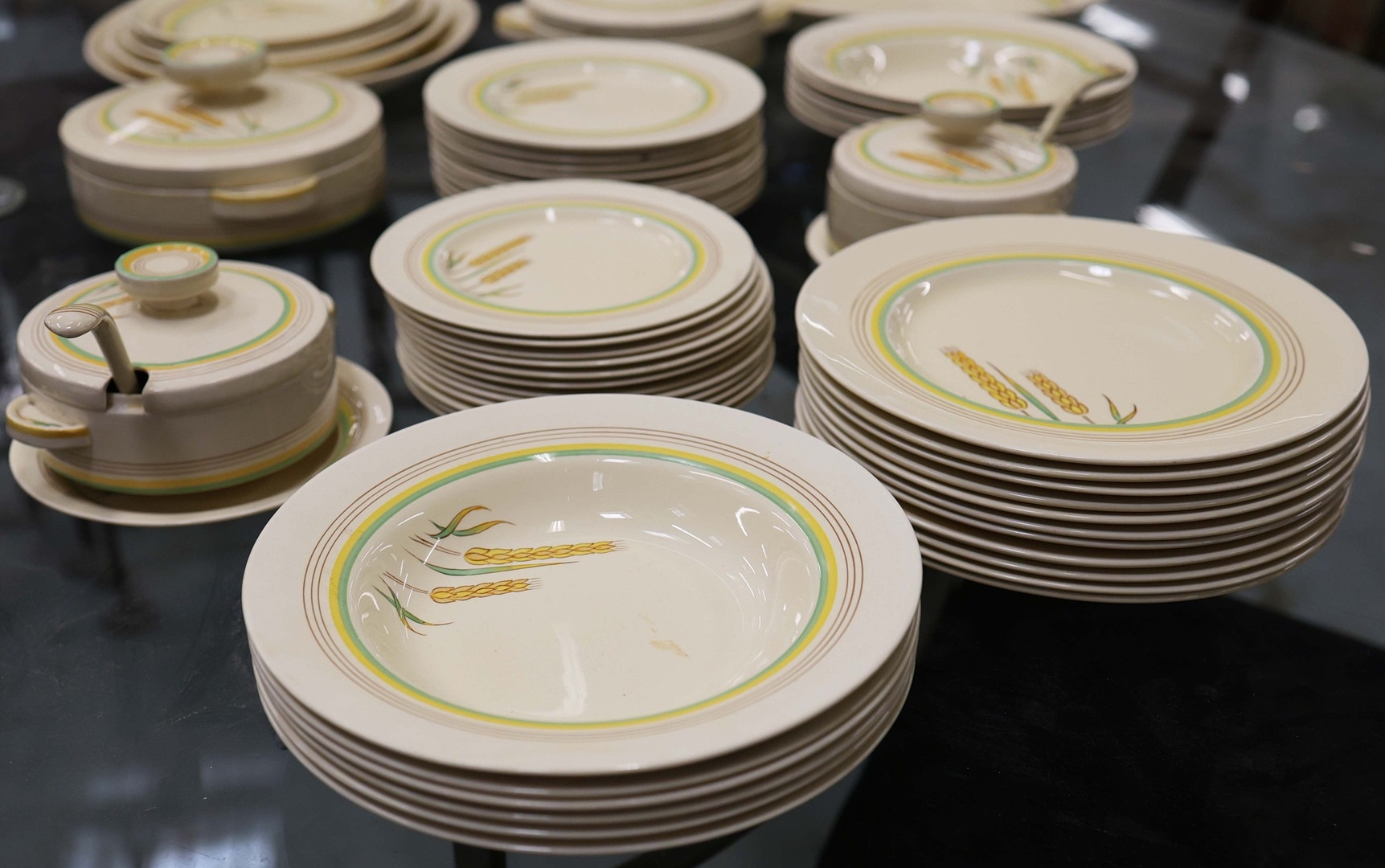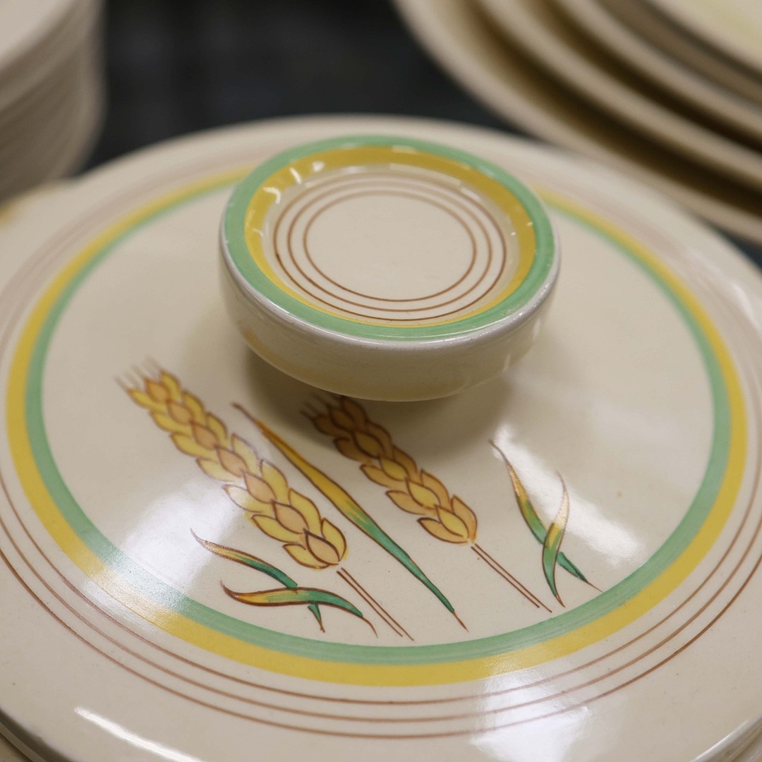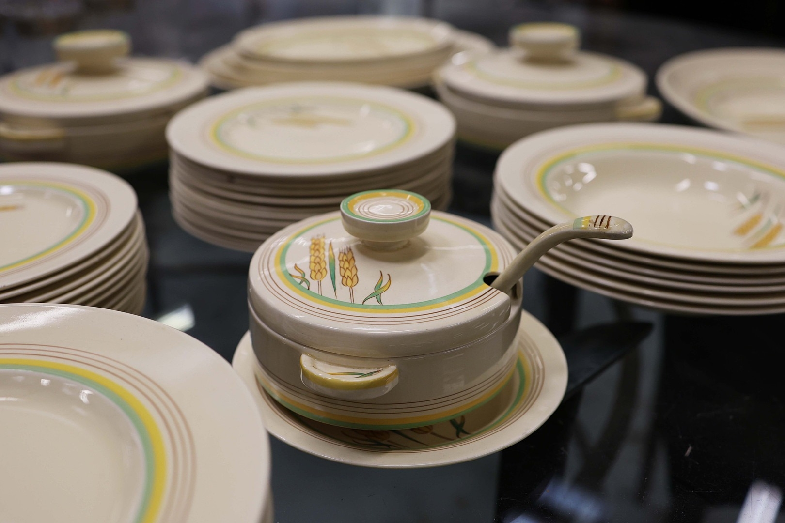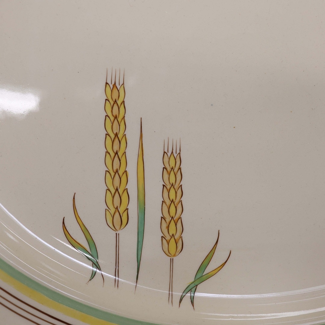 A CLARICE CLIFF 'WHEAT' PART DINNER SERVICE. 1930s, comprising eleven dinner plates, twelve breakfast plates, twelve side plates, twelve soup dishes, two soup tureens and stands, with ladles, two vegetable tureens, graduated meat plates, some stamped to bases with registration numbers '748856', (Q).