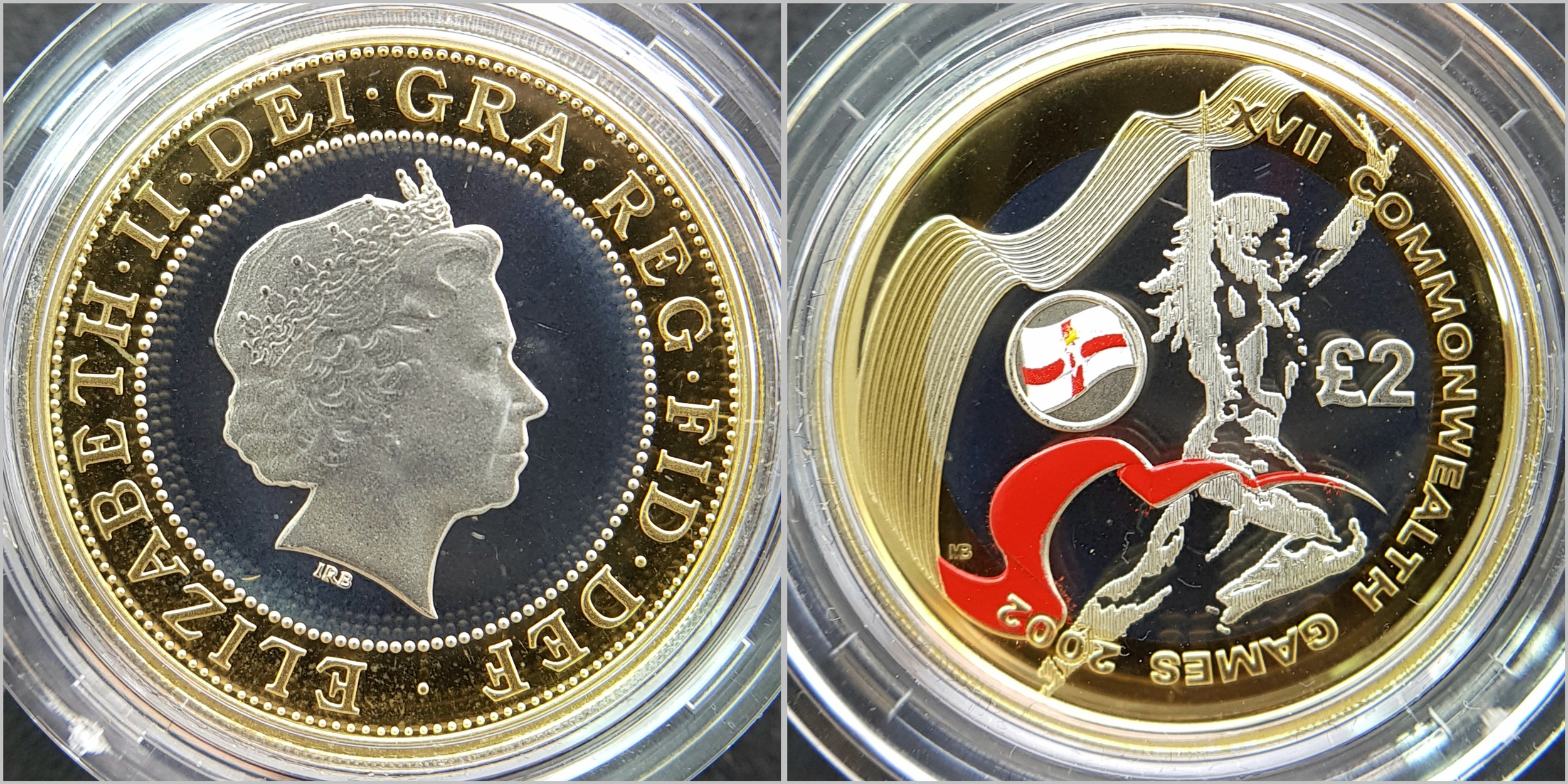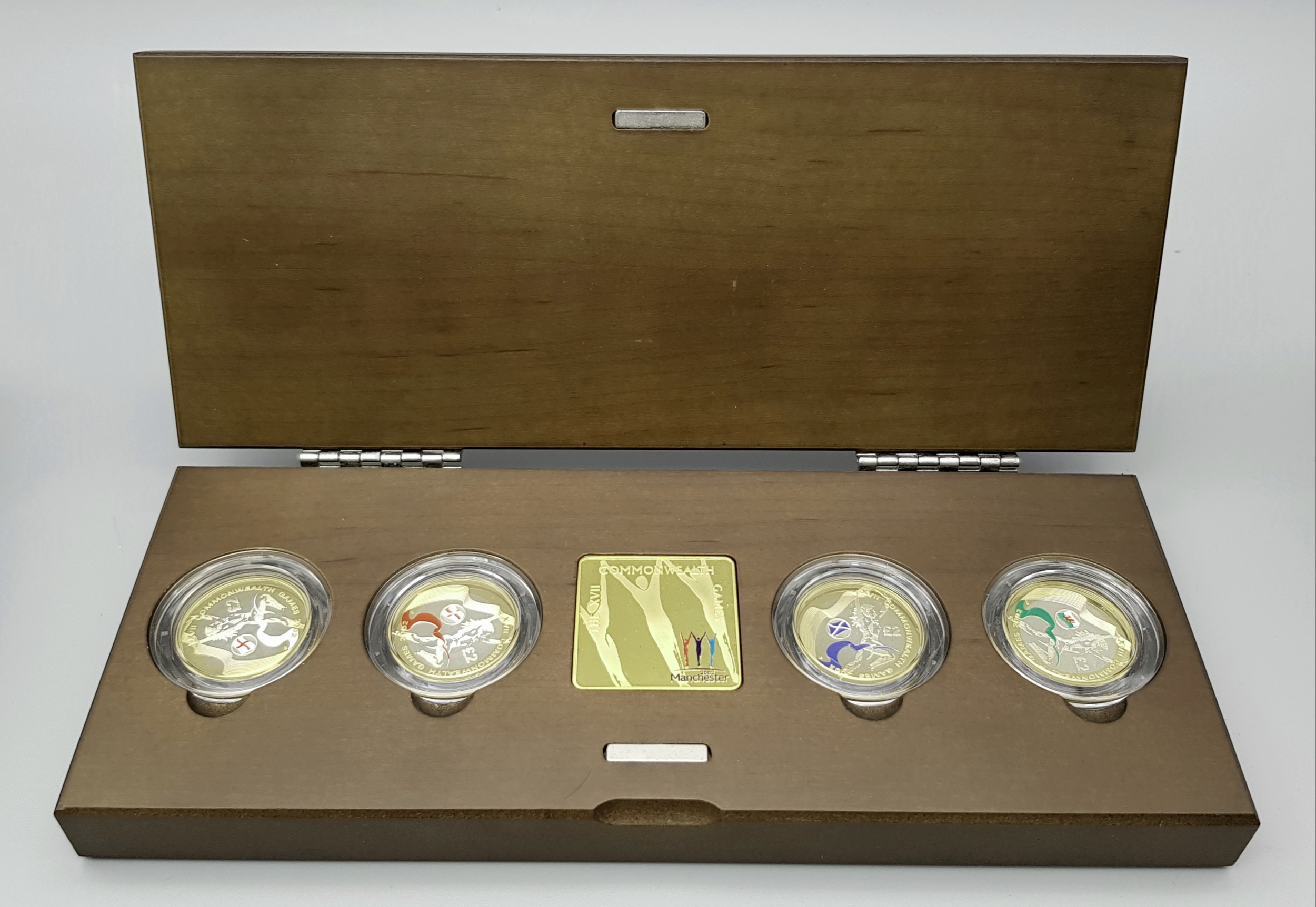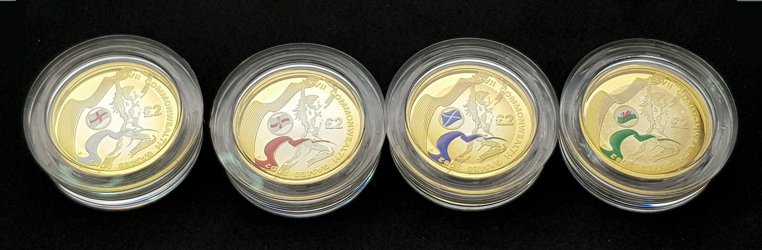 The Official Commonwealth Games Piedfort Silver Proof Four-Coin Collection. This collection contains four United Kingdom silver proof Piedfort two-pound coins. Each weighing 24g, the outer ring being fine gold plated. 92g total weight. Comes with a certificate of authenticity and presentation case. In excellent condition. A wonderful coin collectible or gift to hand down to loved ones.