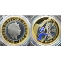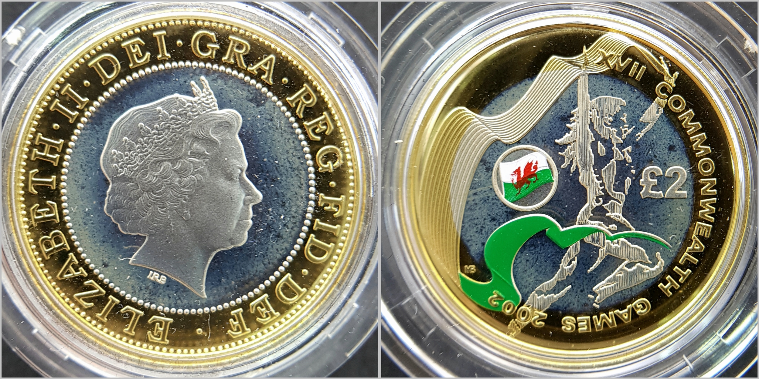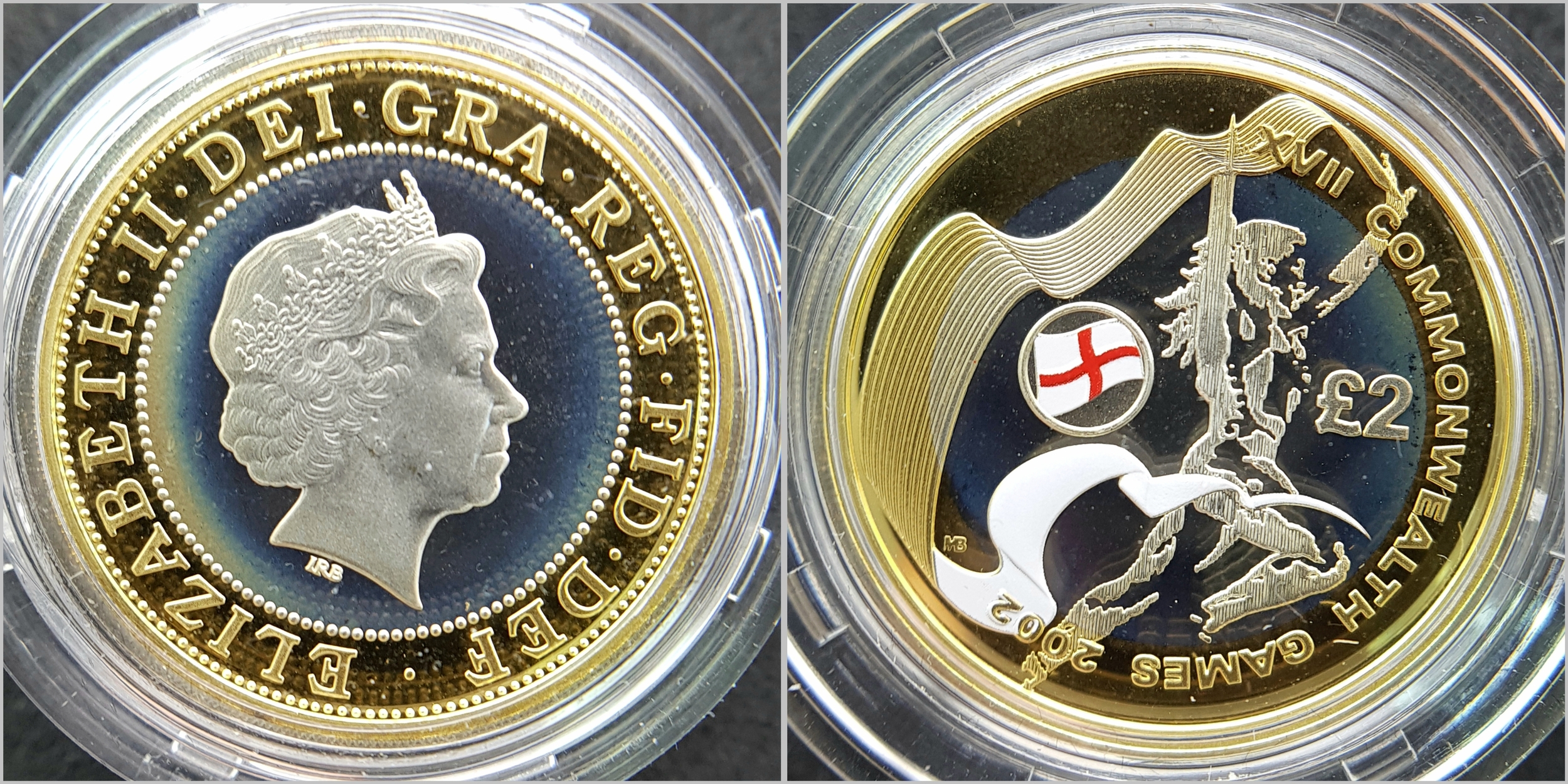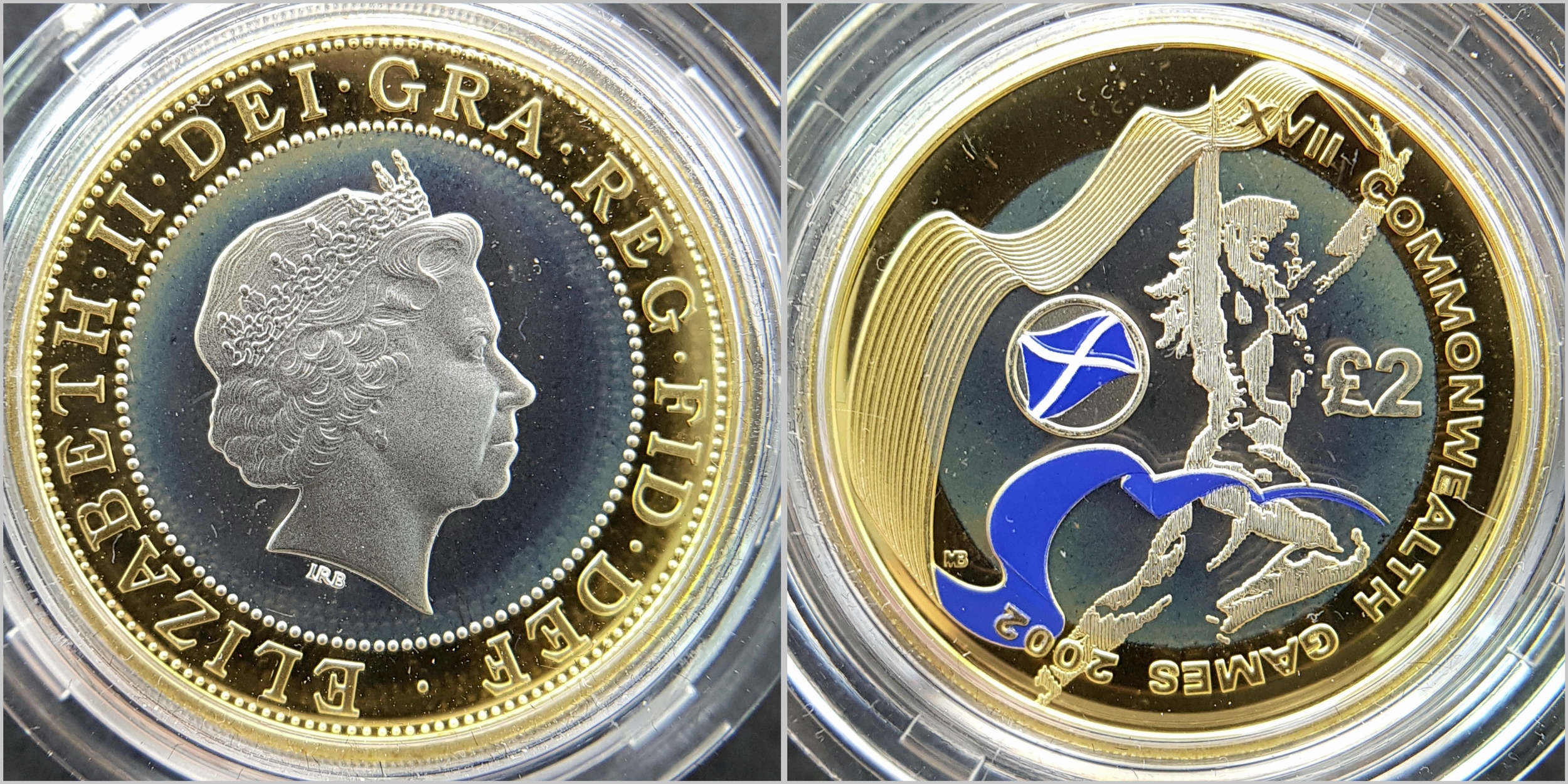 The Official Commonwealth Games Piedfort Silver Proof Four-Coin Collection. This collection contains four United Kingdom silver proof Piedfort two-pound coins. Each weighing 24g, the outer ring being fine gold plated. 92g total weight. Comes with a certificate of authenticity and presentation case. In excellent condition. A wonderful coin collectible or gift to hand down to loved ones.