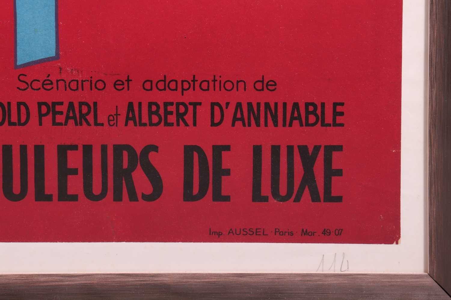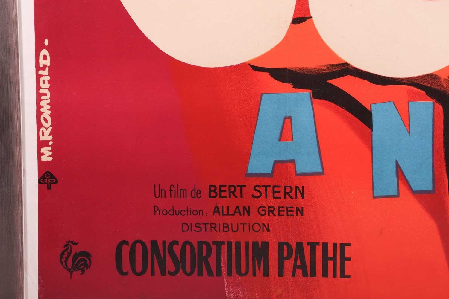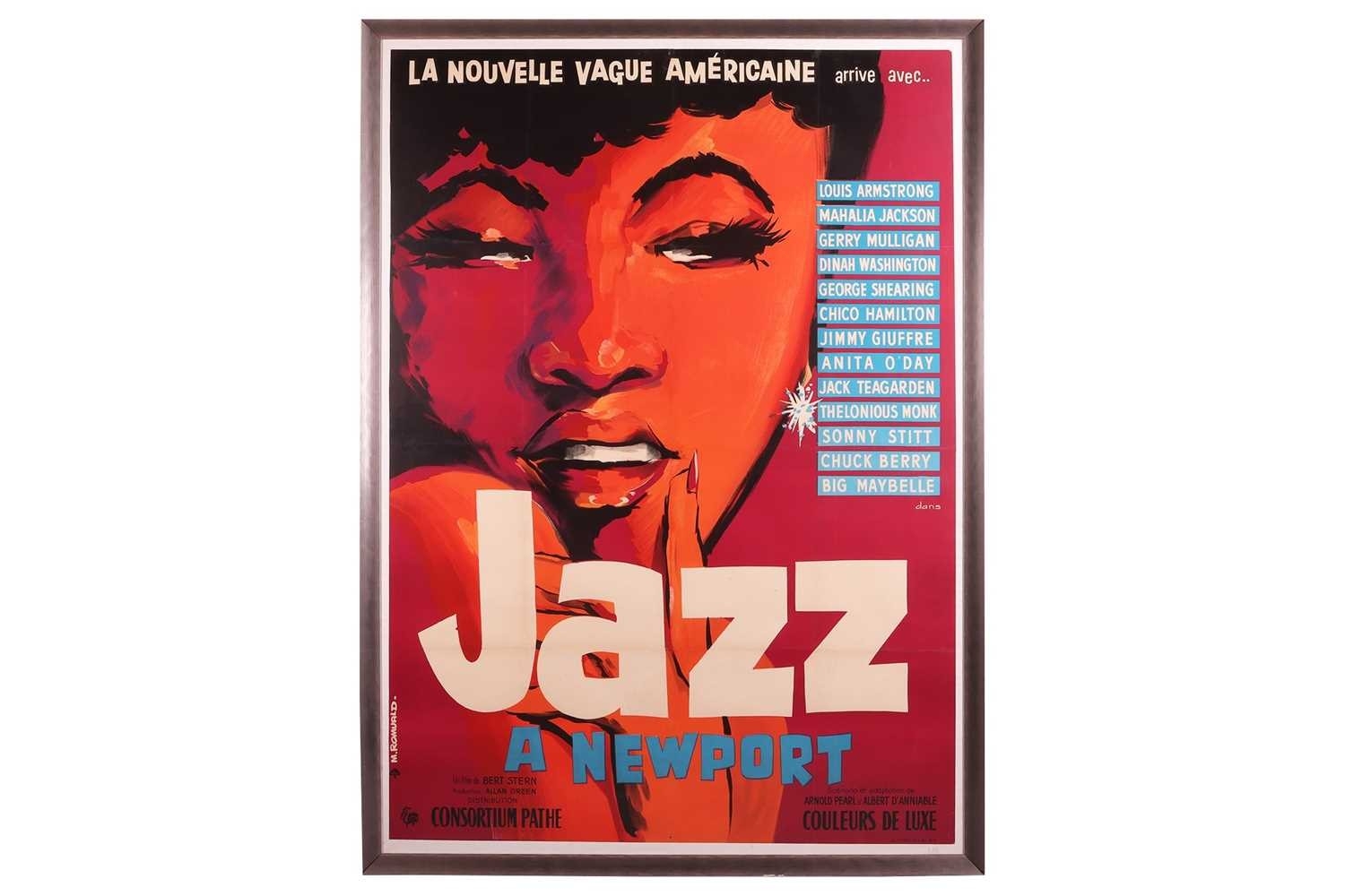 'Jazz a Newport', a large original French poster, designed by M. Romauld, from the film of the 1958 Newport Jazz Festival, which featured artists such as Louis Armstrong, Dinah Washington, Chuck Berry, Thelonious Monk and others, the poster 160 cm x 113 cm, framed (174 x 127 cm). Fold creases evident, with pinholes to corners, but colours appear good. No obvious damage