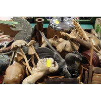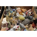 A TRAY OF CERAMICS TO INCLUDE NOVELTY CERAMIC BIRD BELLS ETC