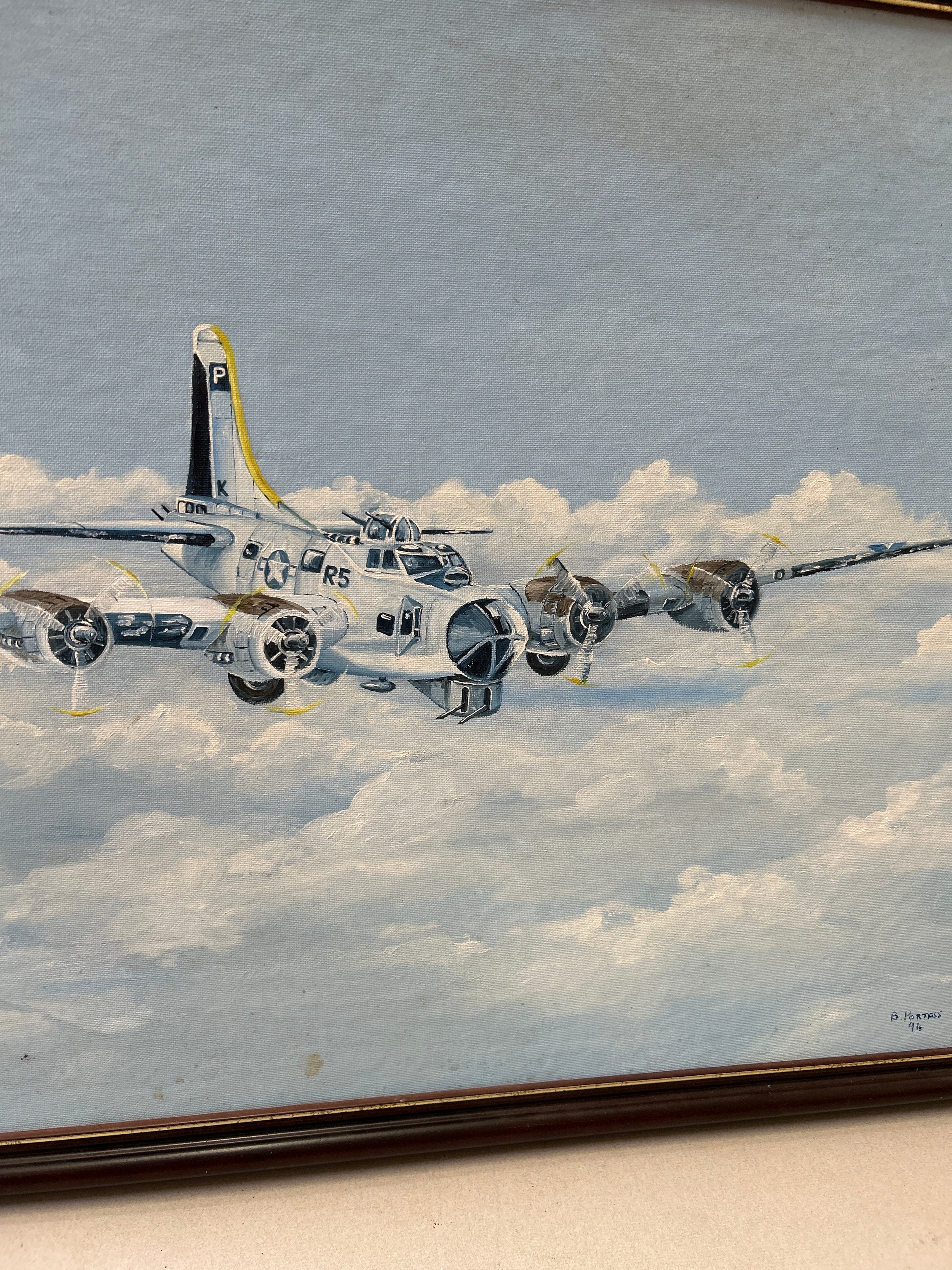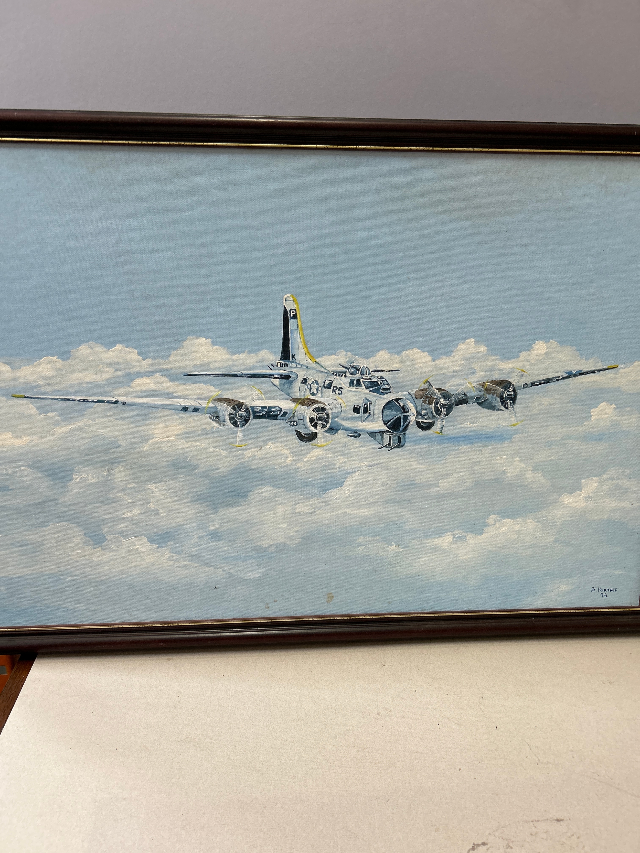 An original acrylic on canvas of an American B17 Flying Fortress plane flying above the clouds - Signed B Portass 1994. 73cm x 50cm