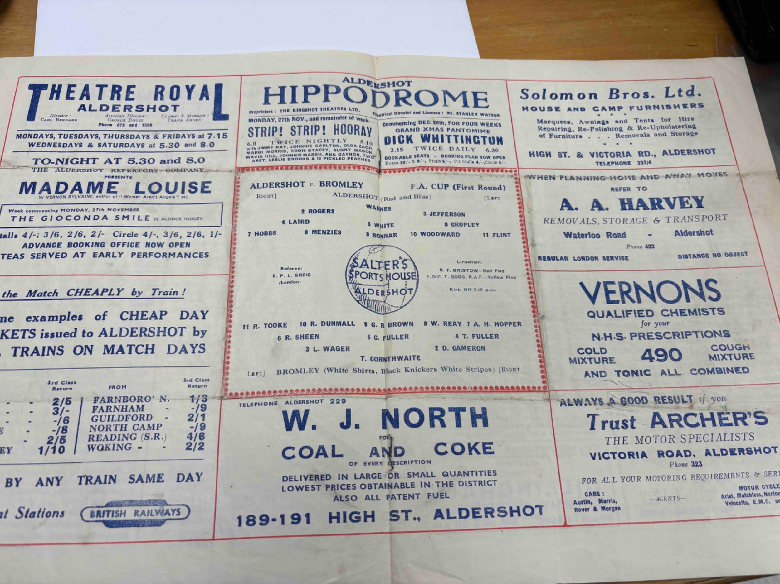 1950/51 Aldershot v Bromley, FA Cup. Slight tears. Pen marks on cover.
