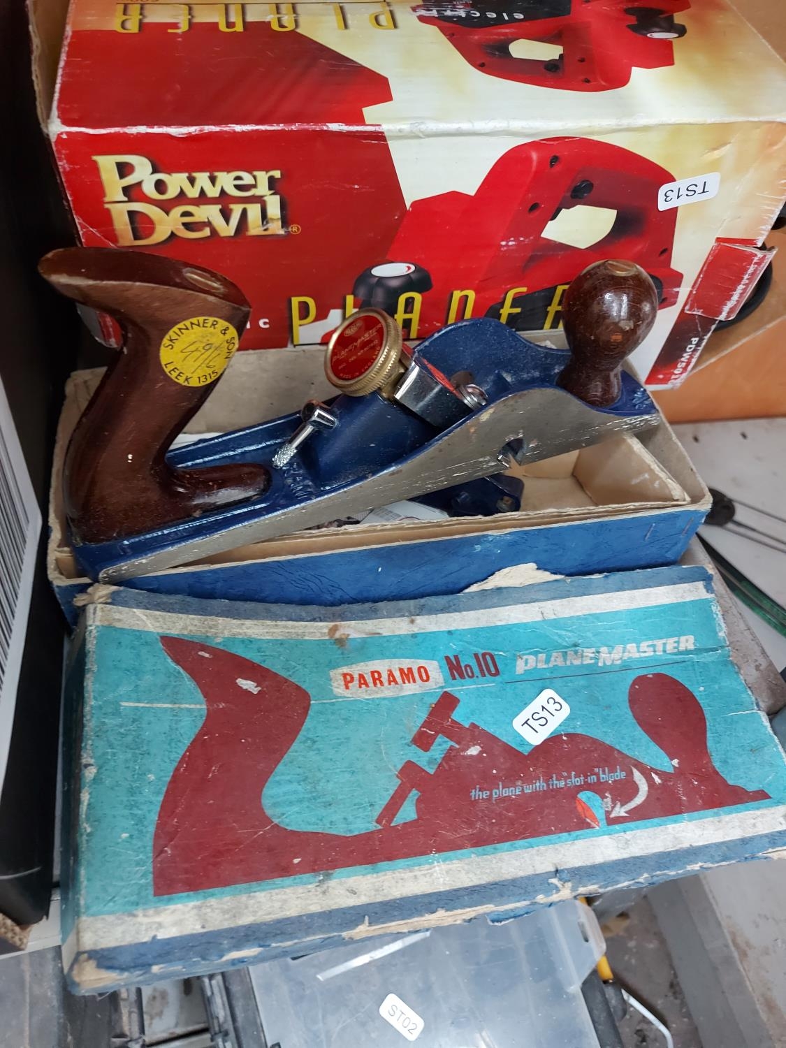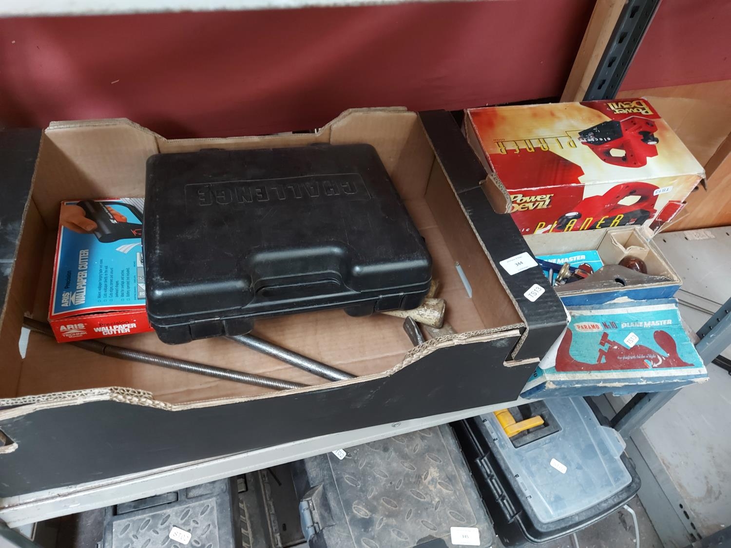 A mixed lot to include a boxed Paramo No.10 wood plane, cased Challenge electric jigsaw, claw hammer etc.