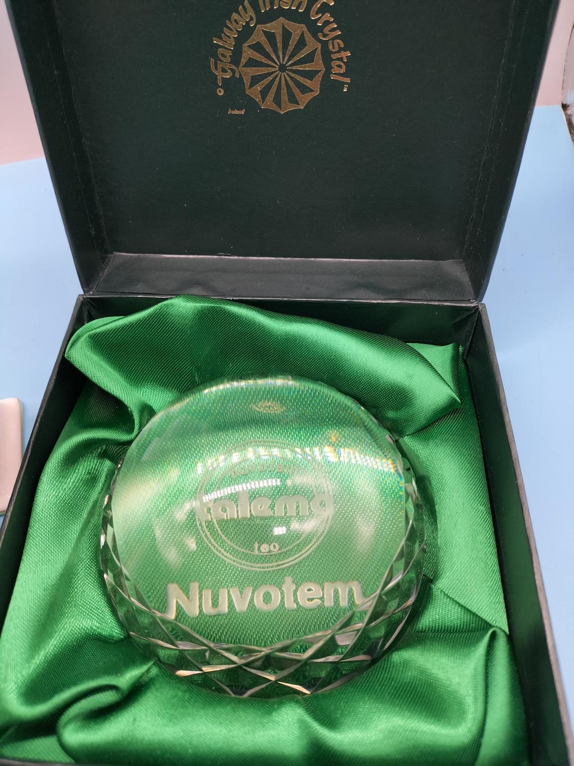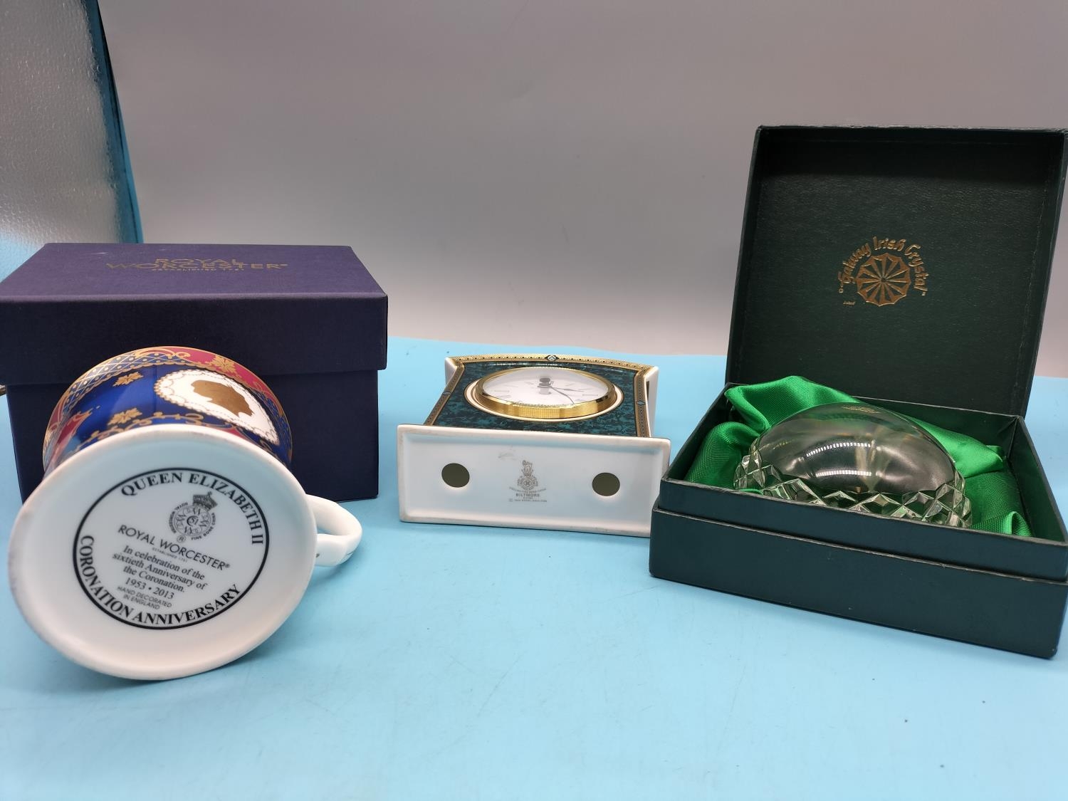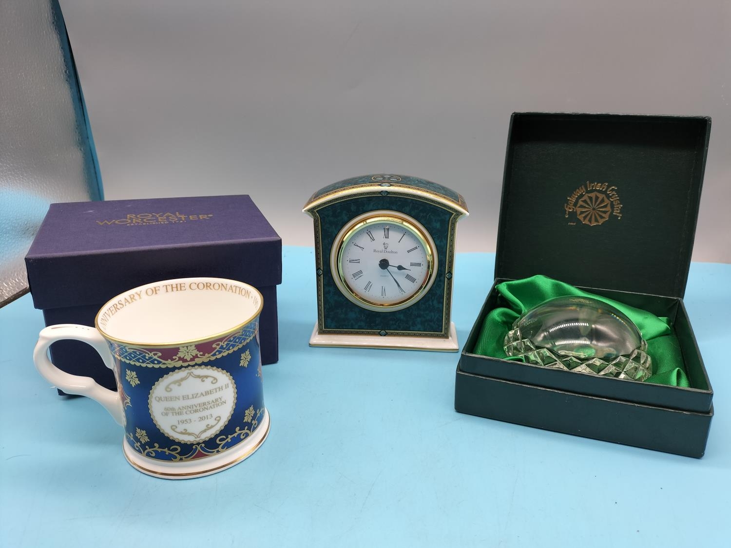 Galway Crystal Glass Paperweight (Boxed), Royal Doulton 'Baltimore' Clock plus Royal Worcester Queen Elizabeth II Coronation Anniversary Cup (boxed).