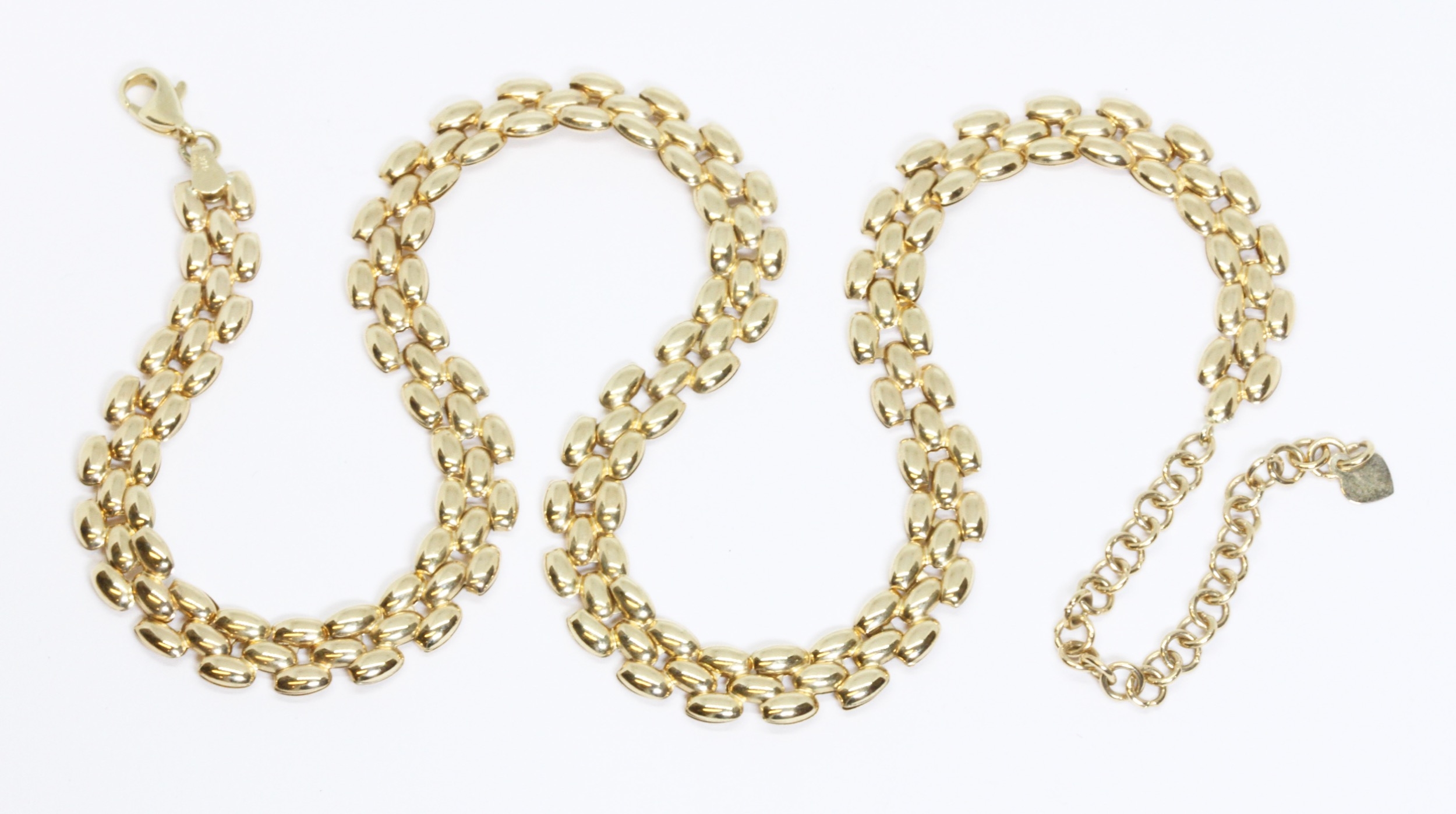 A 9ct gold rice bead link necklace, convention marks, length 52cm to 62cm, weight 10.2g.