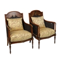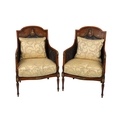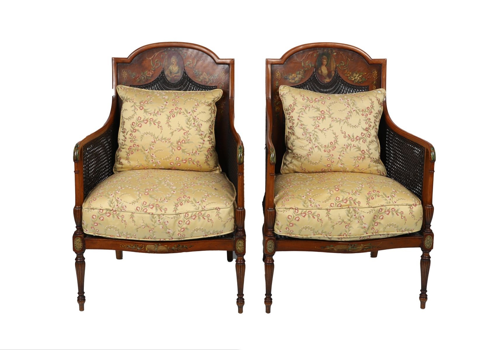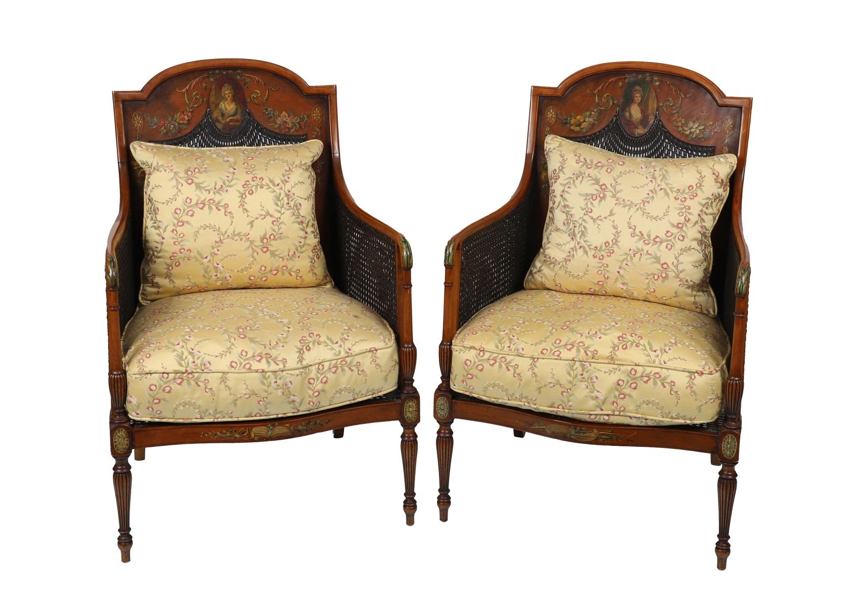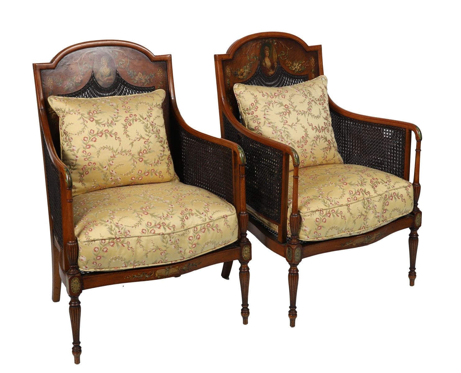 PAIR OF 19TH-CENTURY SATINWOOD AND PAINTED BERGERE ARMCHAIRS