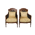 A charming pair of 19th-century satinwood bergère armchairs, each hand-painted with floral garlands and medallions depicting classical female portraits, with caned sides and back, and upholstered in floral-patterned fabric. Raised on fluted front legs with gilt rosette mounts.