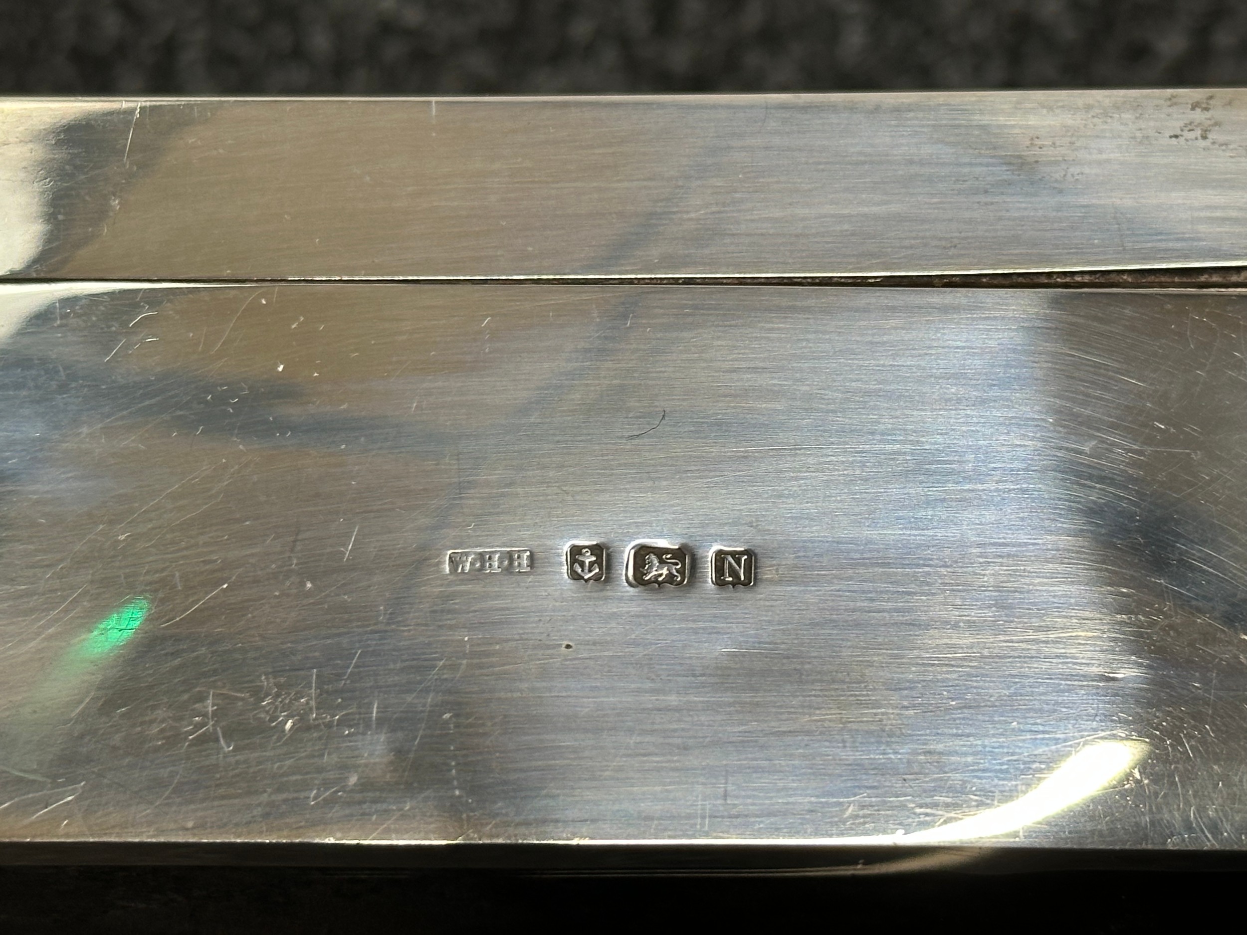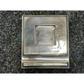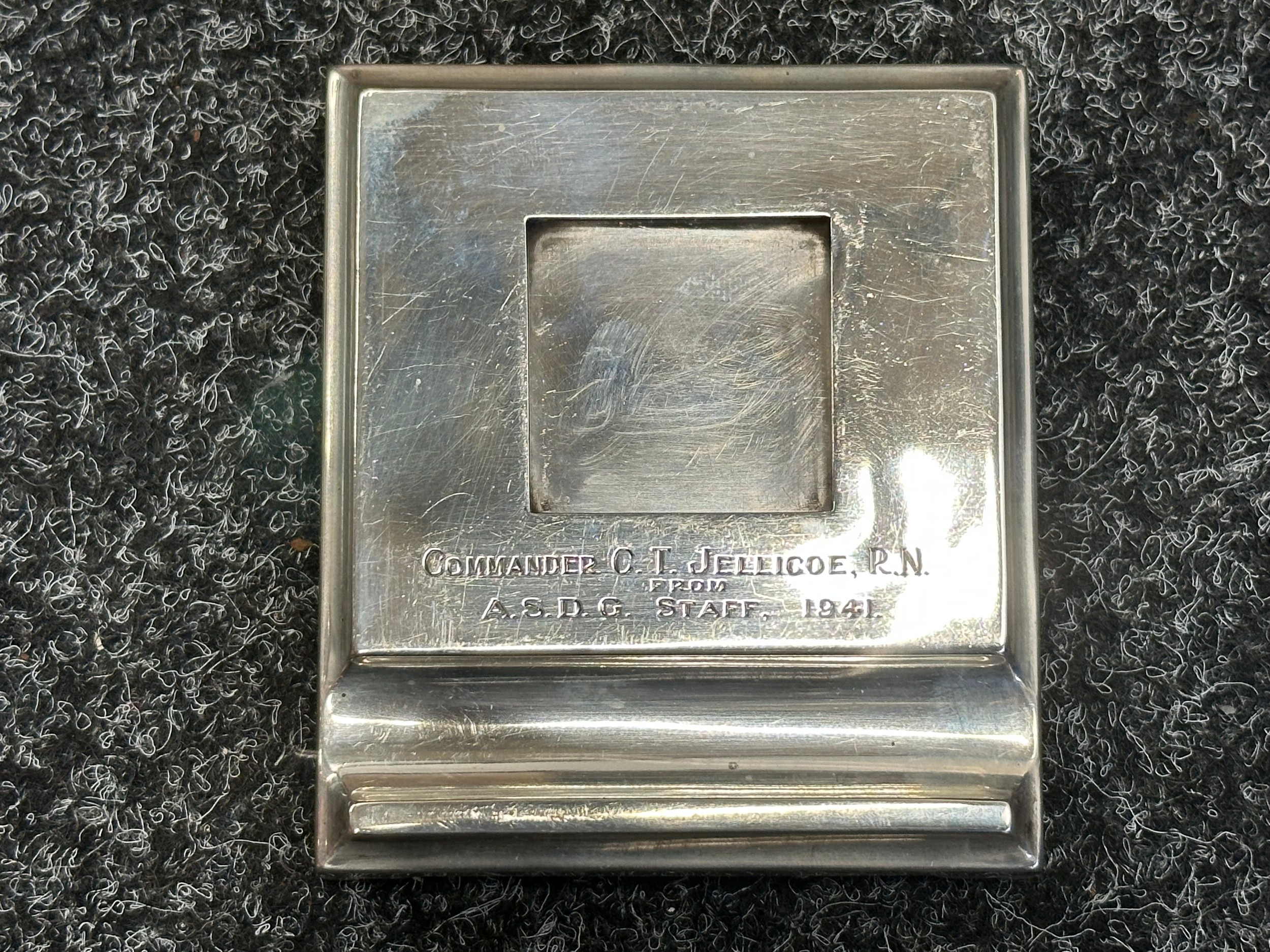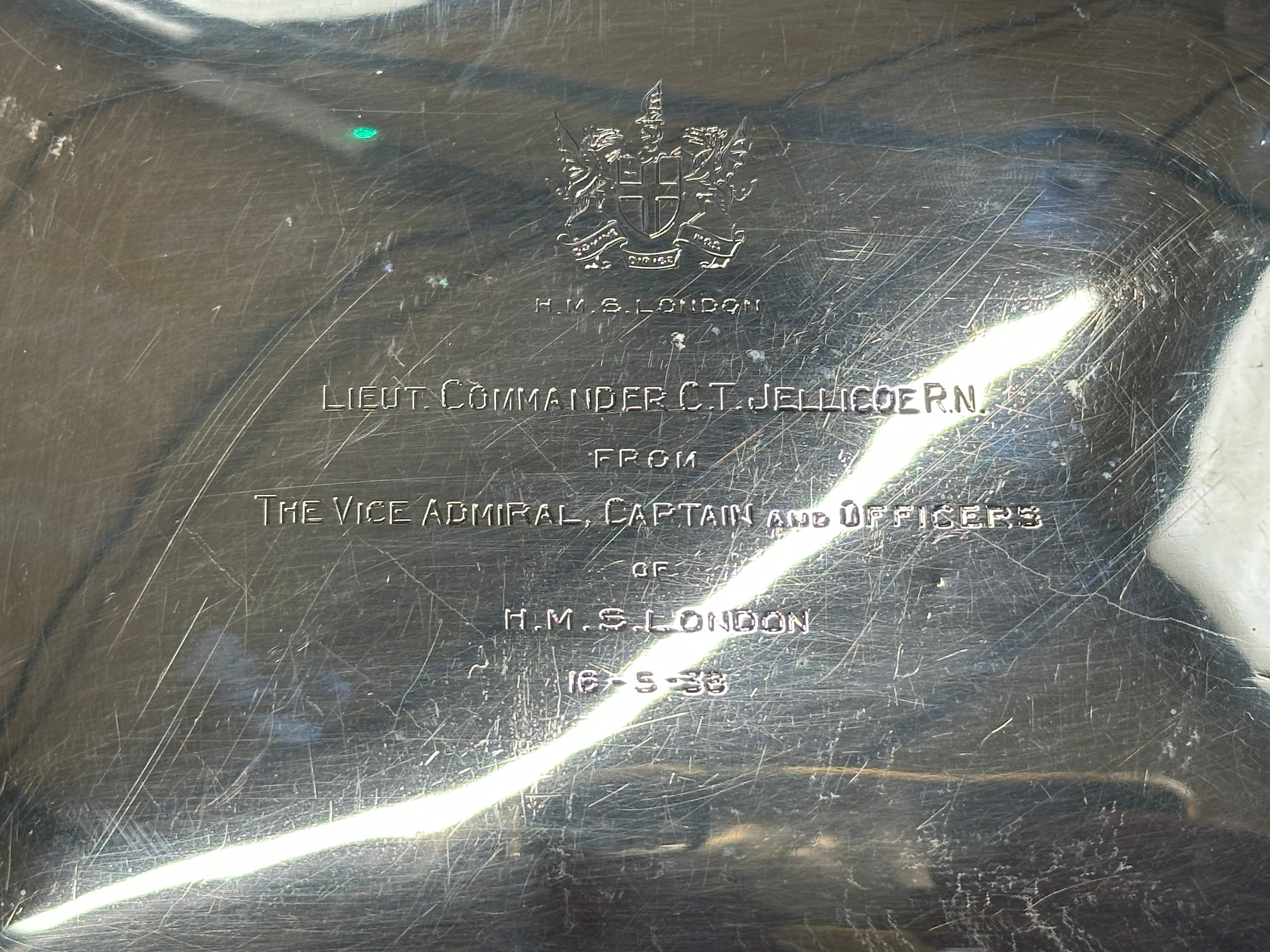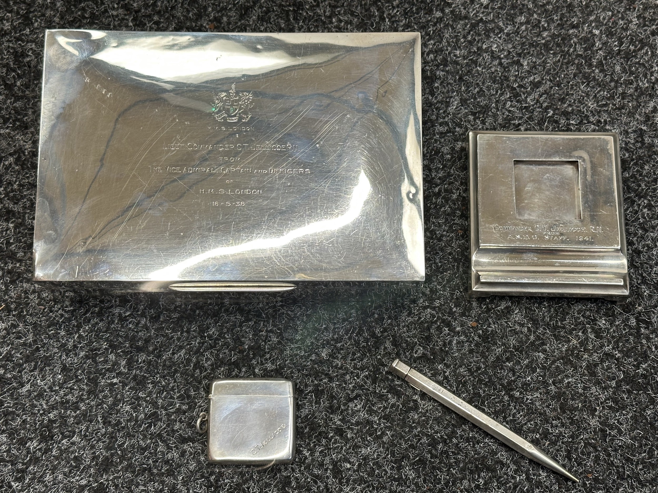 British Royal Navy Presentation Silver to Lieut Commander Christopher Theodore Jellicoe RN DSO, DSC and Bar (1903 - 1977) comprising of: Large desk cigarette box engraved with crest of HMS London and inscribed "Lieut Commander CT Jellicoe RN from the Vice Admiral, Captain and Officers of HMS London 16-5-38". Maker marked "WHH" and hallmarked Birmingham 1937. Size 138mm x 202mm x 62mm. Wood lined with two compartments. Gross weight 897g: Vesta Case engraved "CT Jellicoe", maker marked "B&S" Edinburgh hallmarked 1910: Inkwell stand engraved "Commander CT Jellicoe RN from ASDG Staff 1941" maker marked "W&H" hallmarked Birmingham 1935: Silver Propelling Pencil maker marked "JM & Co" date letter M 1947. Total weight on the three items 132g. Comes with some research regarding the officer. (4)