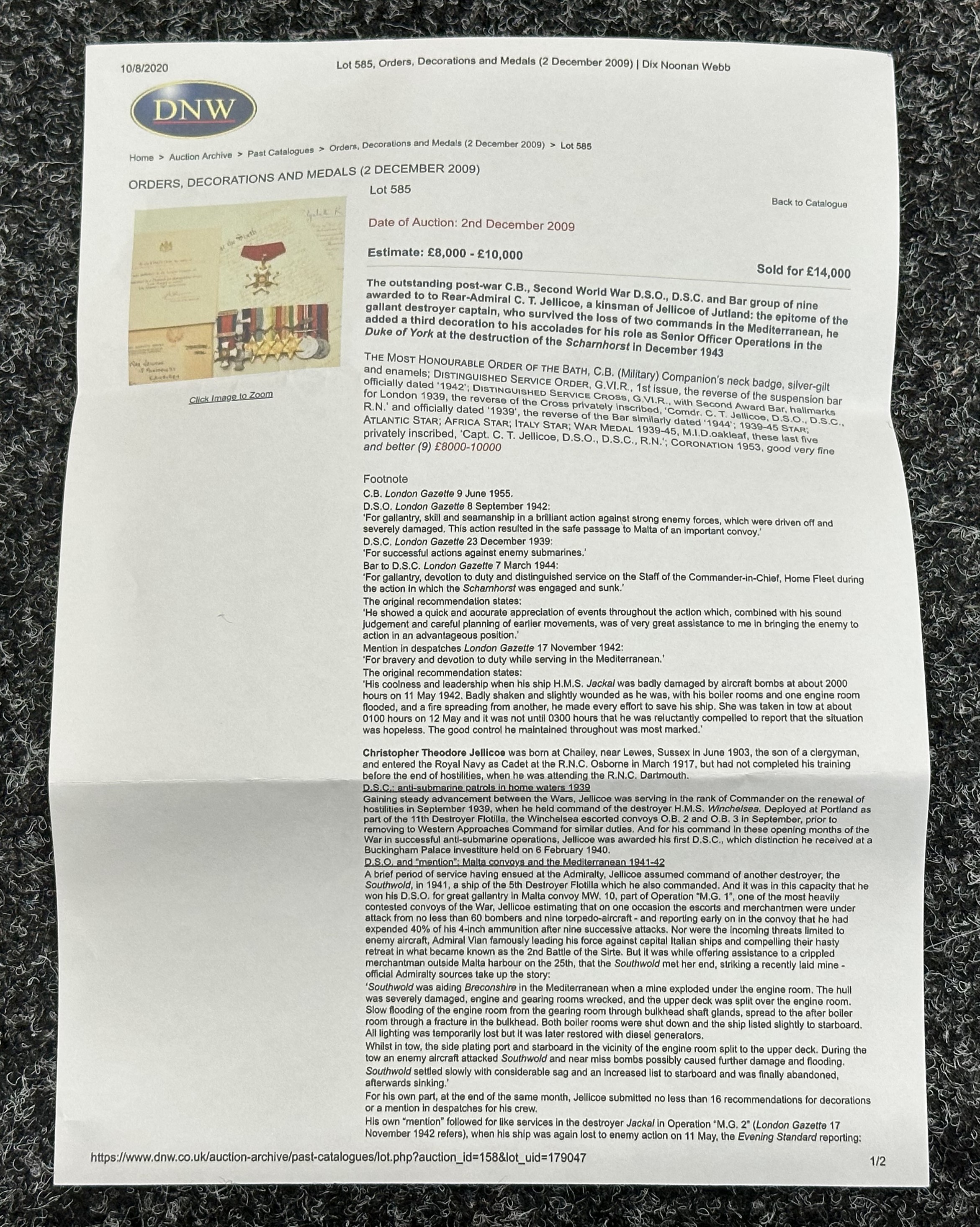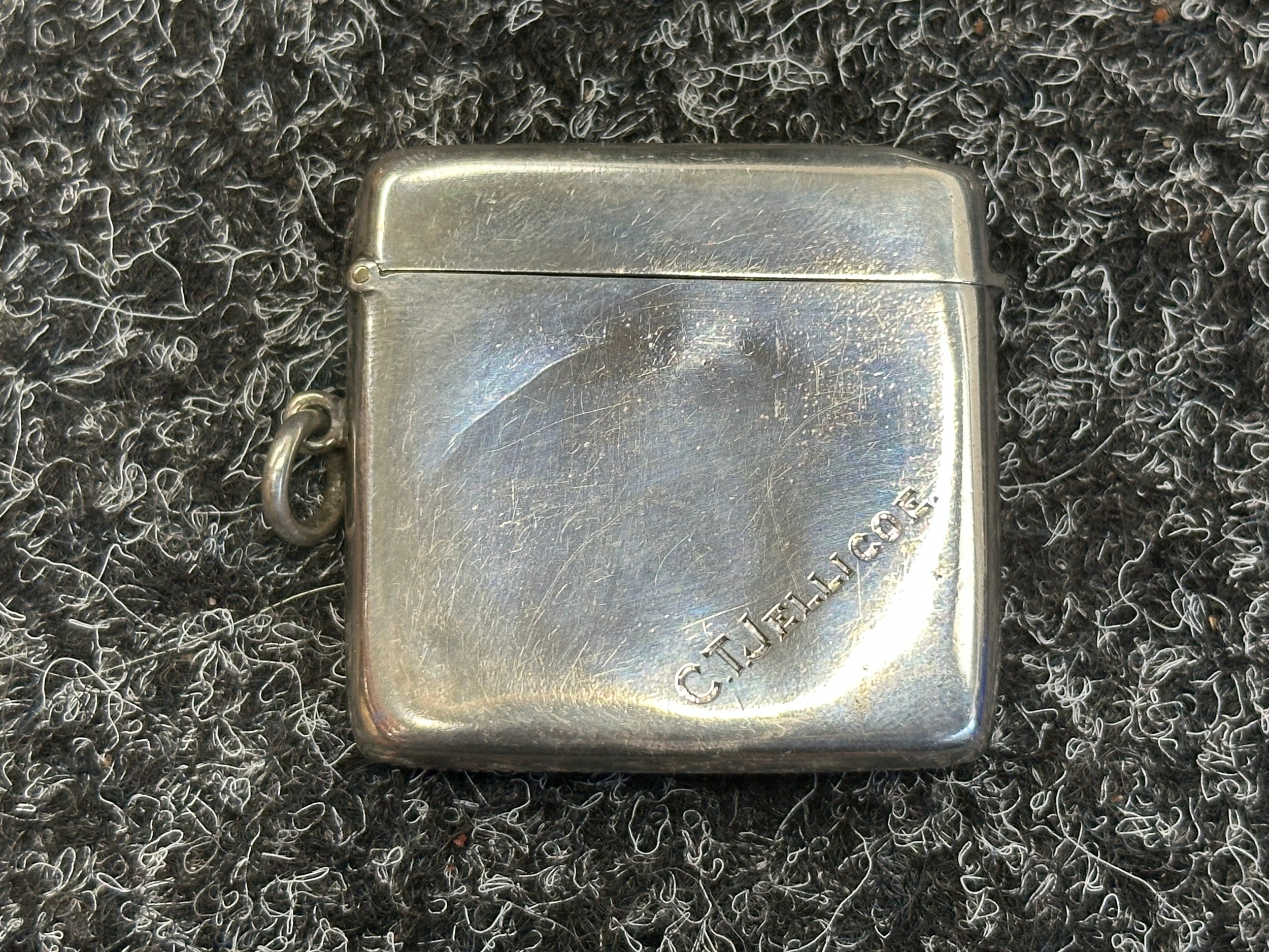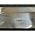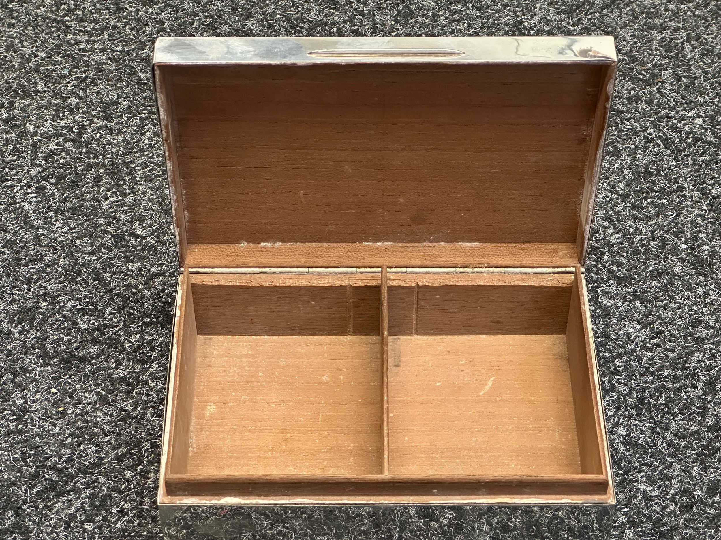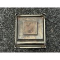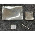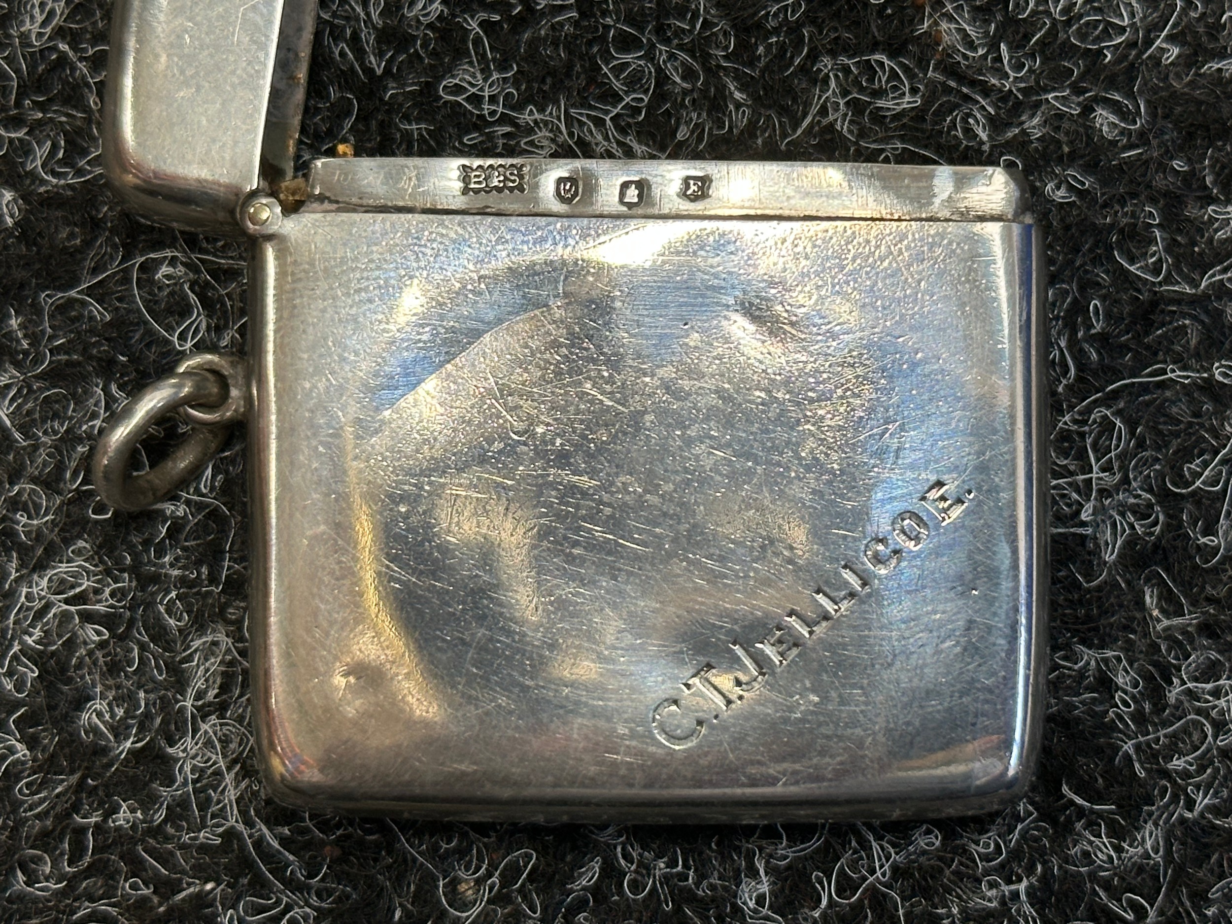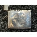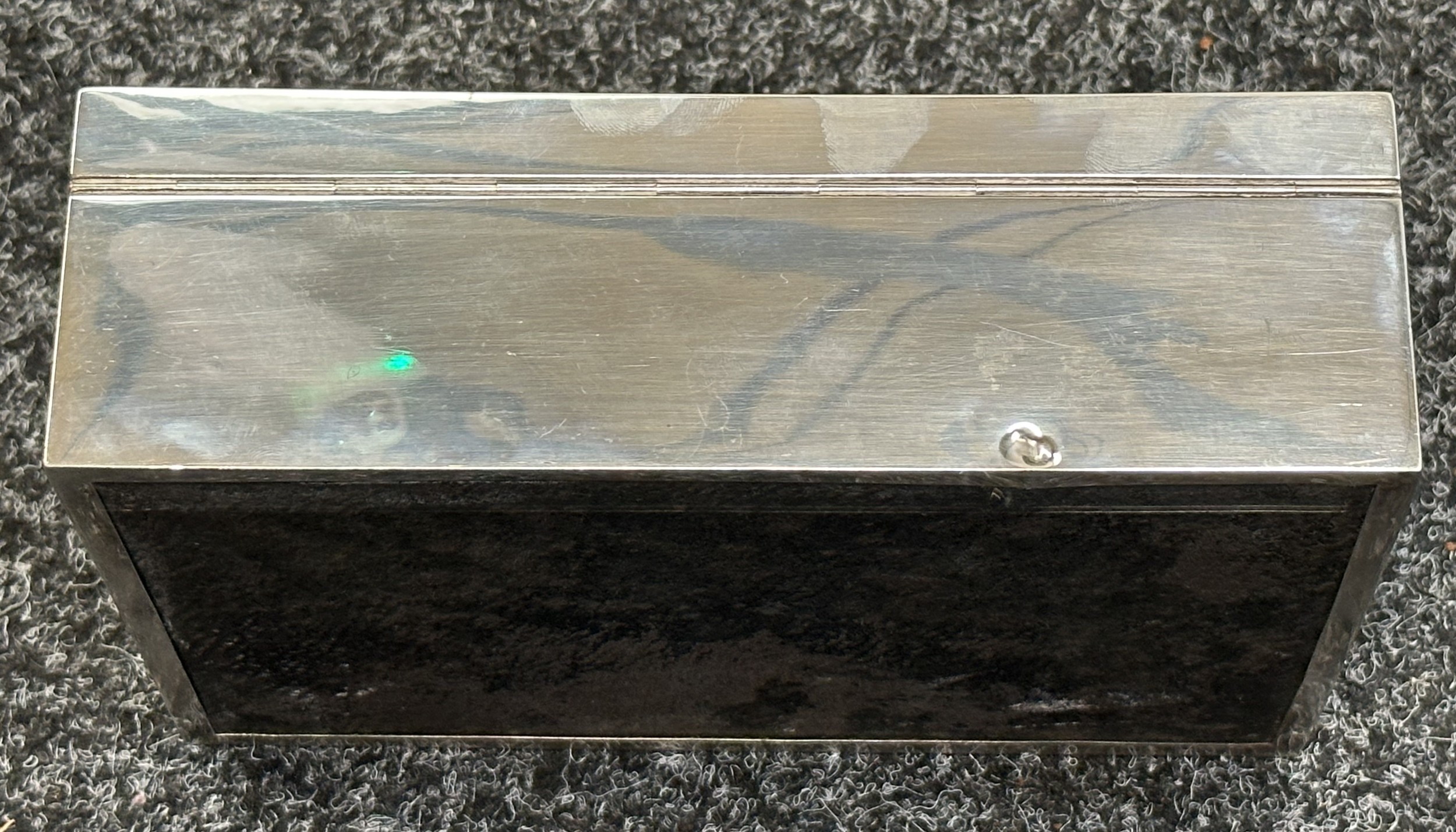 British Royal Navy Presentation Silver to Lieut Commander Christopher Theodore Jellicoe RN DSO, DSC and Bar (1903 - 1977) comprising of: Large desk cigarette box engraved with crest of HMS London and inscribed "Lieut Commander CT Jellicoe RN from the Vice Admiral, Captain and Officers of HMS London 16-5-38". Maker marked "WHH" and hallmarked Birmingham 1937. Size 138mm x 202mm x 62mm. Wood lined with two compartments. Gross weight 897g: Vesta Case engraved "CT Jellicoe", maker marked "B&S" Edinburgh hallmarked 1910: Inkwell stand engraved "Commander CT Jellicoe RN from ASDG Staff 1941" maker marked "W&H" hallmarked Birmingham 1935: Silver Propelling Pencil maker marked "JM & Co" date letter M 1947. Total weight on the three items 132g. Comes with some research regarding the officer. (4)
