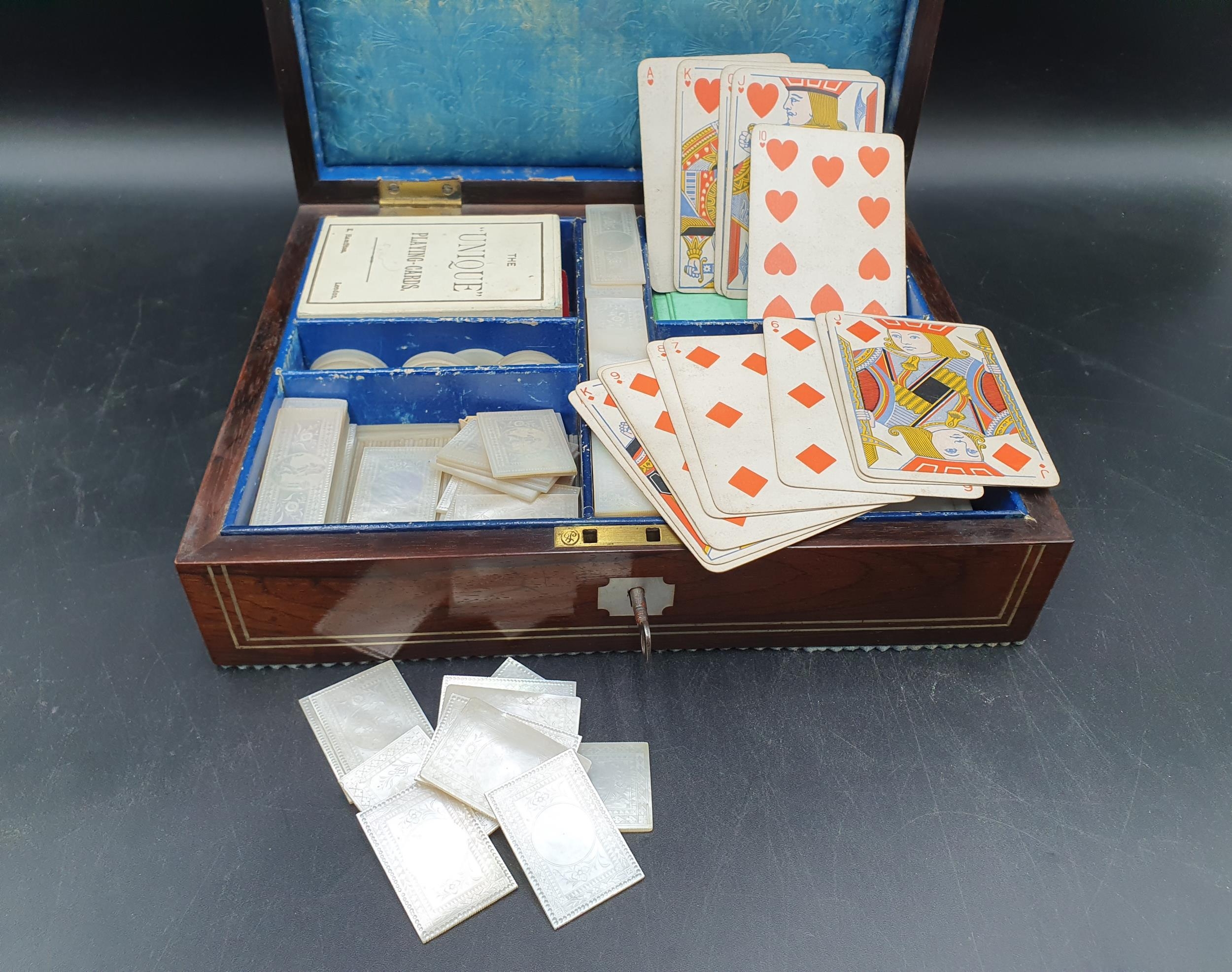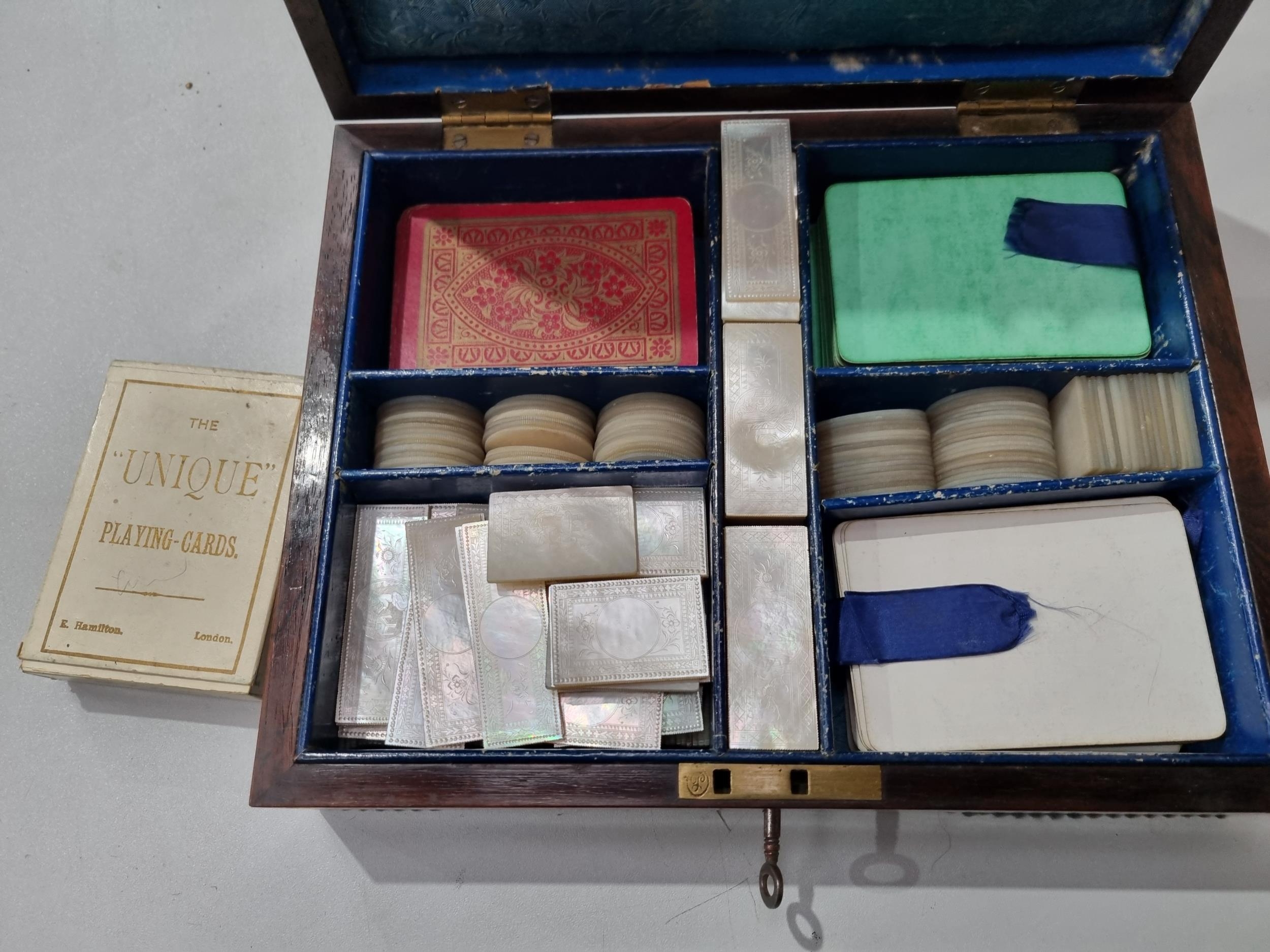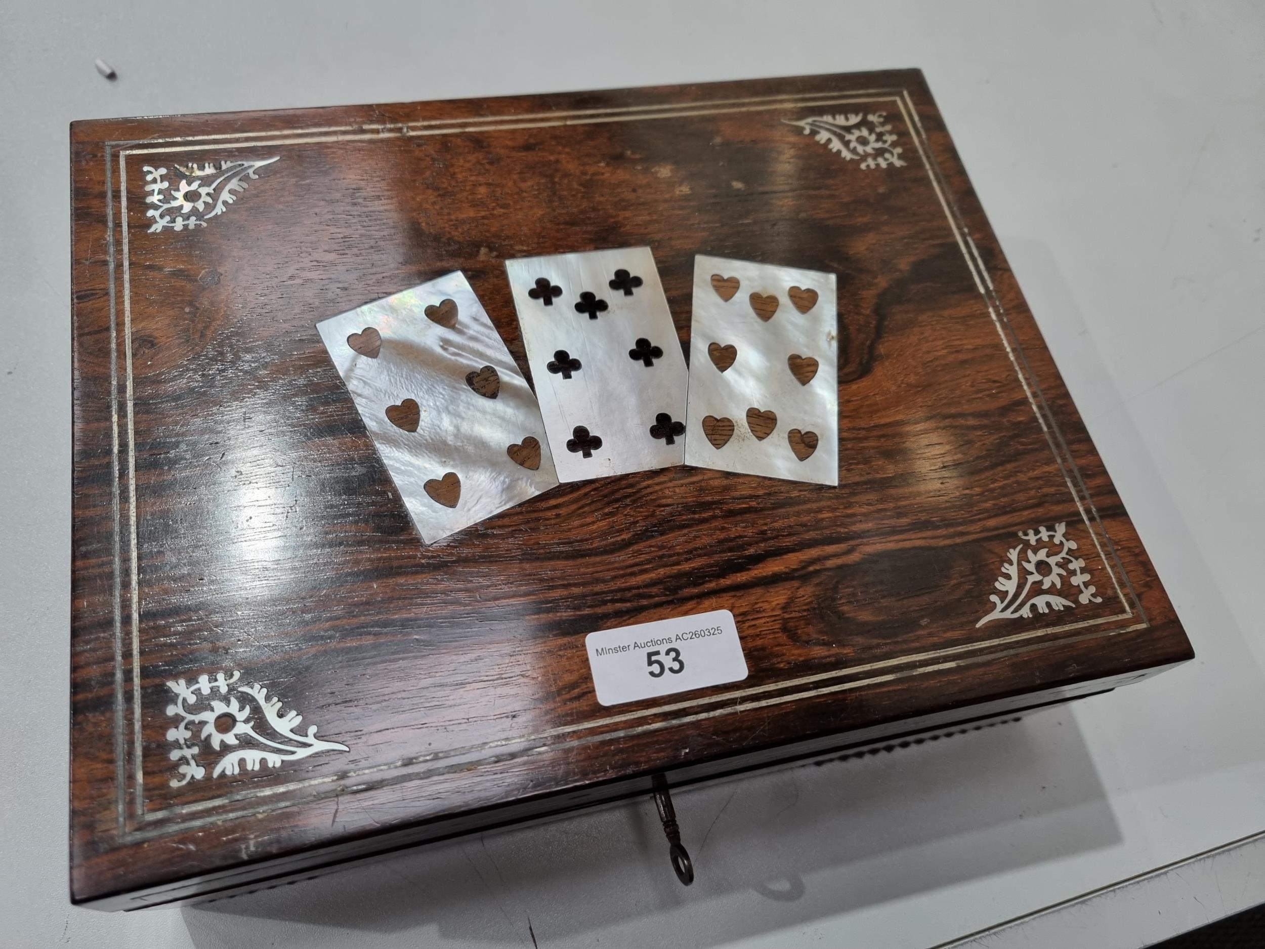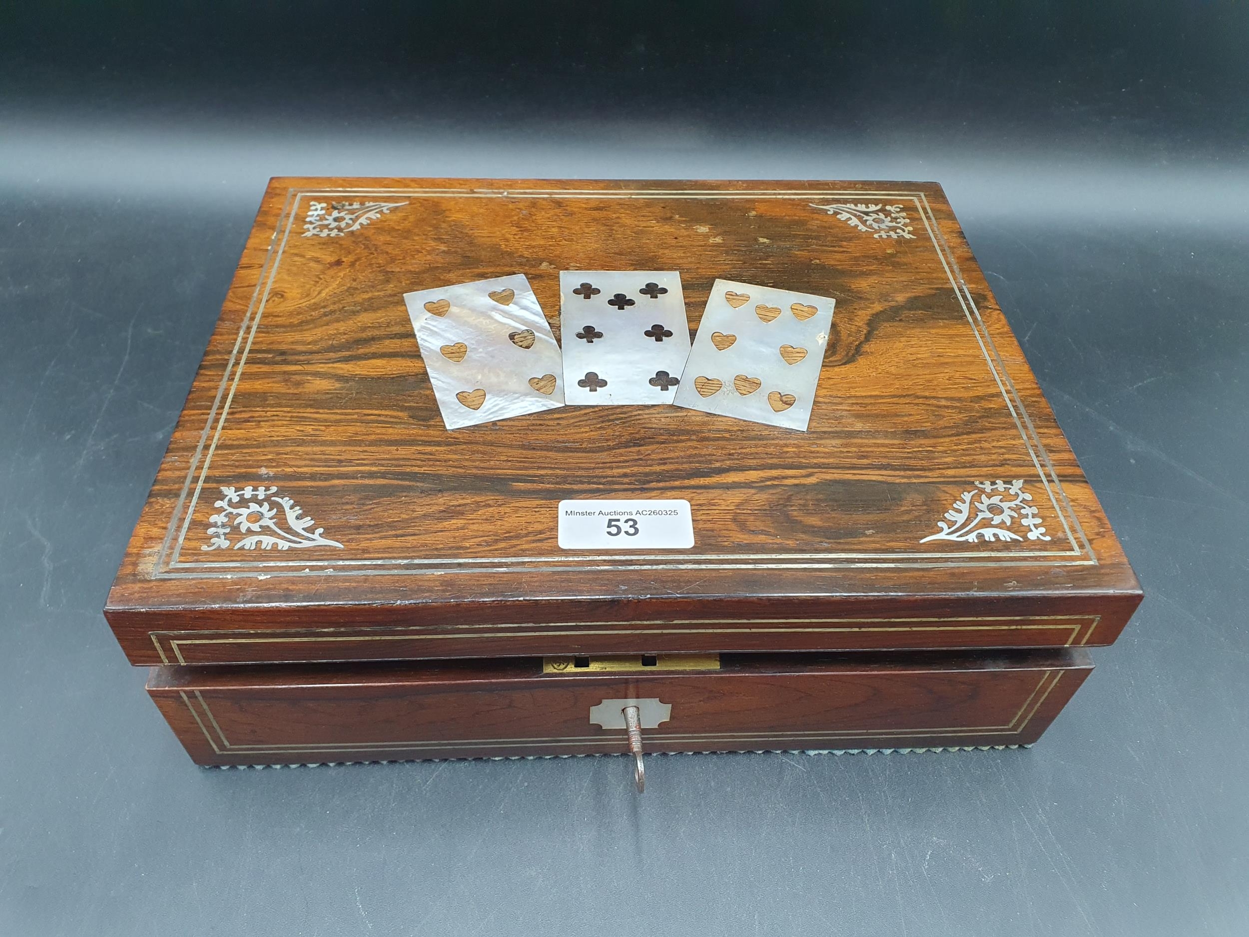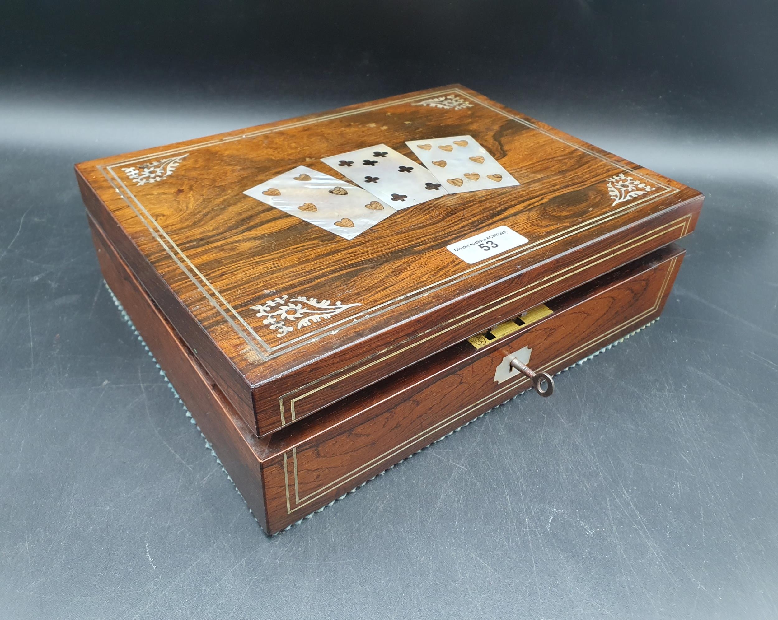 A 19th century rosewood Games Box with mother of pearl inlay to the lid depicting playing cards, containing circular and rectangular counters, vintage playing cards, etc, 10 x 8in (CAB)