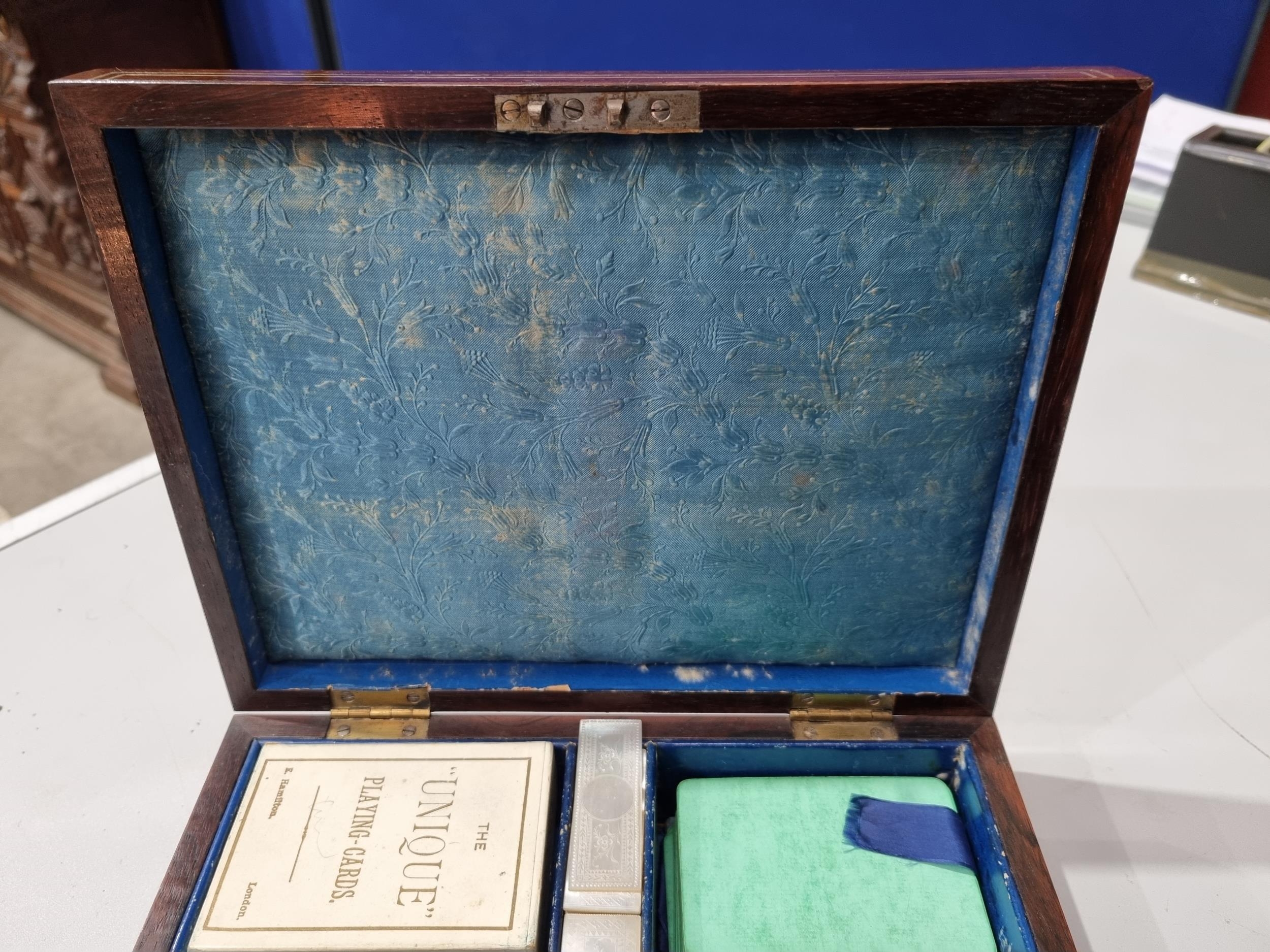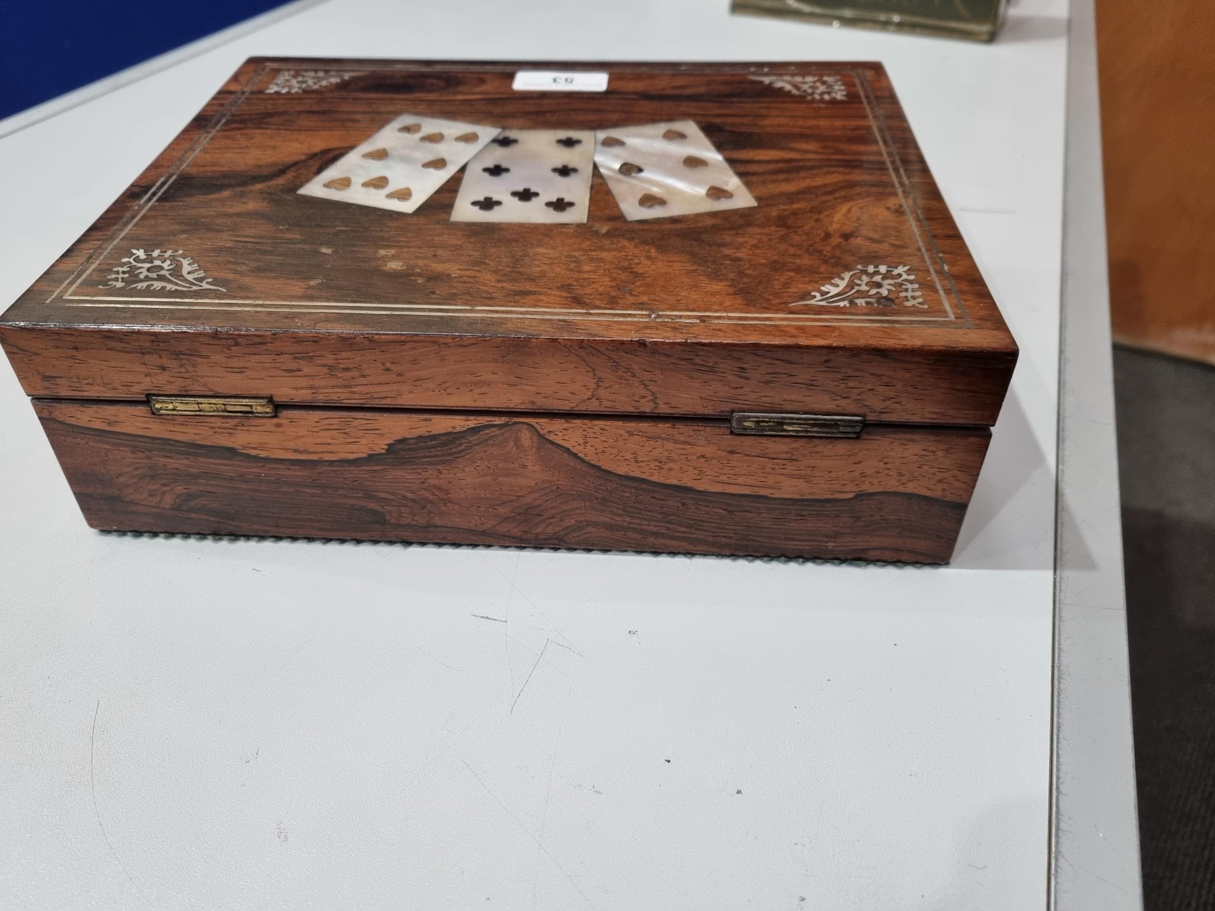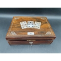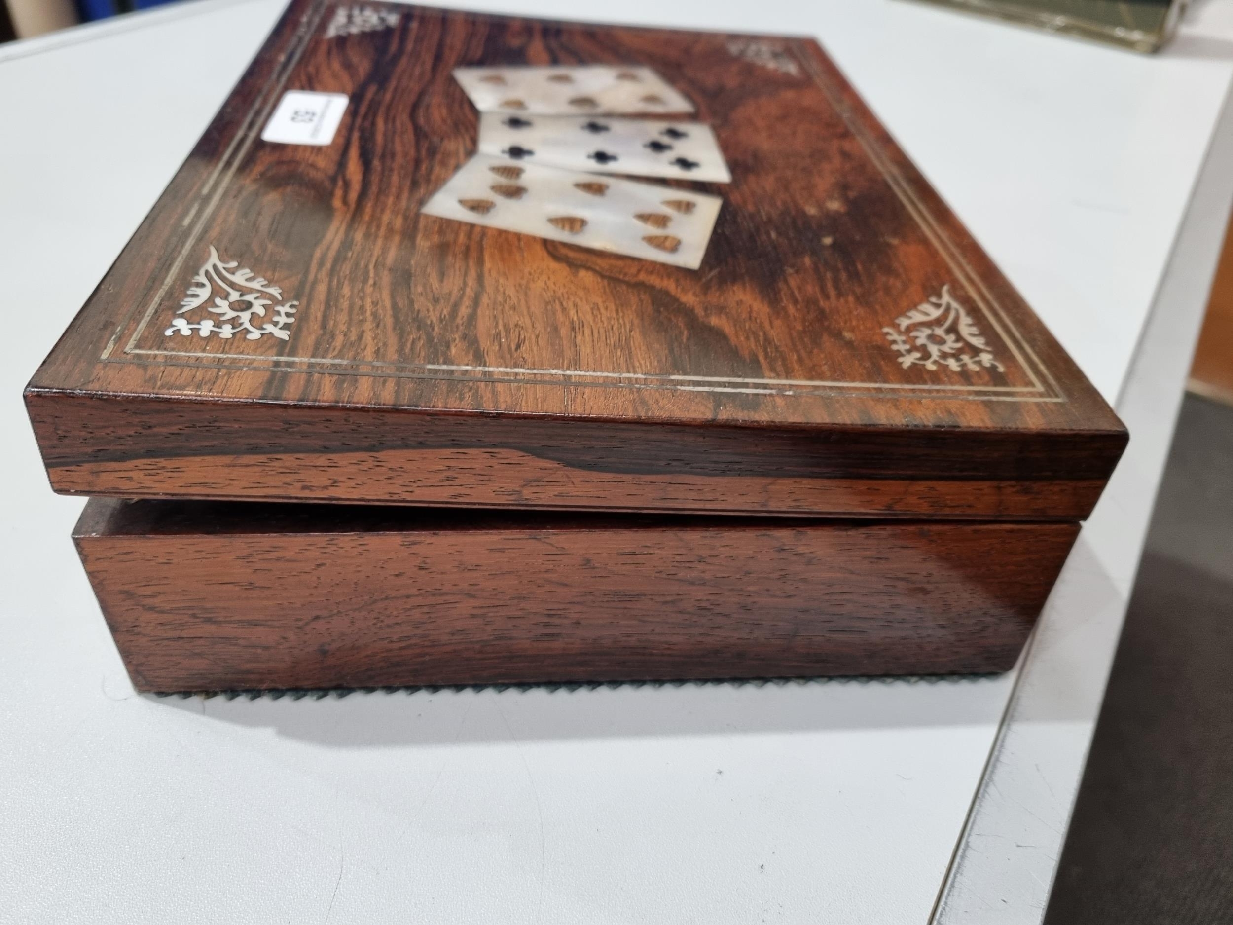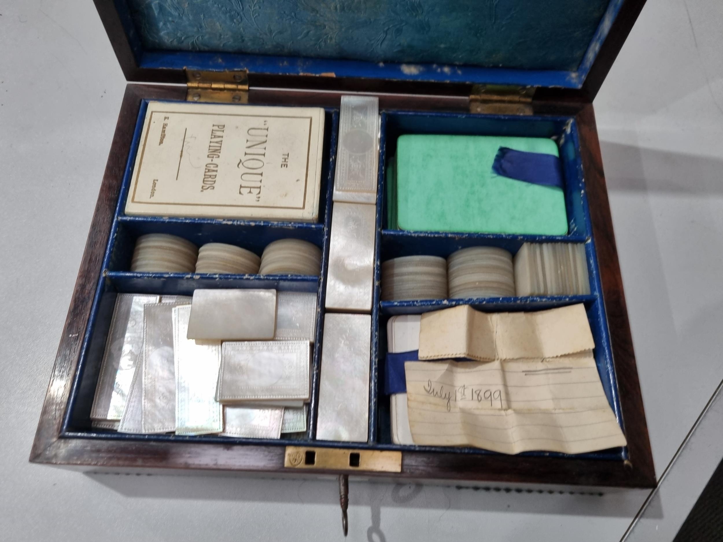 A 19th century rosewood Games Box with mother of pearl inlay to the lid depicting playing cards, containing circular and rectangular counters, vintage playing cards, etc, 10 x 8in (CAB)
