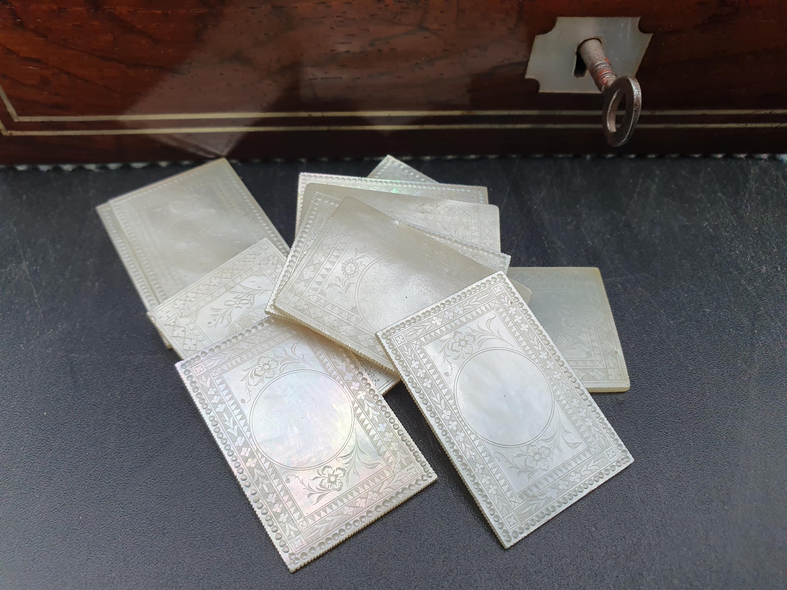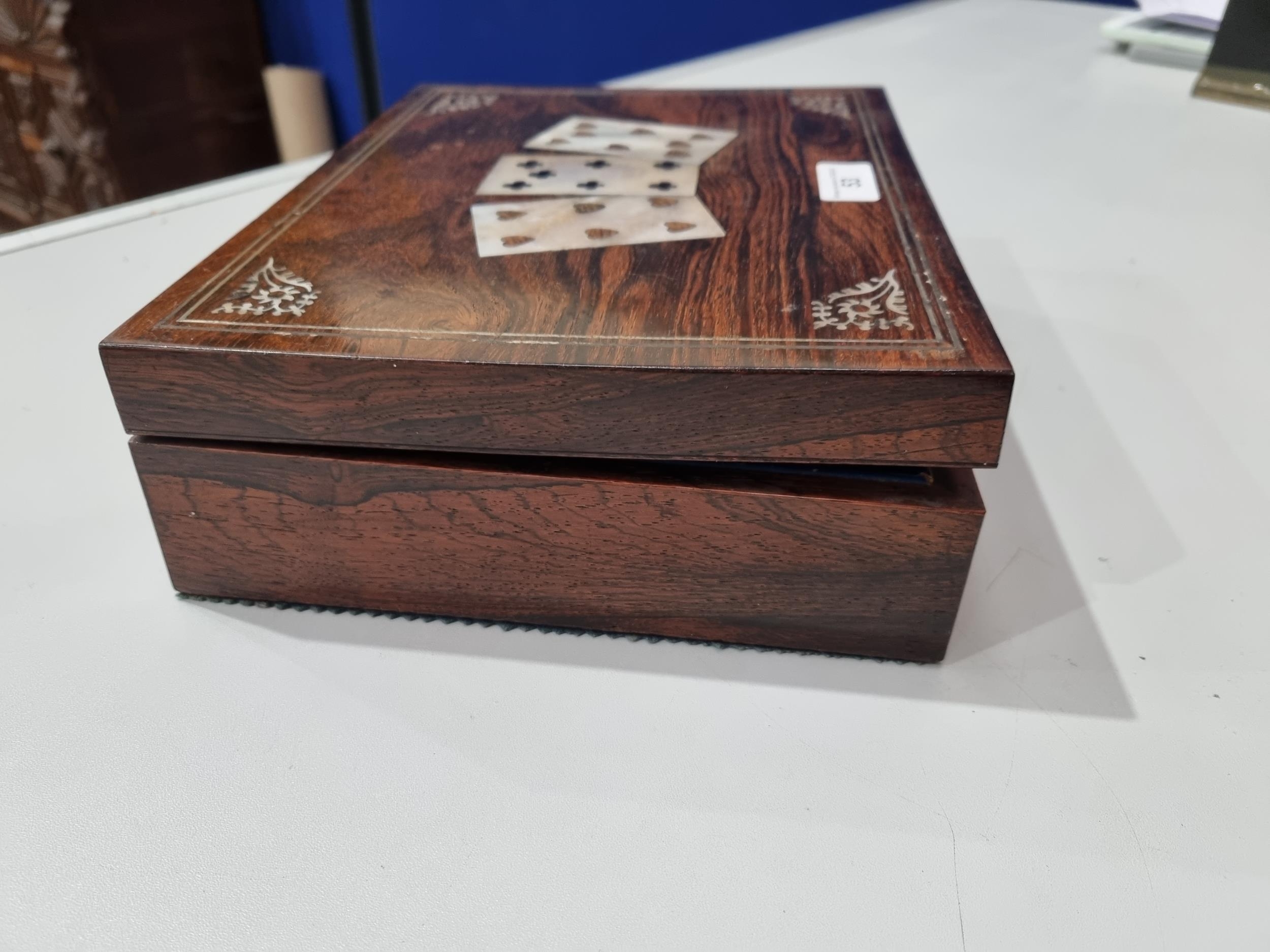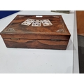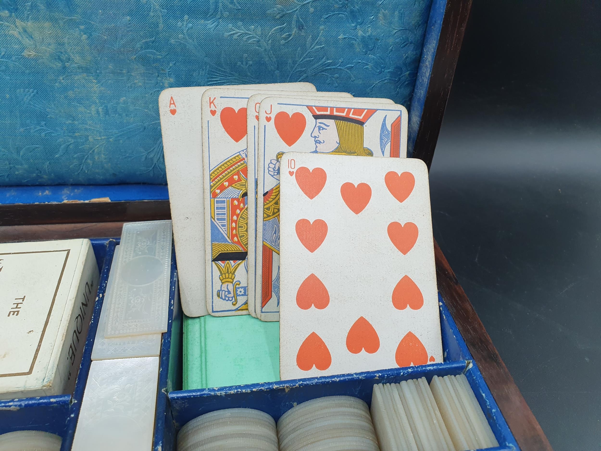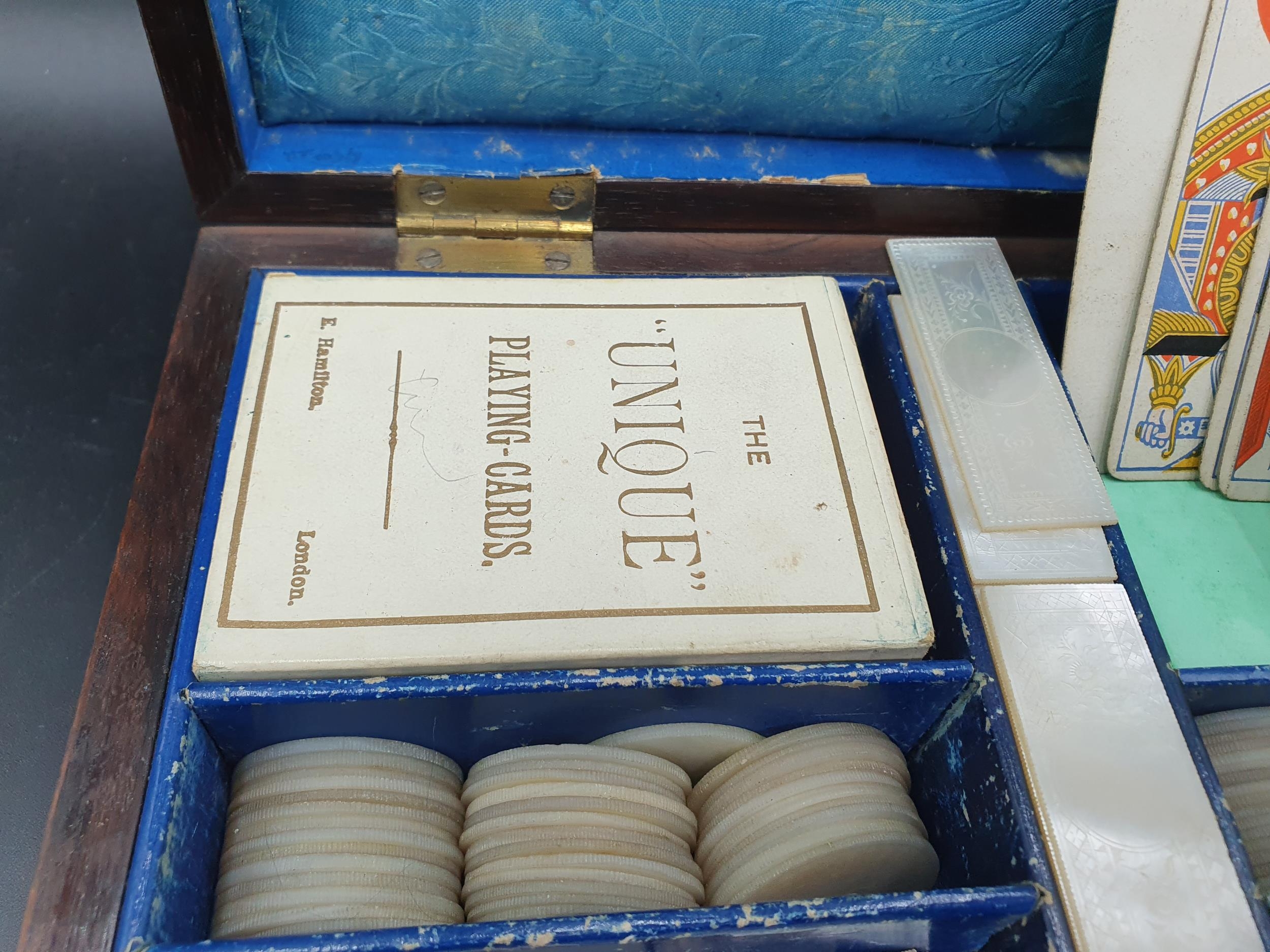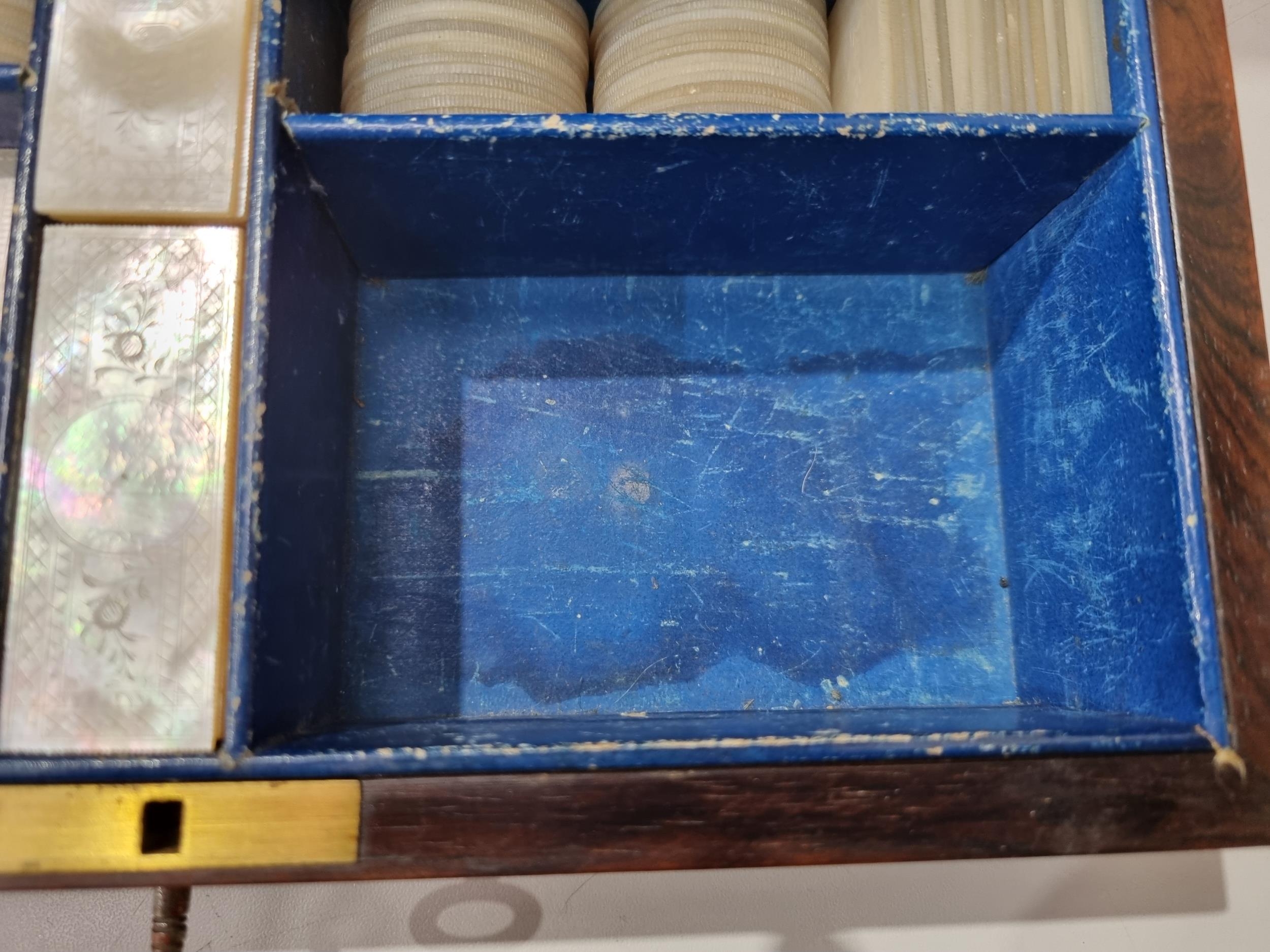A 19th century rosewood Games Box with mother of pearl inlay to the lid depicting playing cards, containing circular and rectangular counters, vintage playing cards, etc, 10 x 8in (CAB)