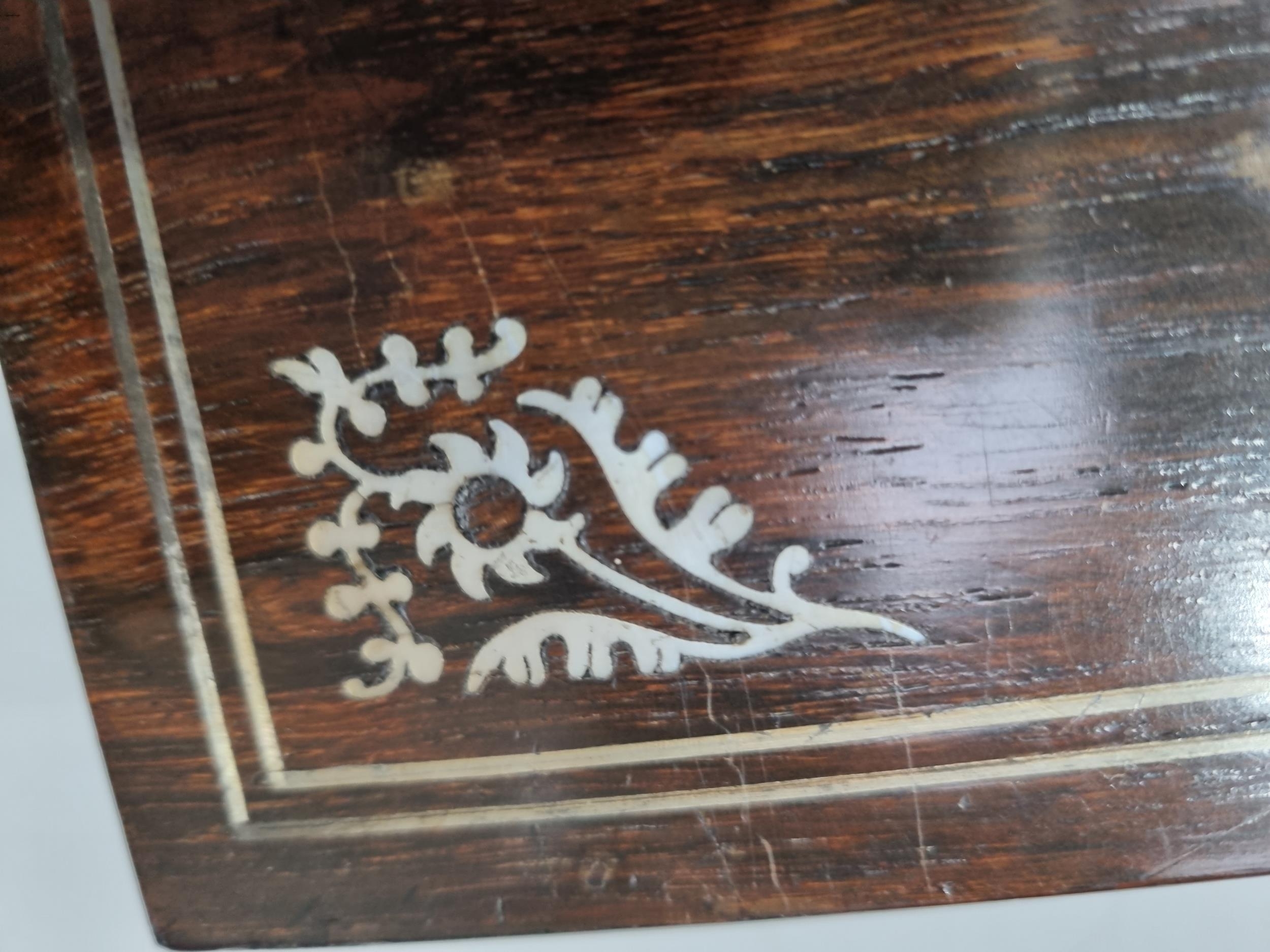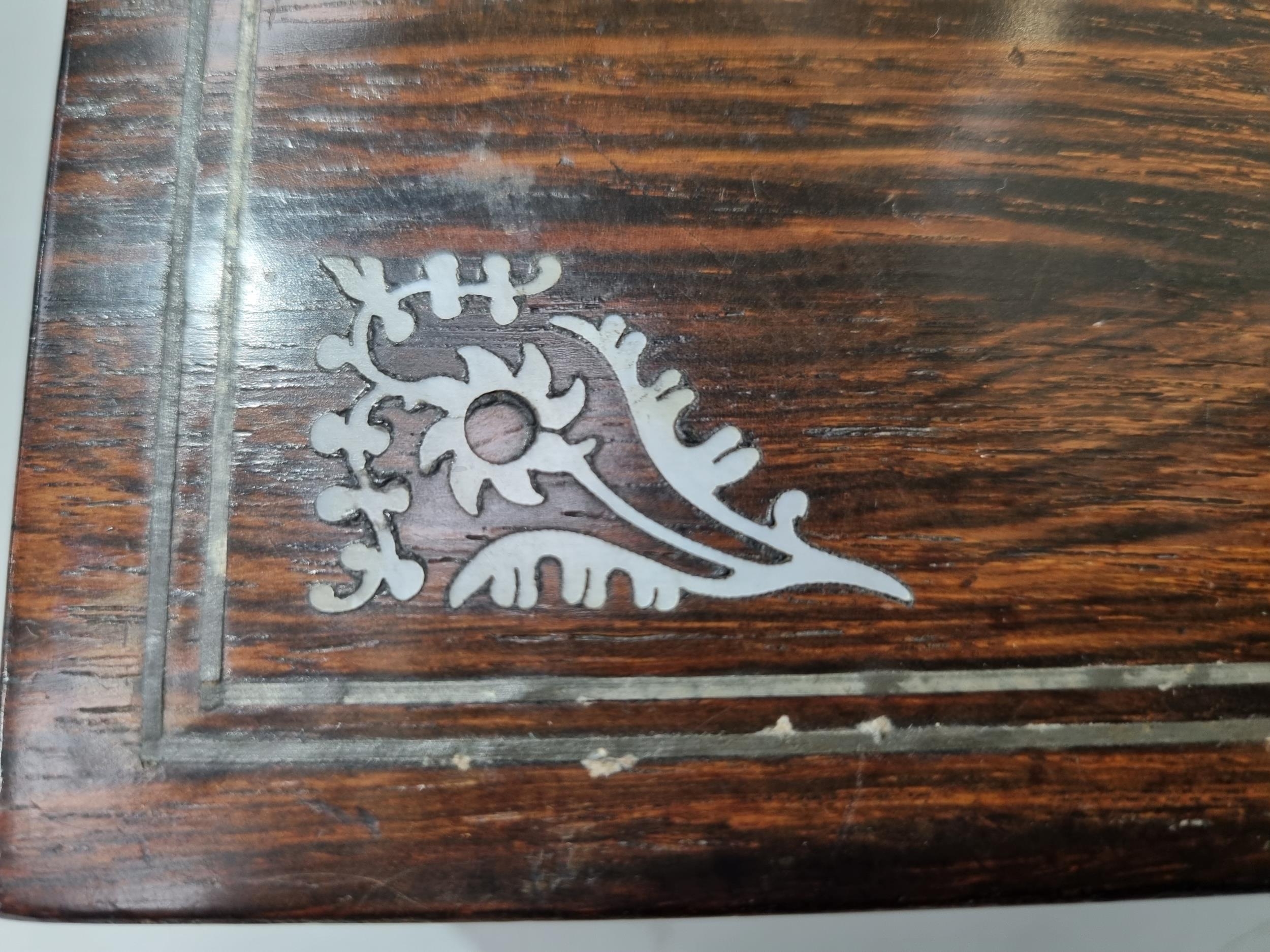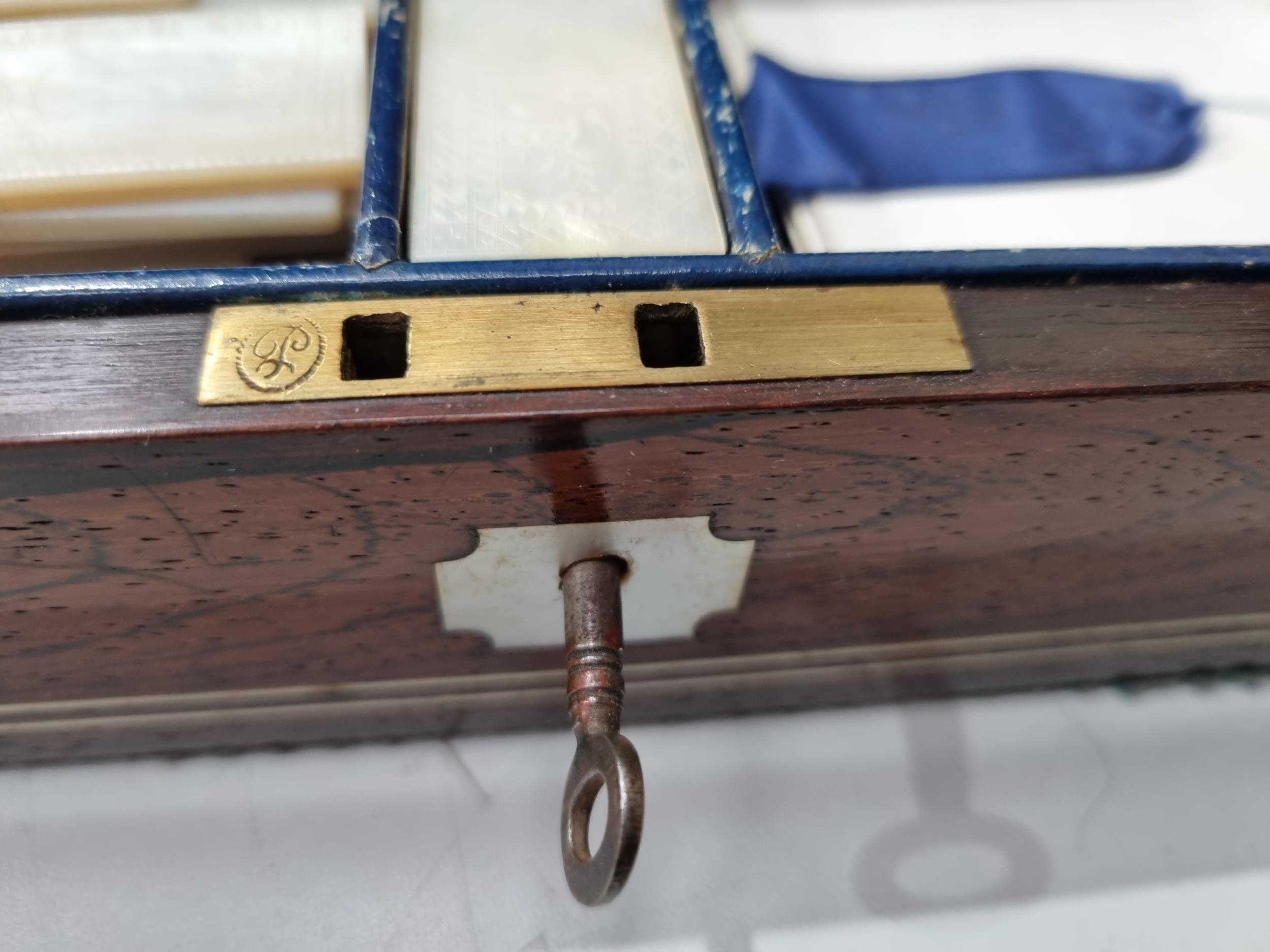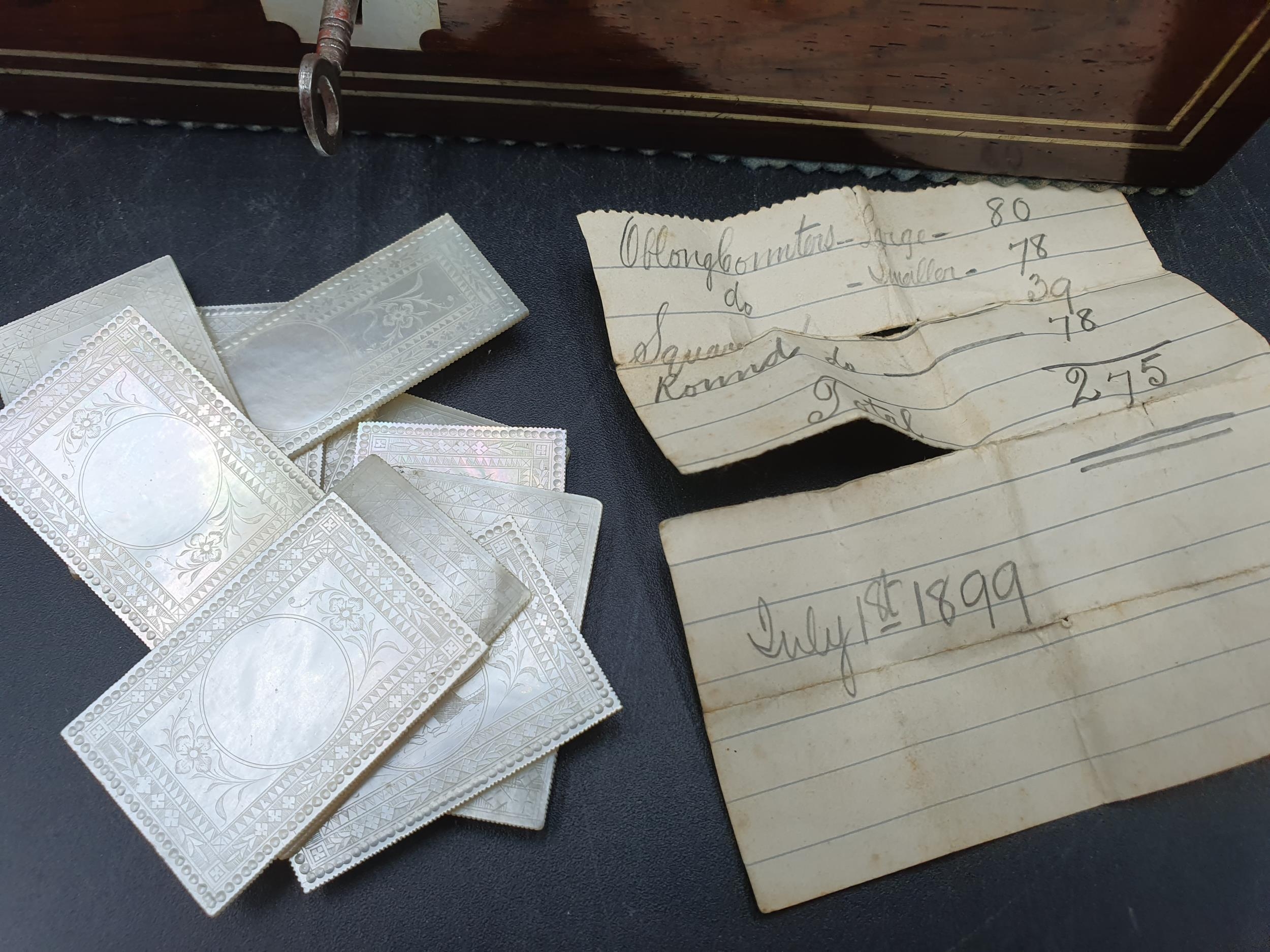 A 19th century rosewood Games Box with mother of pearl inlay to the lid depicting playing cards, containing circular and rectangular counters, vintage playing cards, etc, 10 x 8in (CAB)