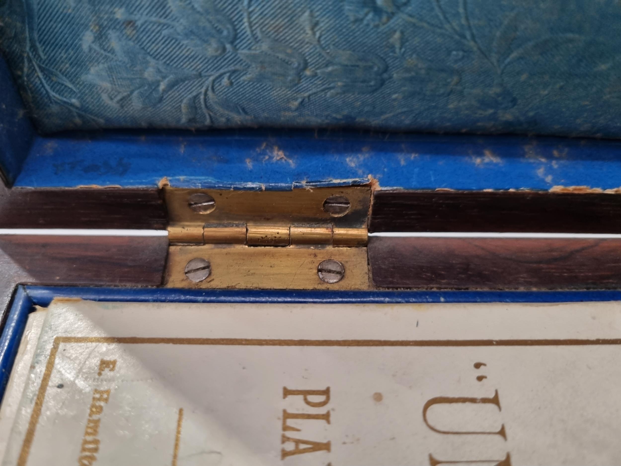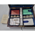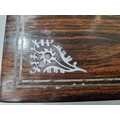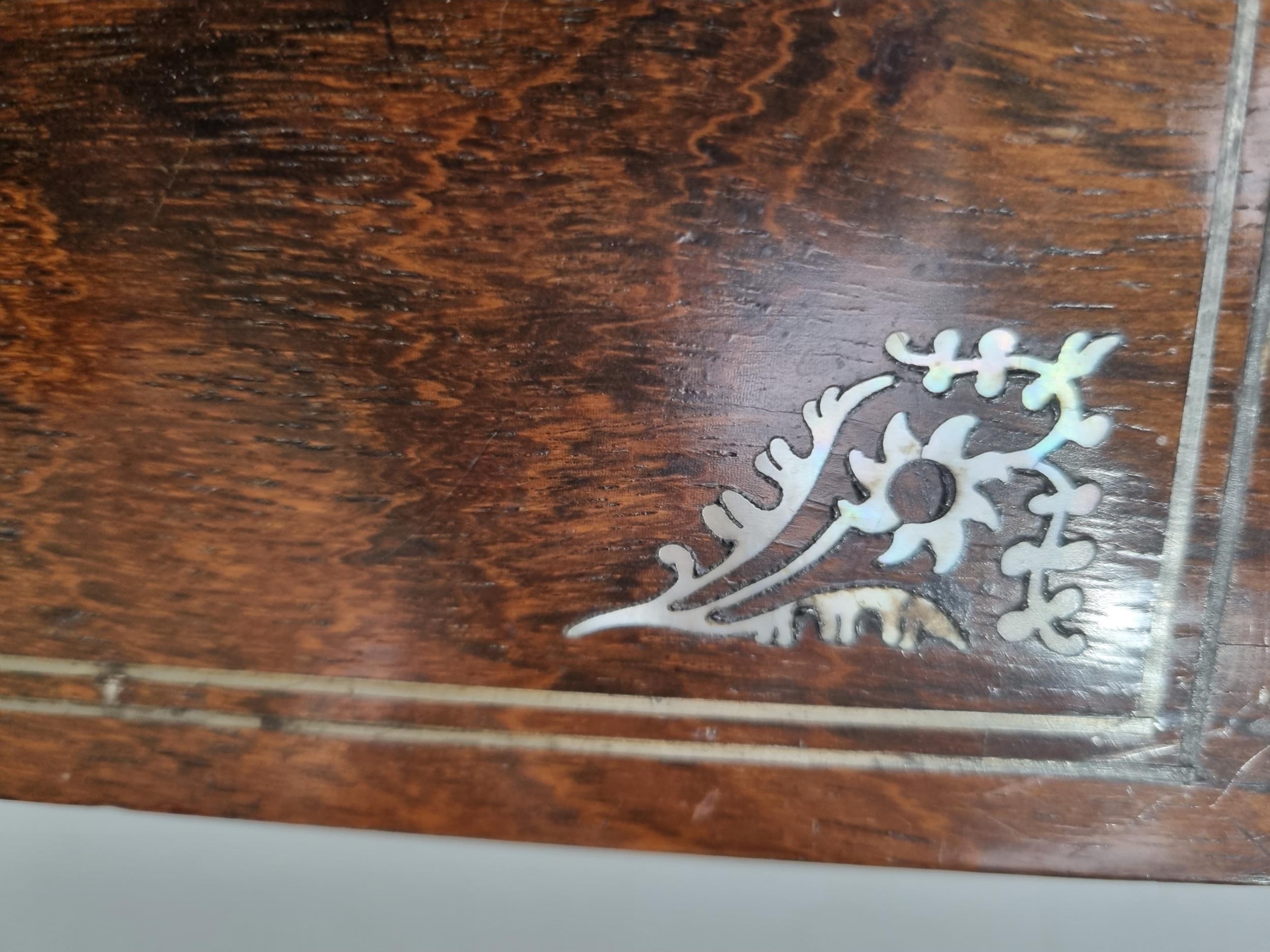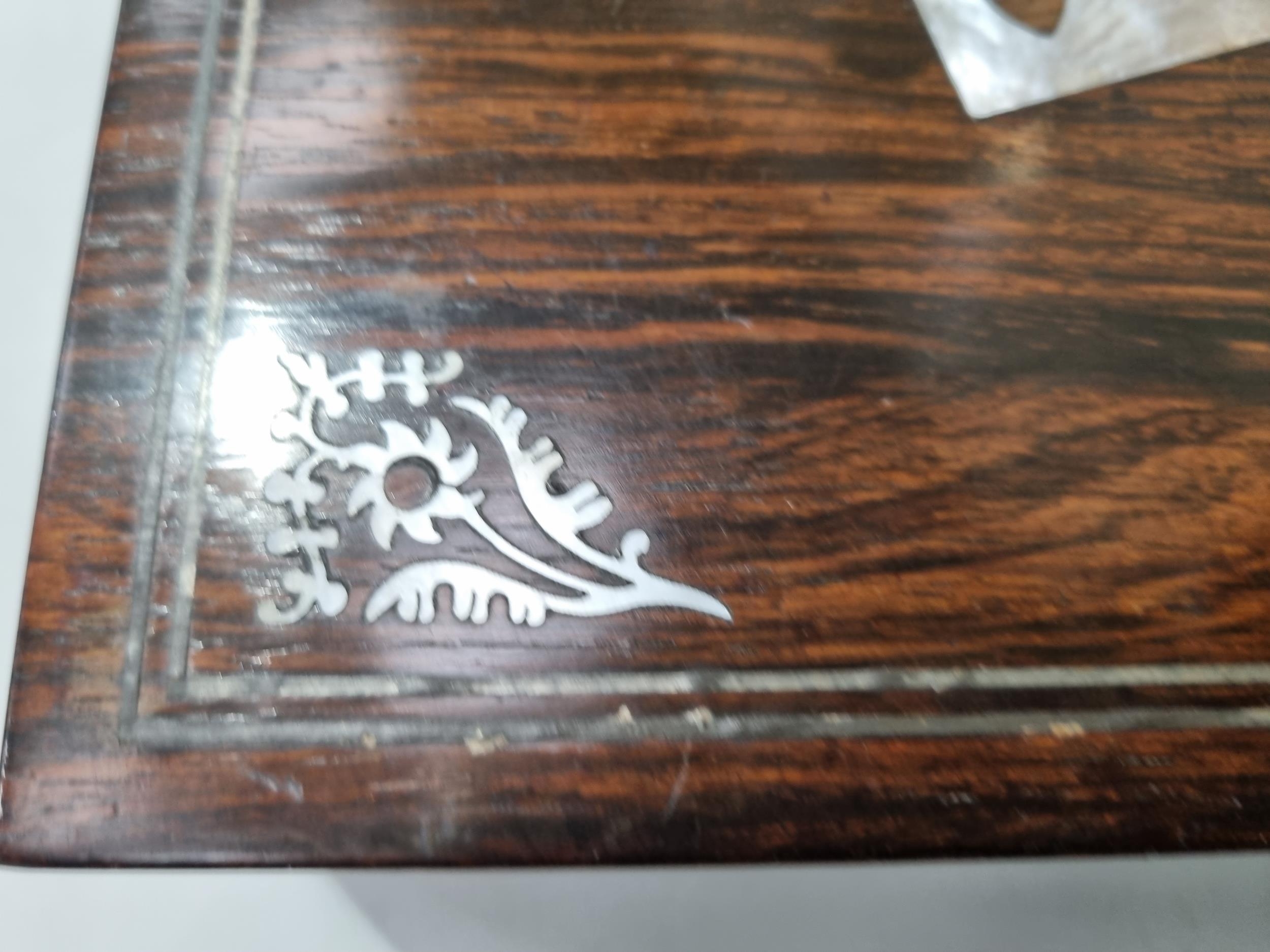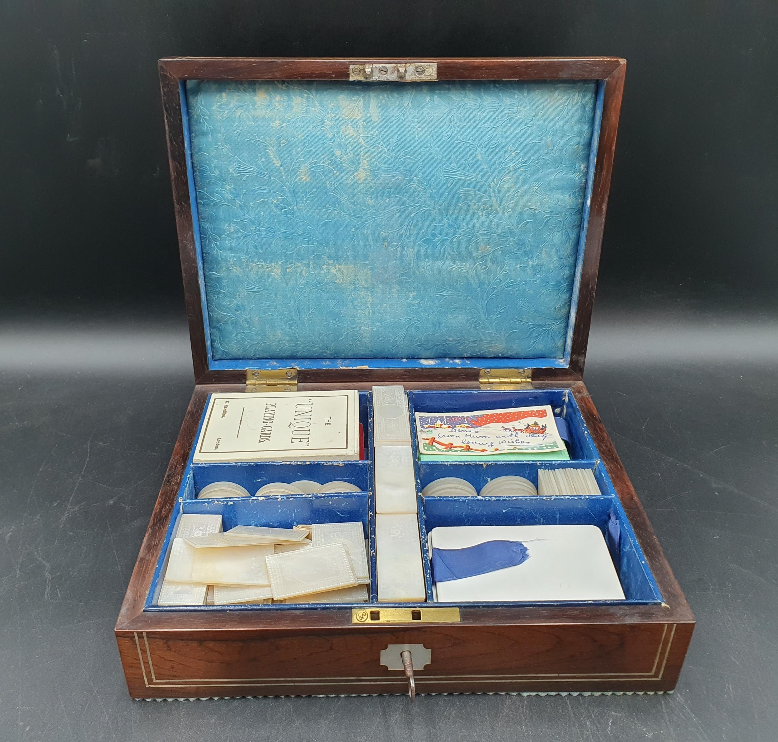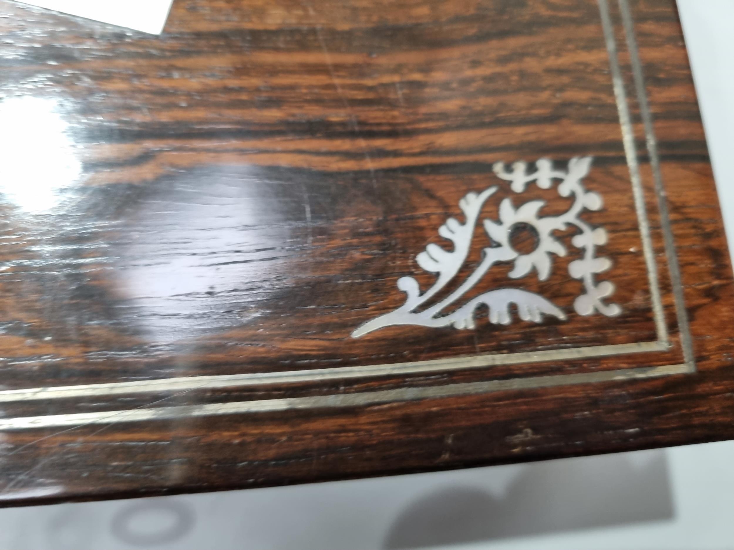 A 19th century rosewood Games Box with mother of pearl inlay to the lid depicting playing cards, containing circular and rectangular counters, vintage playing cards, etc, 10 x 8in (CAB)