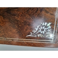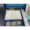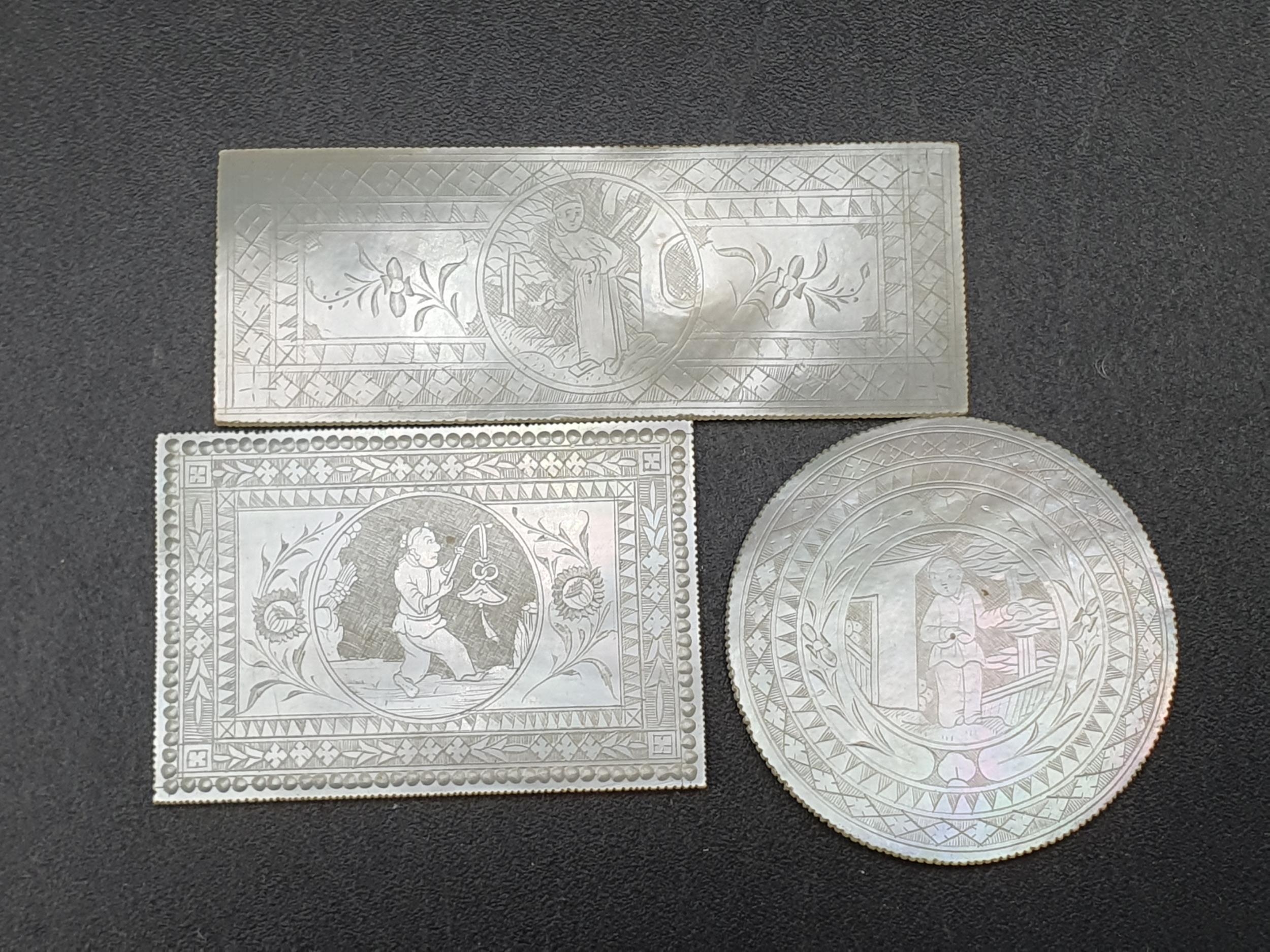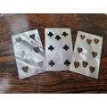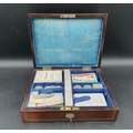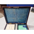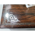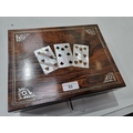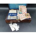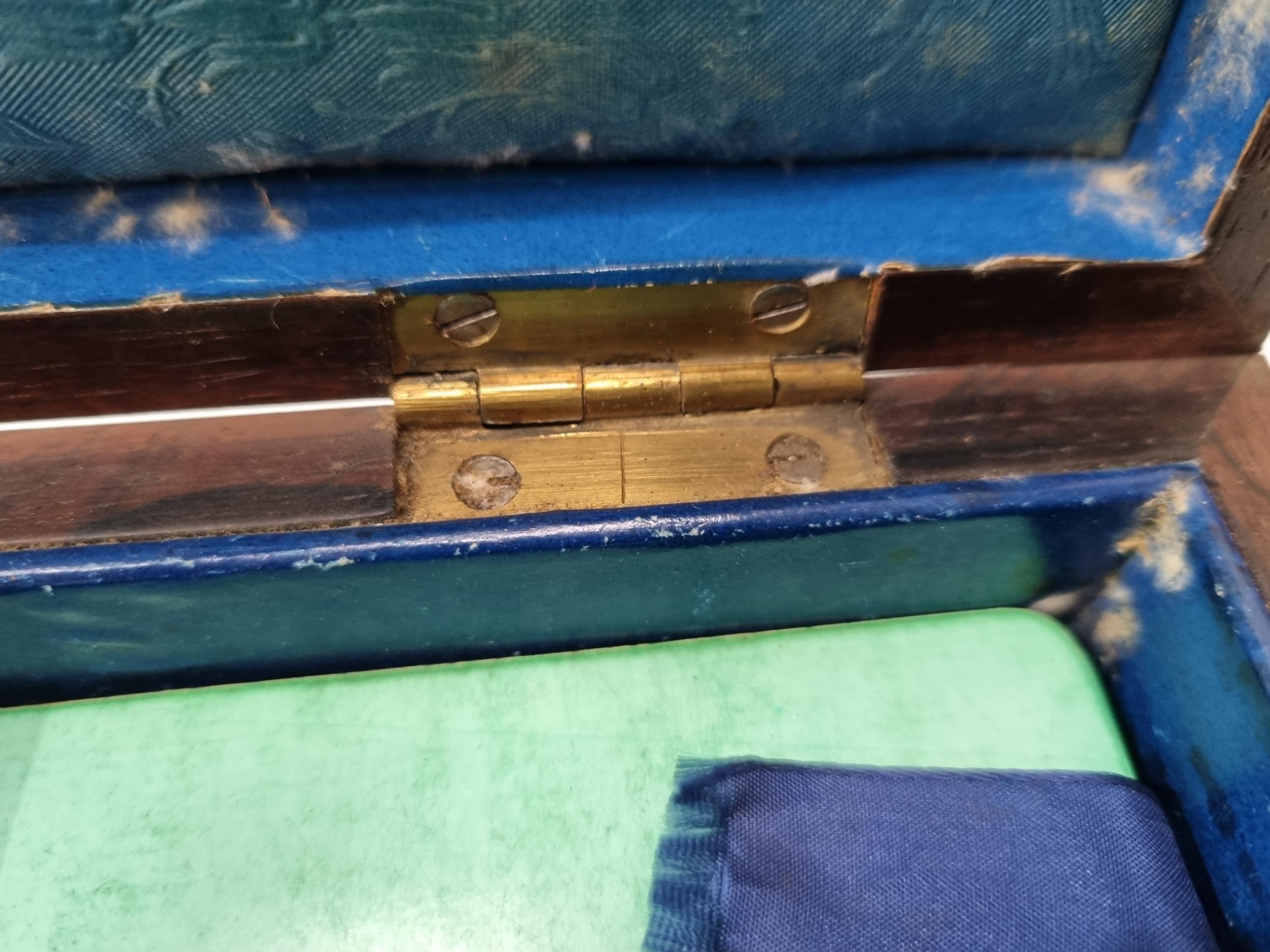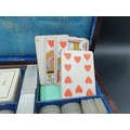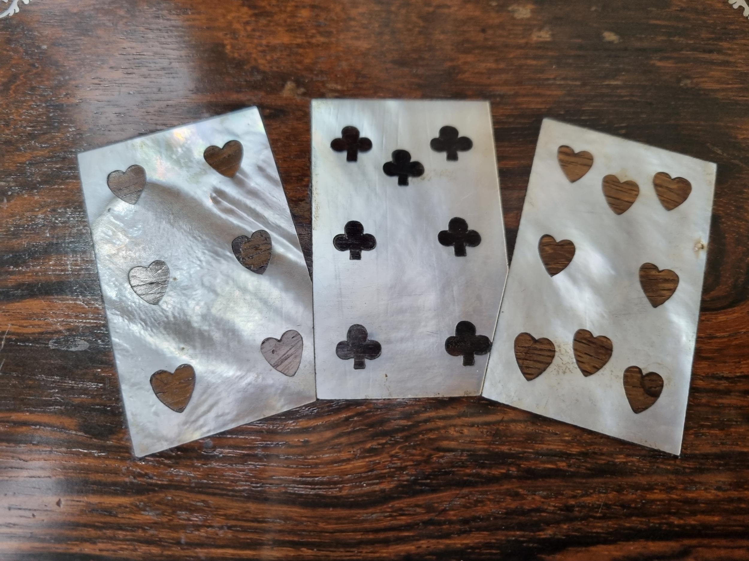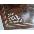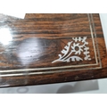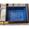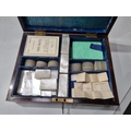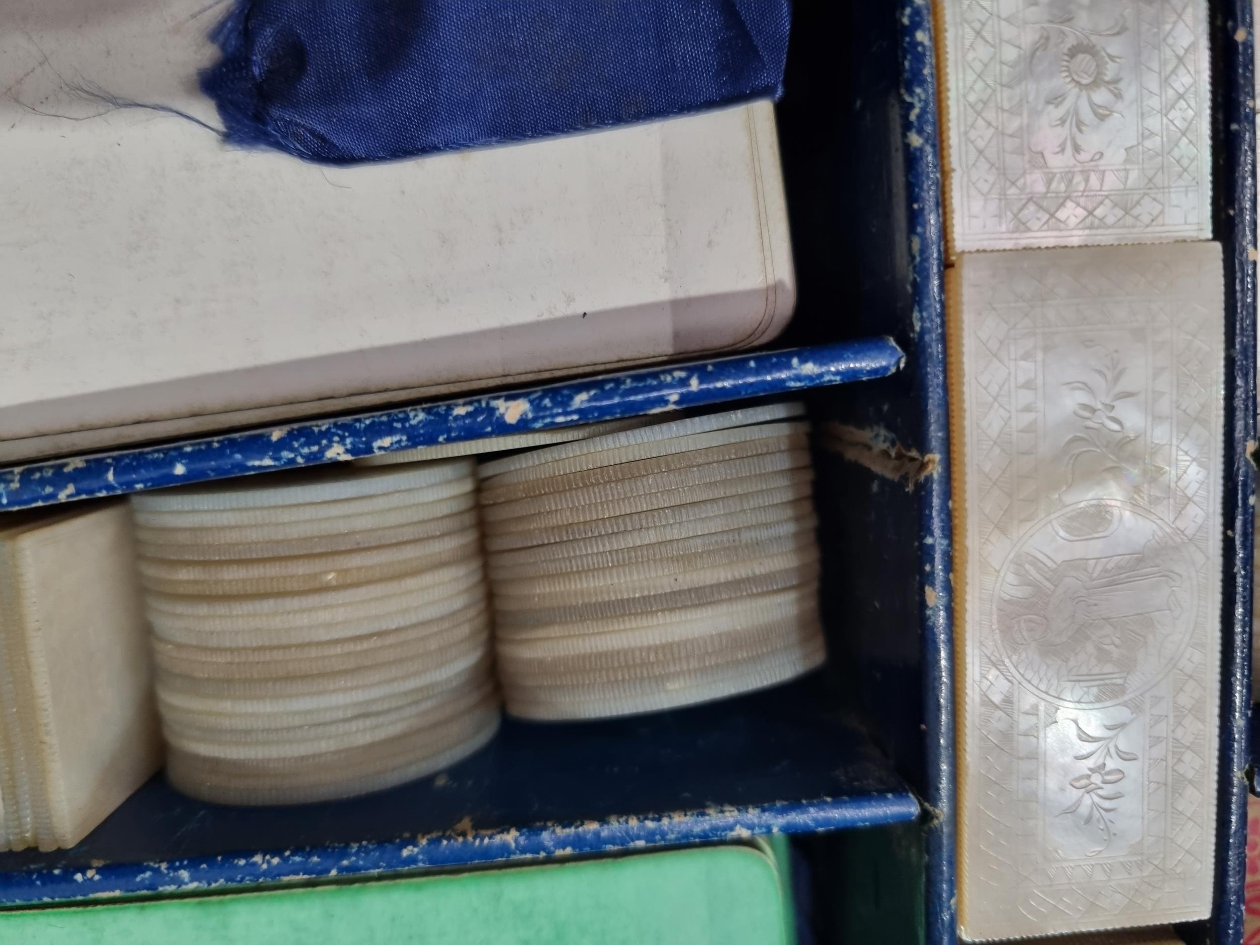 A 19th century rosewood Games Box with mother of pearl inlay to the lid depicting playing cards, containing circular and rectangular counters, vintage playing cards, etc, 10 x 8in (CAB)