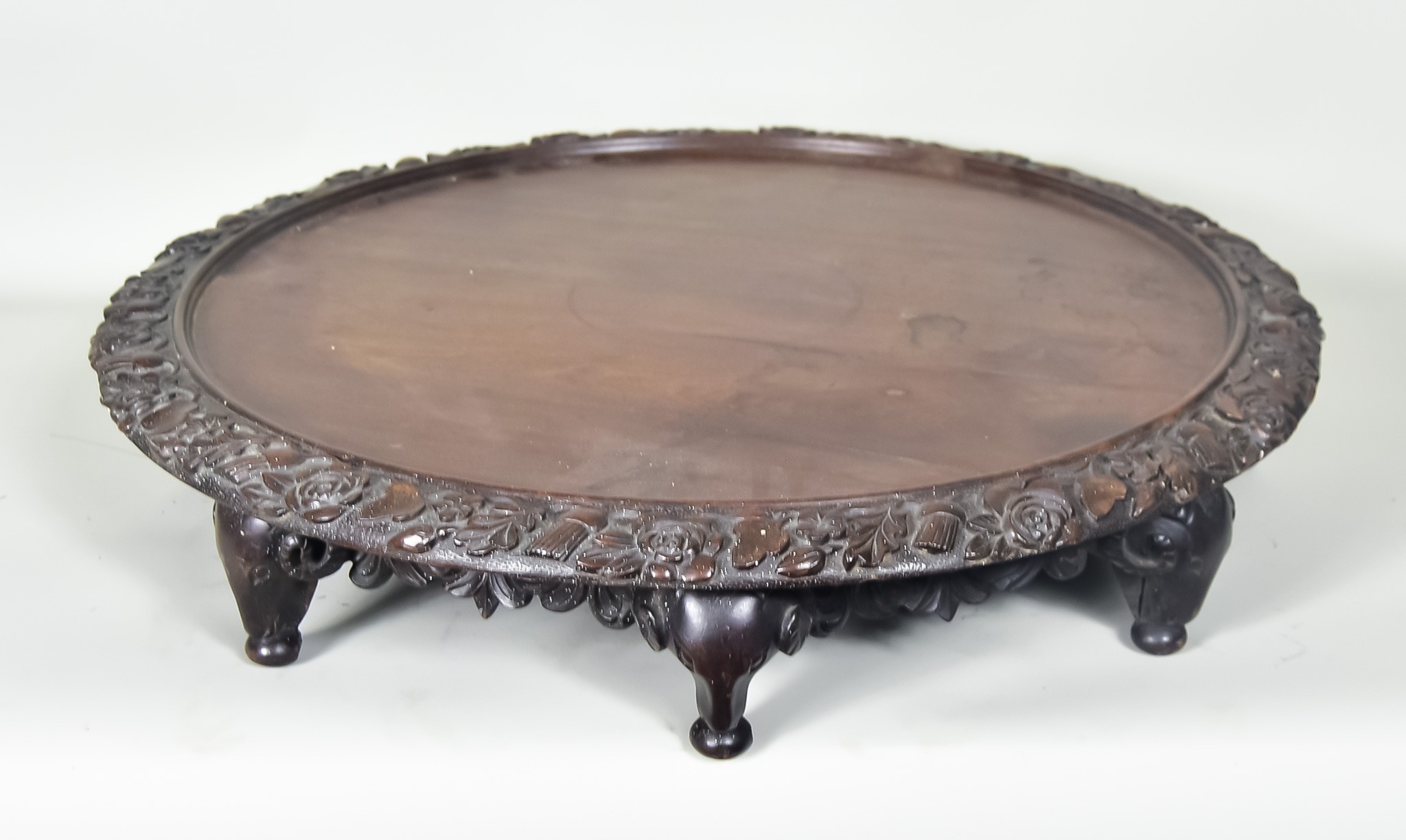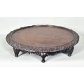 A 19th Century Scottish Turned Mahogany "Lazy Susan", the dish top with rose and thistle carved border, standing on ram's mask decorated feet, 25ins diameter