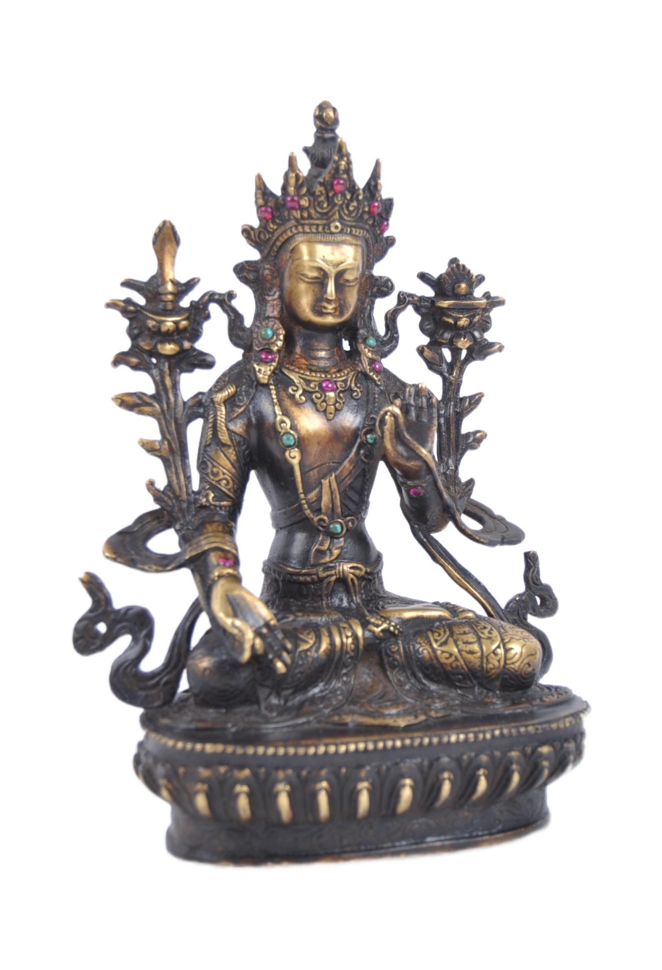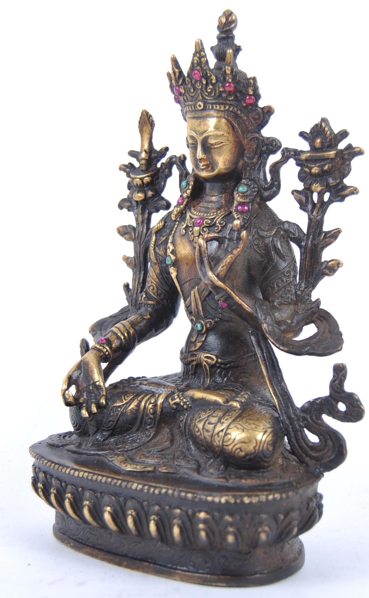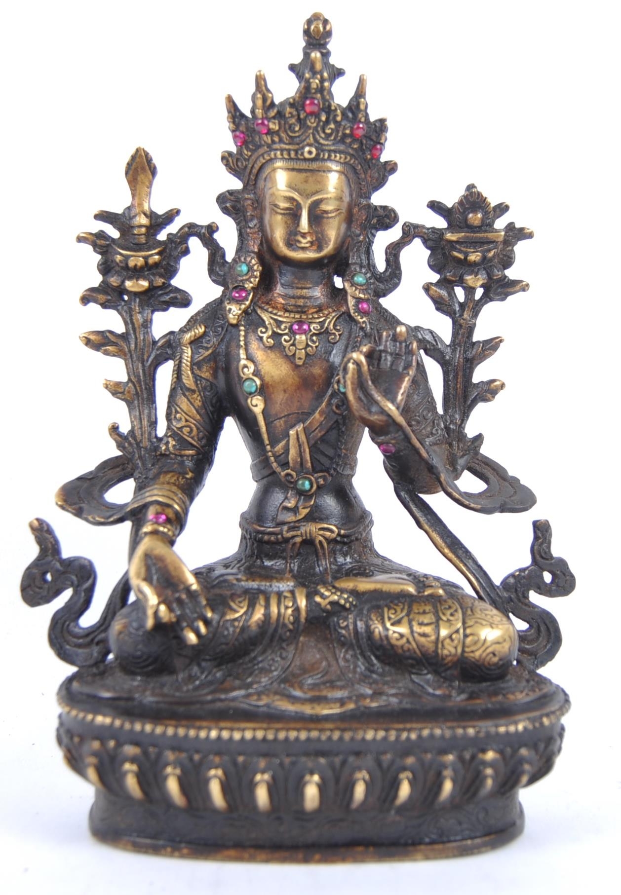 A 20th Century Chinese bronze figurine of Buddha / Green Tara. The figure modelled in the Lotus position being set with turquoise and rubies. All raised on lotus pedestal base. Measures approx; 21.5cm tall.
