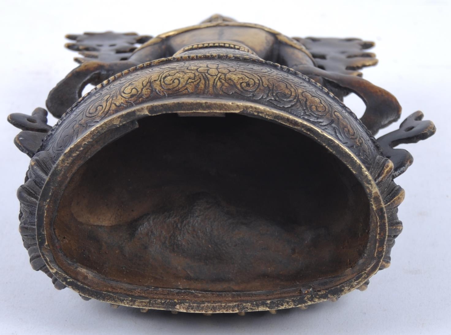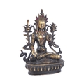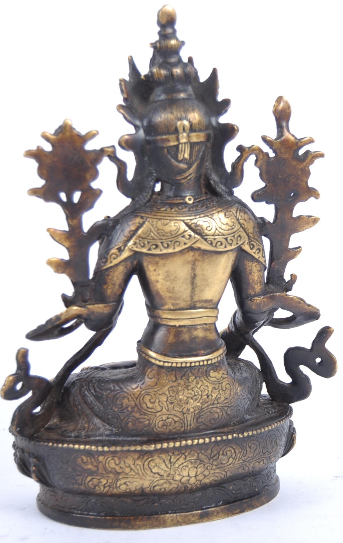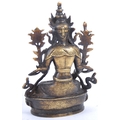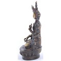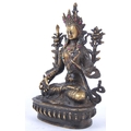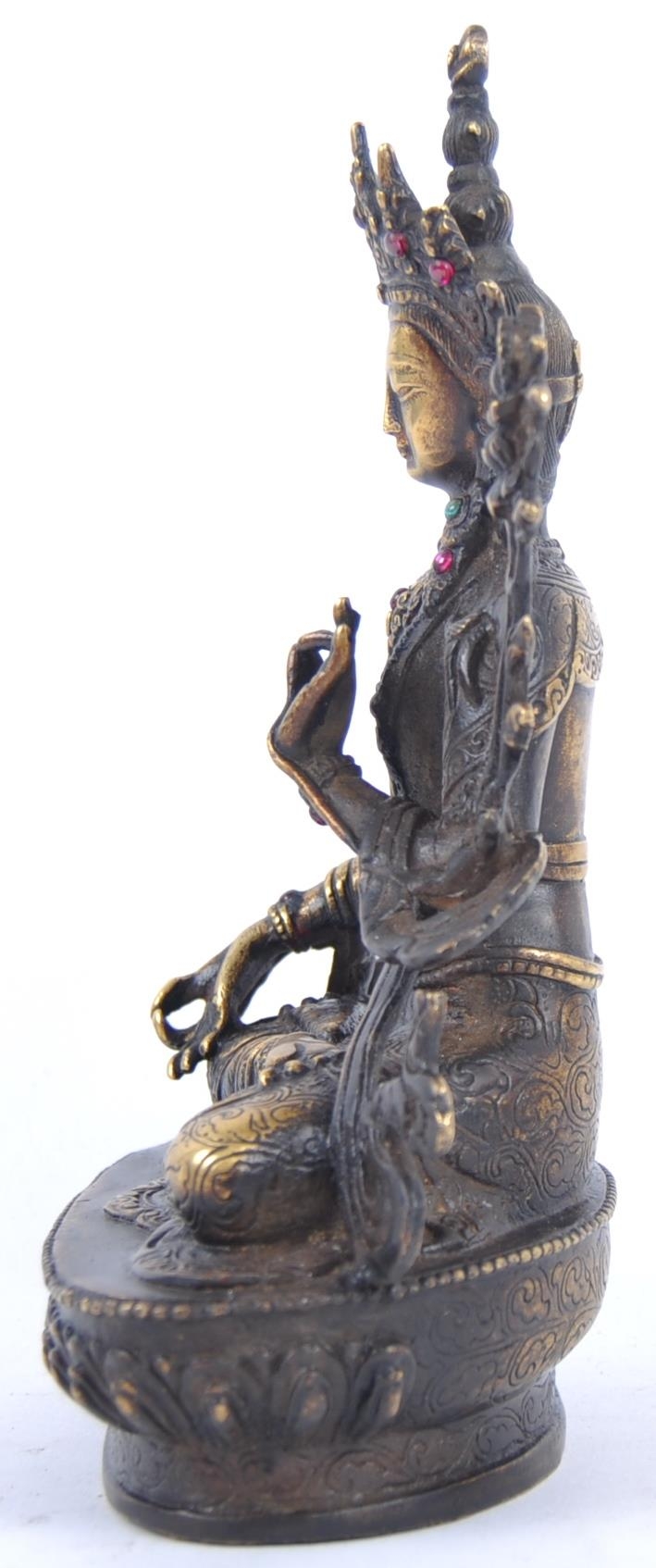A 20th Century Chinese bronze figurine of Buddha / Green Tara. The figure modelled in the Lotus position being set with turquoise and rubies. All raised on lotus pedestal base. Measures approx; 21.5cm tall.