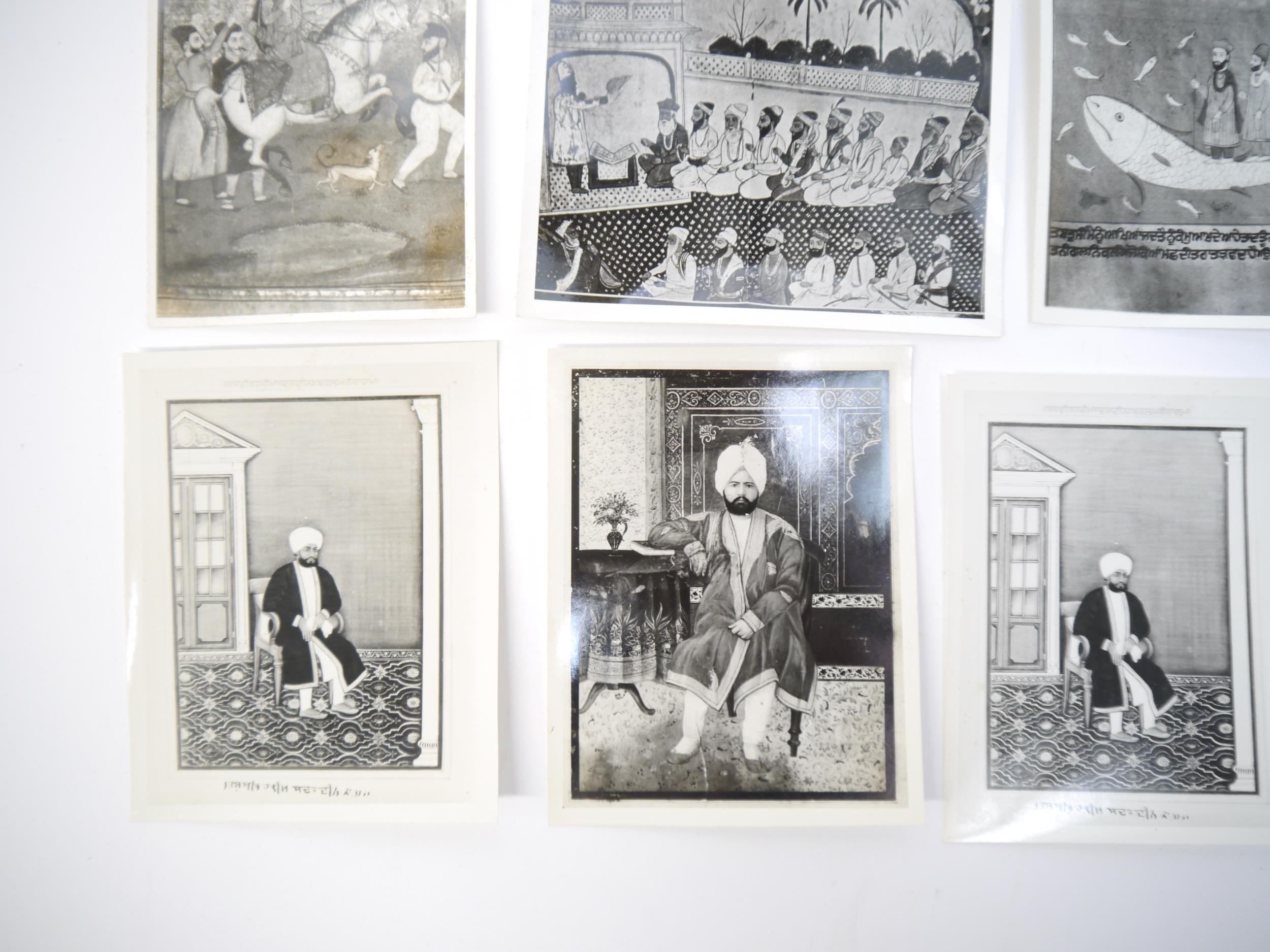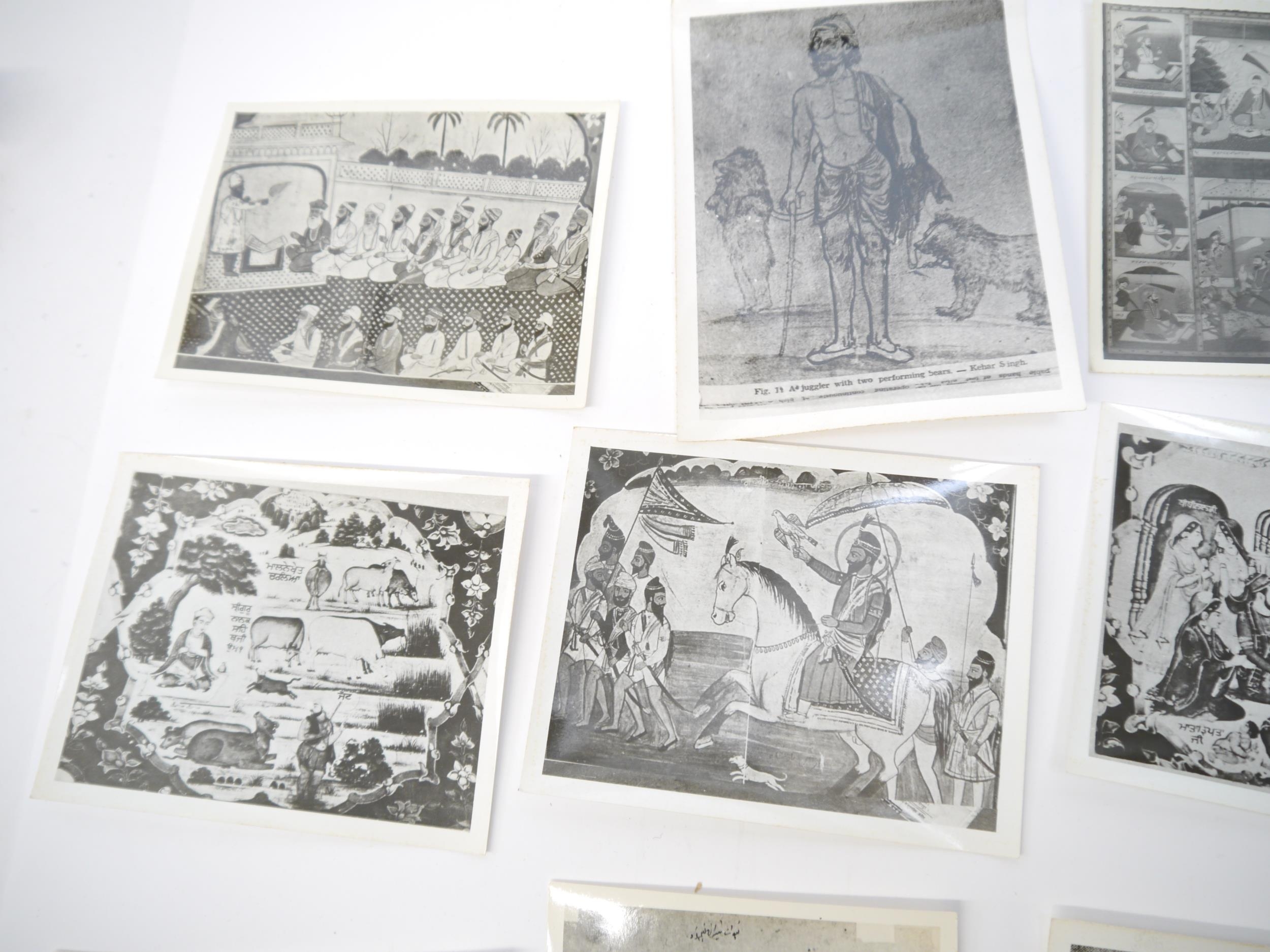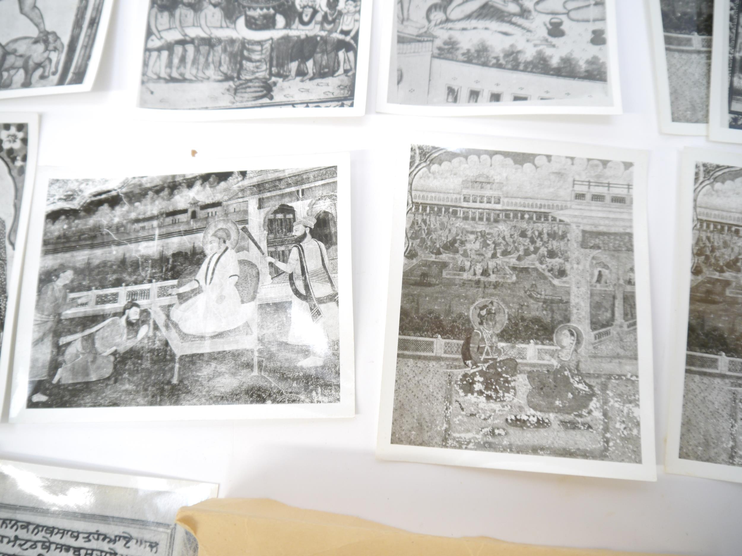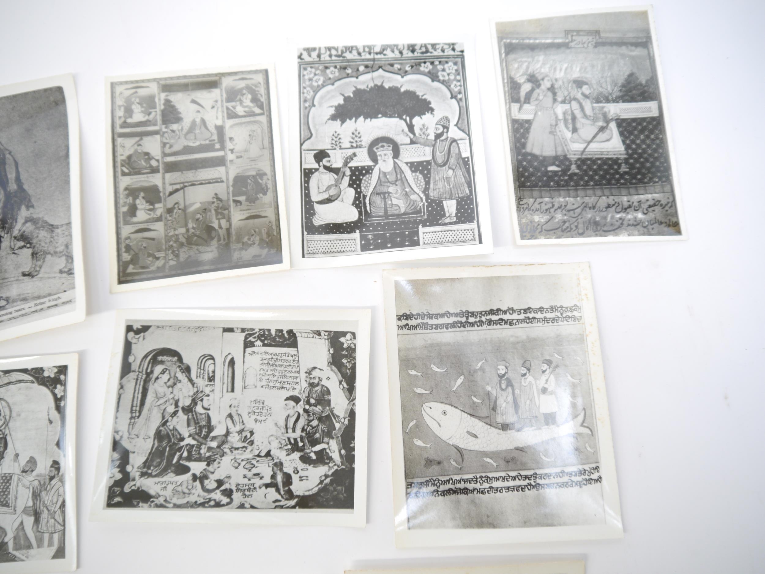 (India, Punjab), an envelope containing 50+ circa mid 20th Century photographs of Punjab school miniature paintings depicting various Sikh Gurus etc, a few of the photographs with pen & ink captions/annotations verso by R.P. Srivastava, scholar and author on Punjab painting. Images mainly approx 8.5 x 12cm. A scarce record of Punjab miniature paintings, with many of the original 18th & 19th Century paintings having been lost