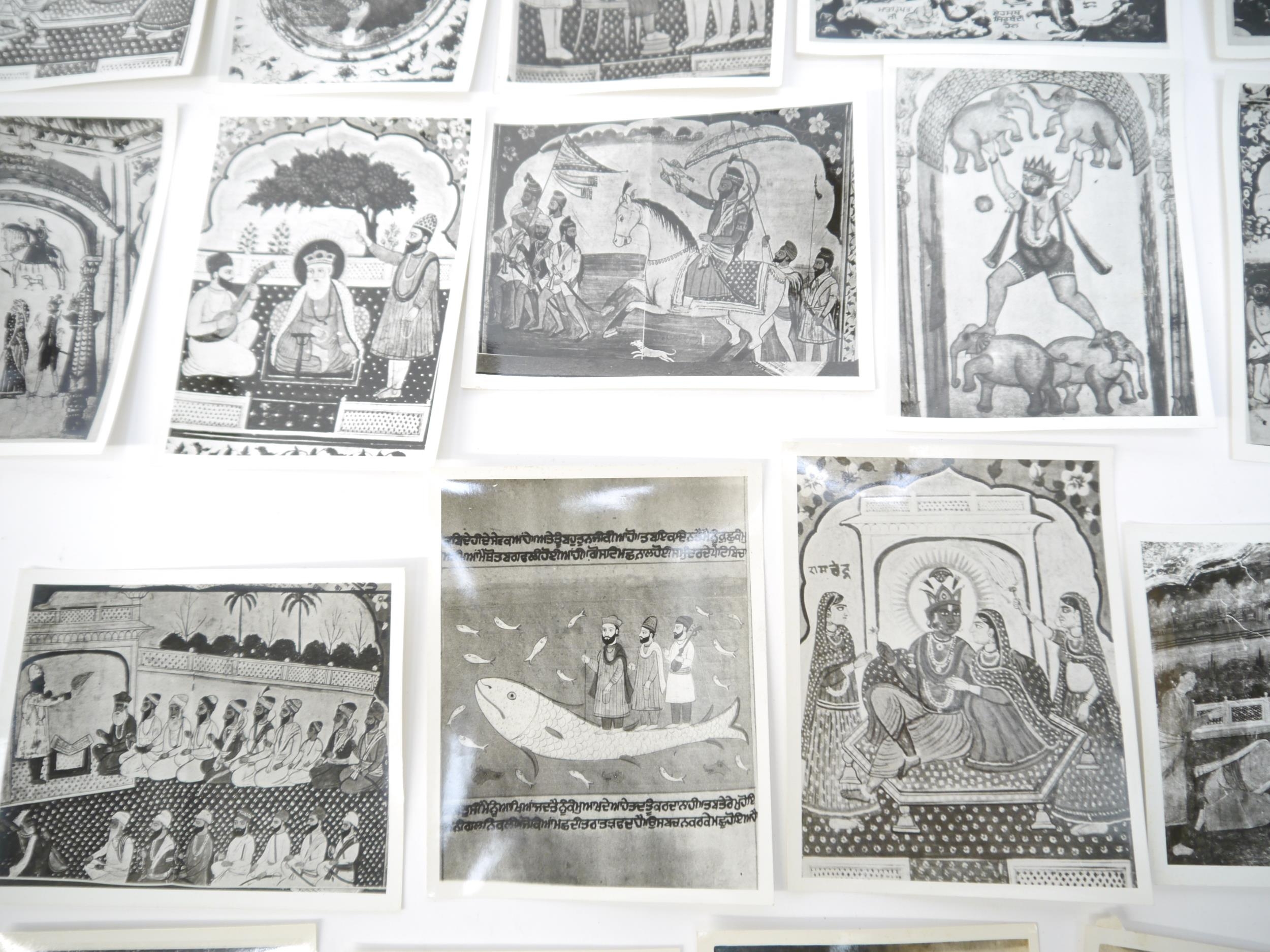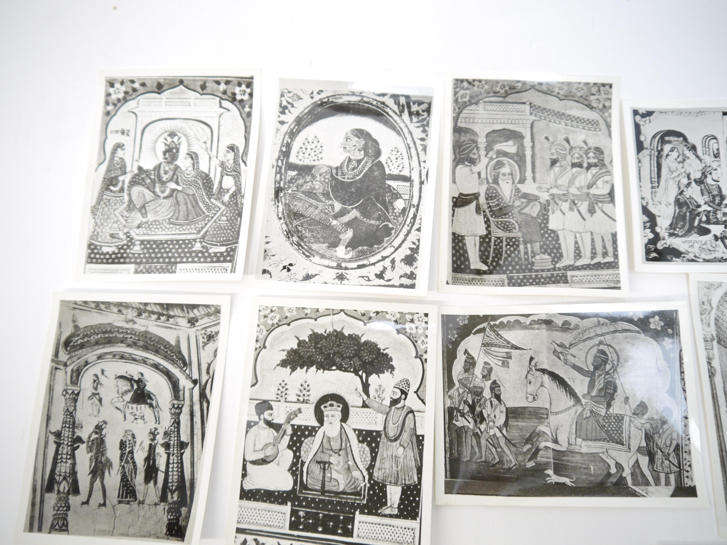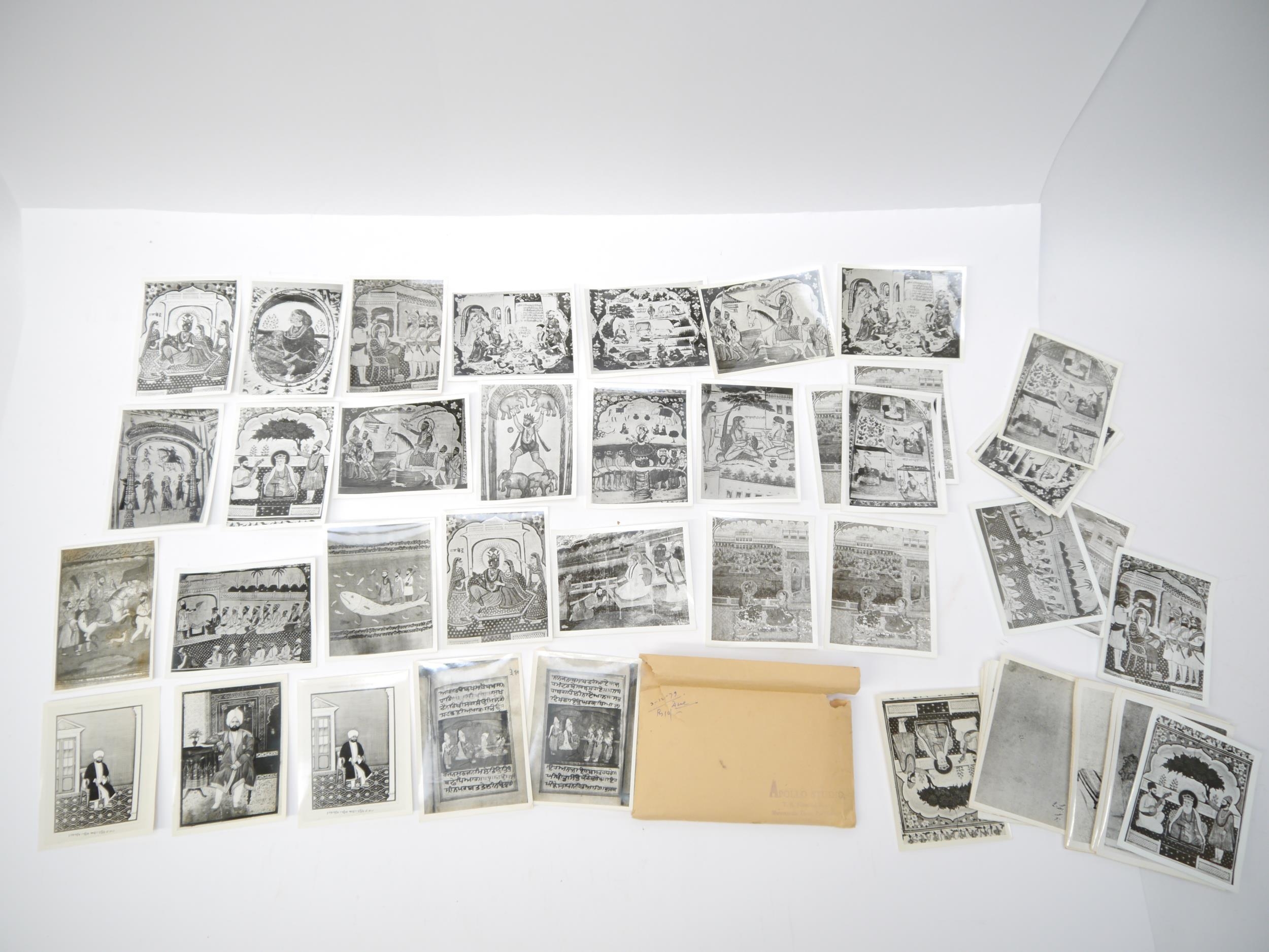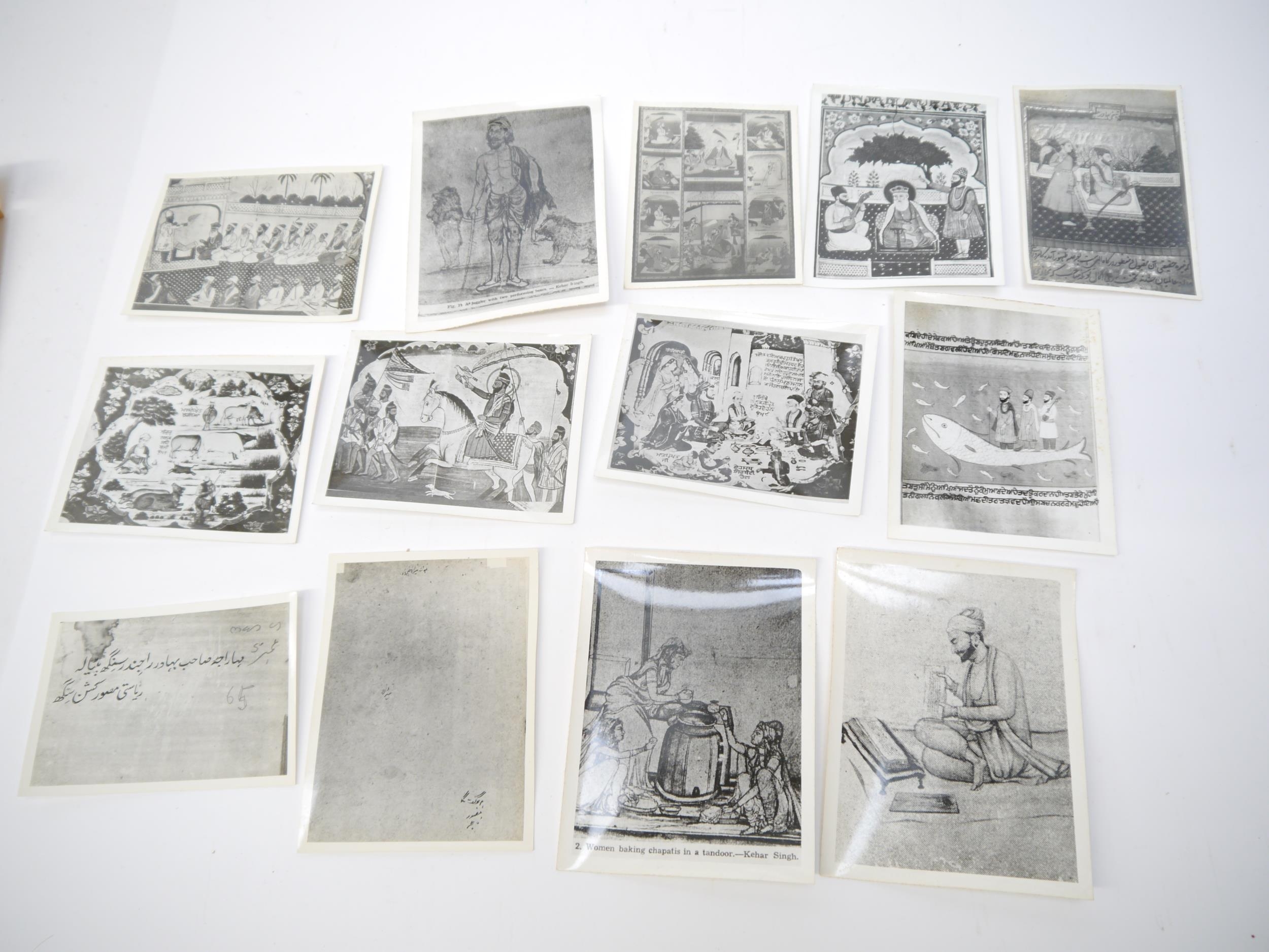 (India, Punjab), an envelope containing 50+ circa mid 20th Century photographs of Punjab school miniature paintings depicting various Sikh Gurus etc, a few of the photographs with pen & ink captions/annotations verso by R.P. Srivastava, scholar and author on Punjab painting. Images mainly approx 8.5 x 12cm. A scarce record of Punjab miniature paintings, with many of the original 18th & 19th Century paintings having been lost