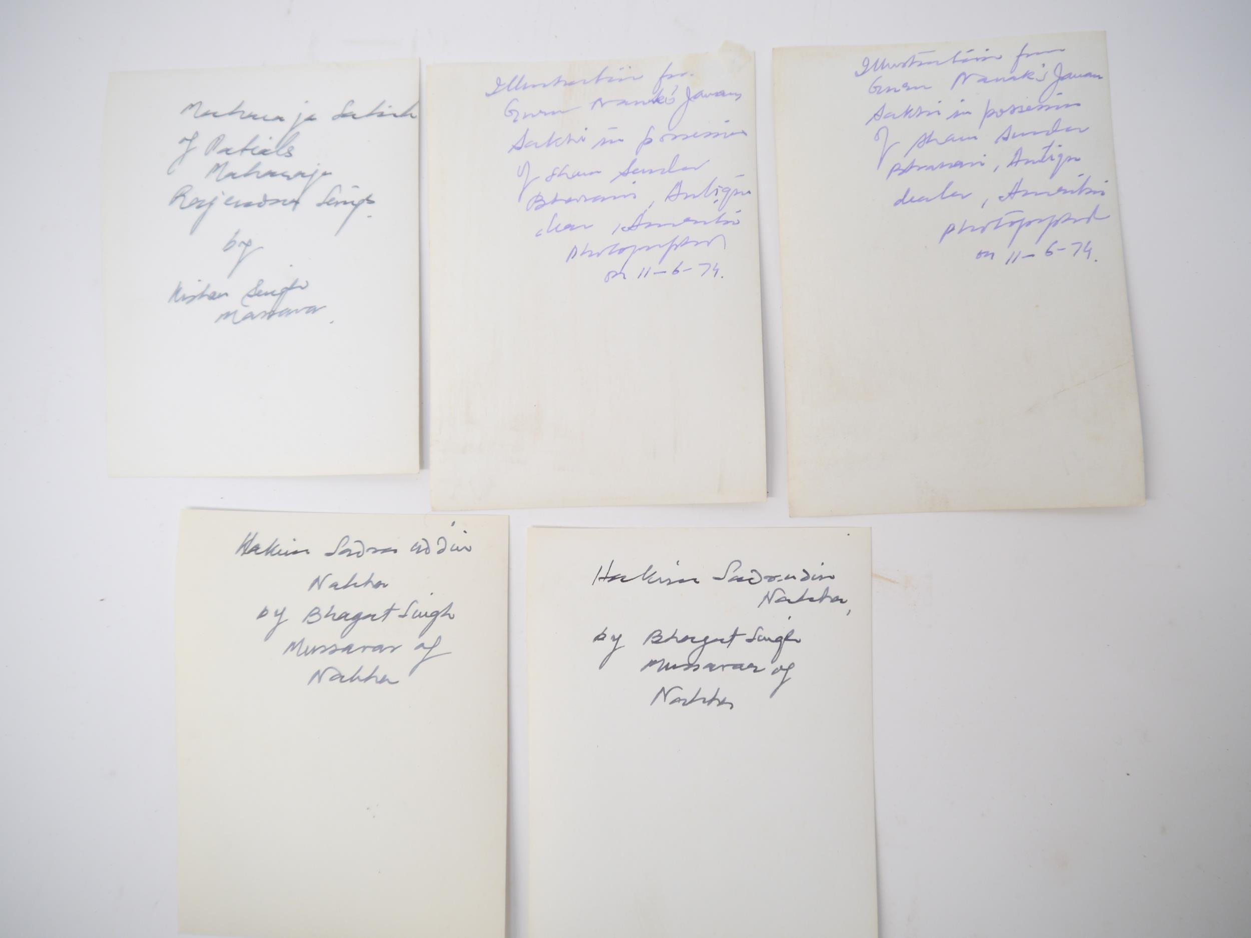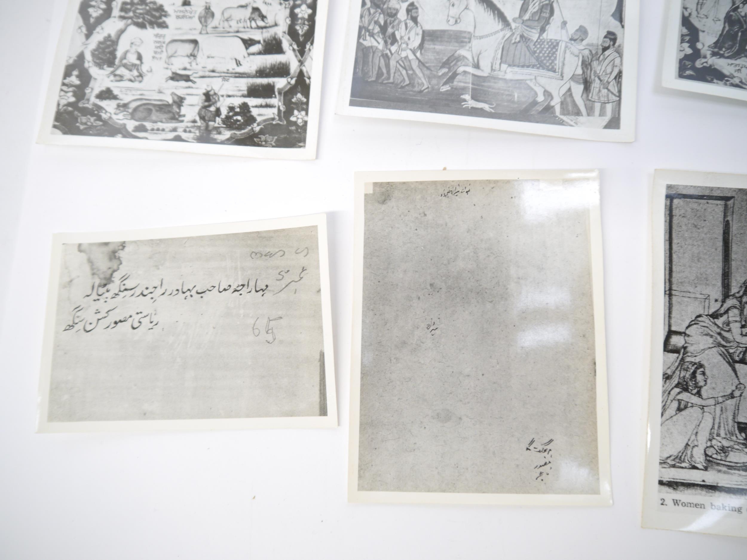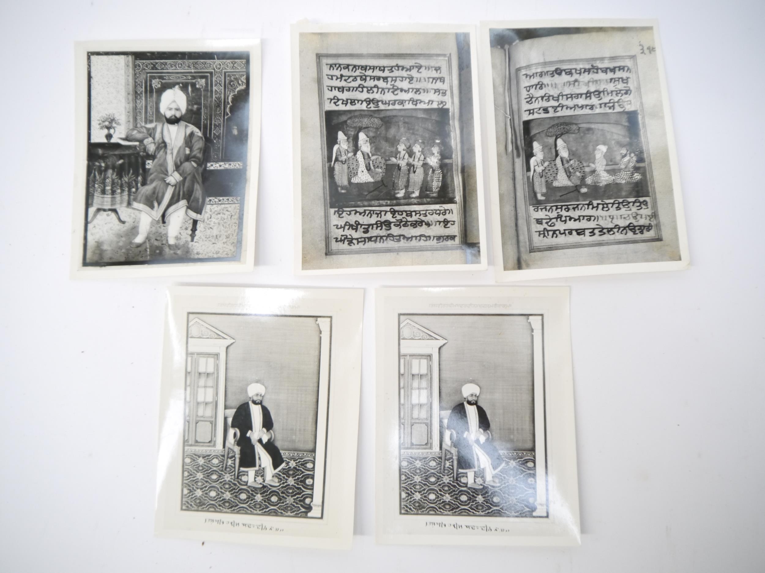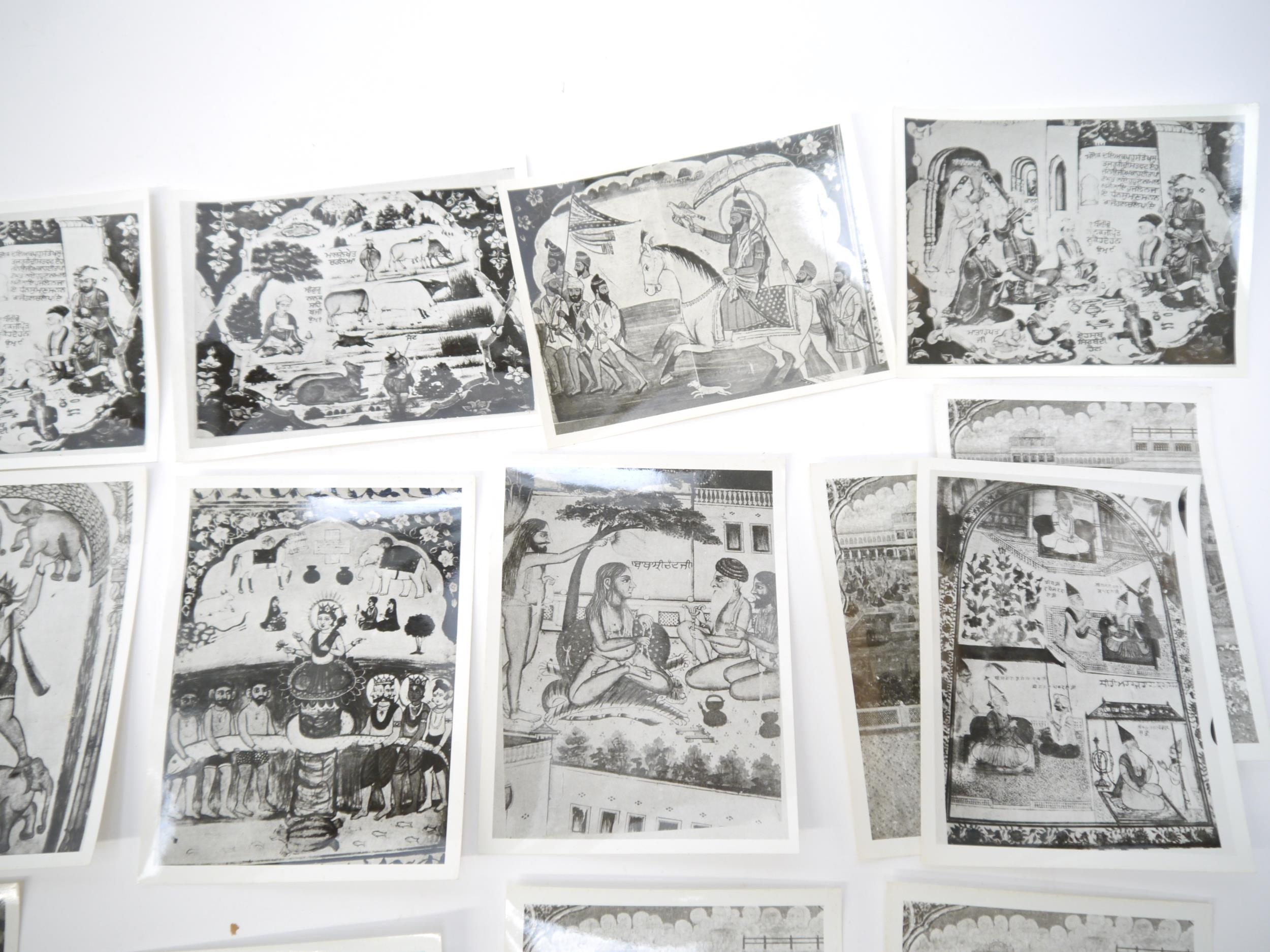(India, Punjab), an envelope containing 50+ circa mid 20th Century photographs of Punjab school miniature paintings depicting various Sikh Gurus etc, a few of the photographs with pen & ink captions/annotations verso by R.P. Srivastava, scholar and author on Punjab painting. Images mainly approx 8.5 x 12cm. A scarce record of Punjab miniature paintings, with many of the original 18th & 19th Century paintings having been lost