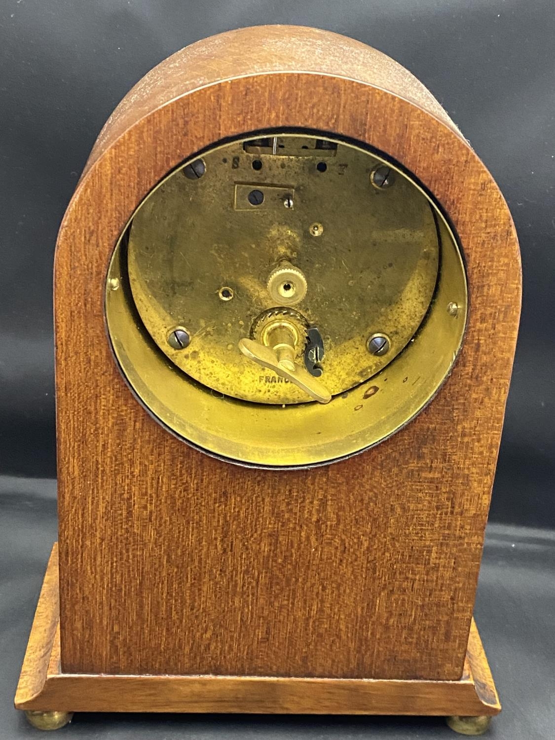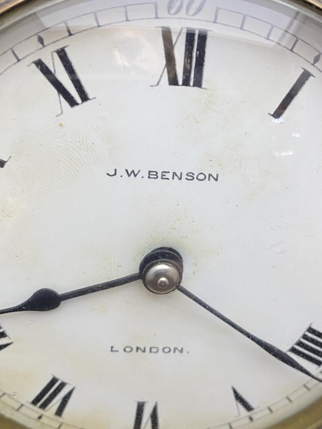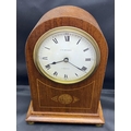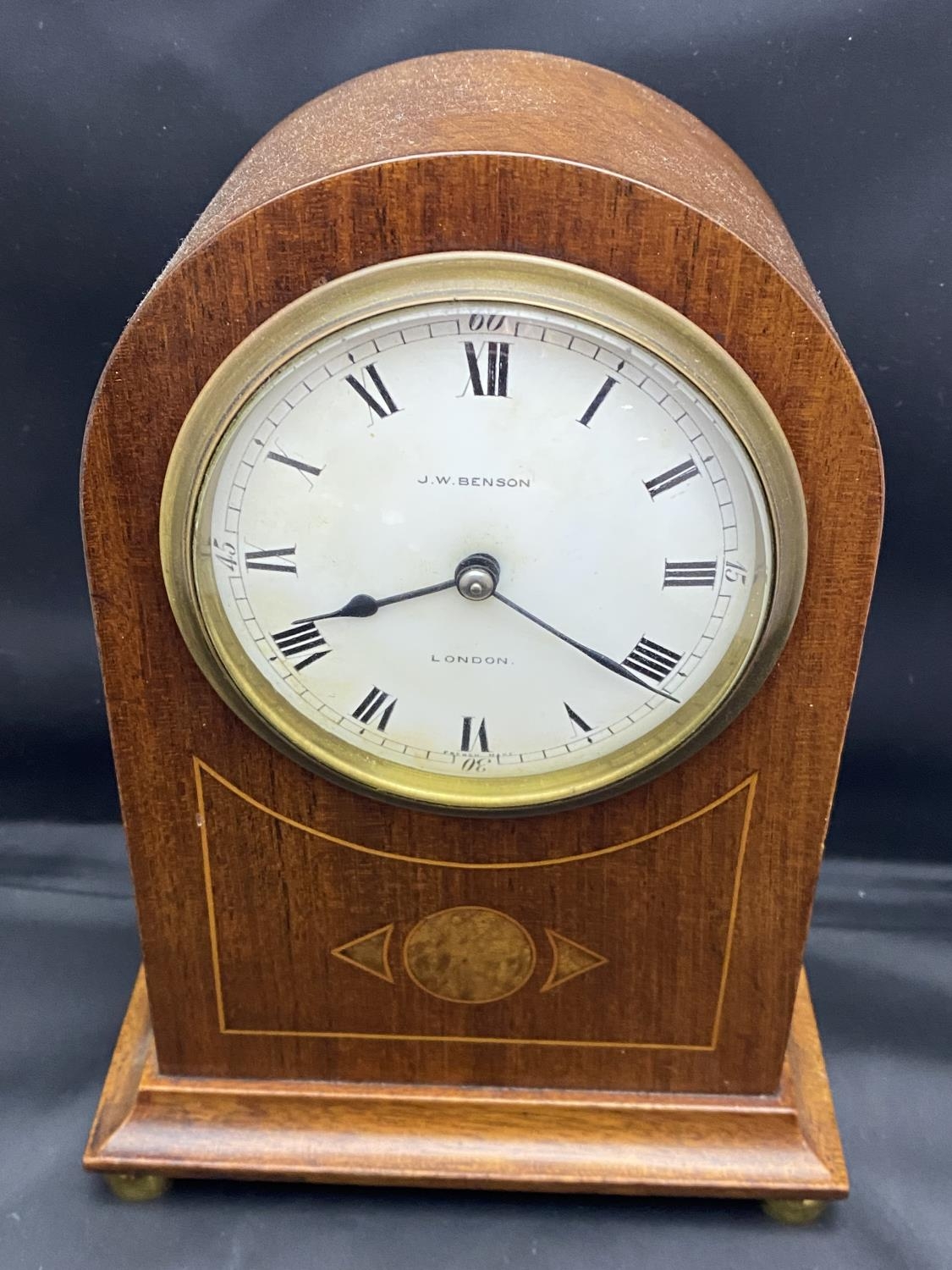 An Edwardian J W Benson wooden cased mantle clock with boxwood inlay, working