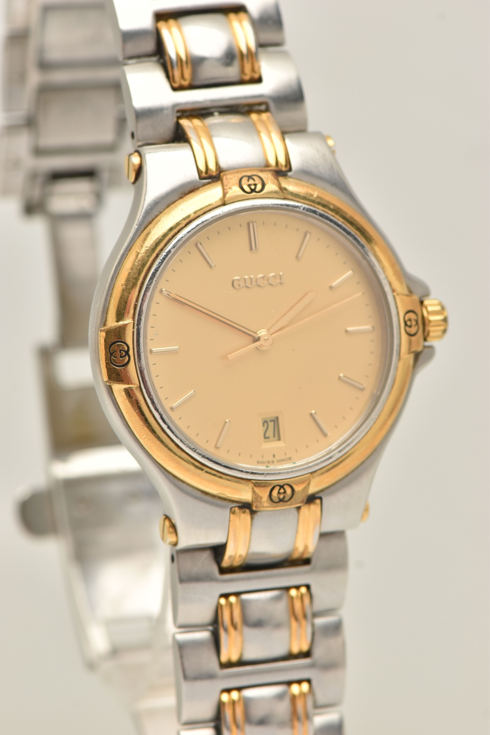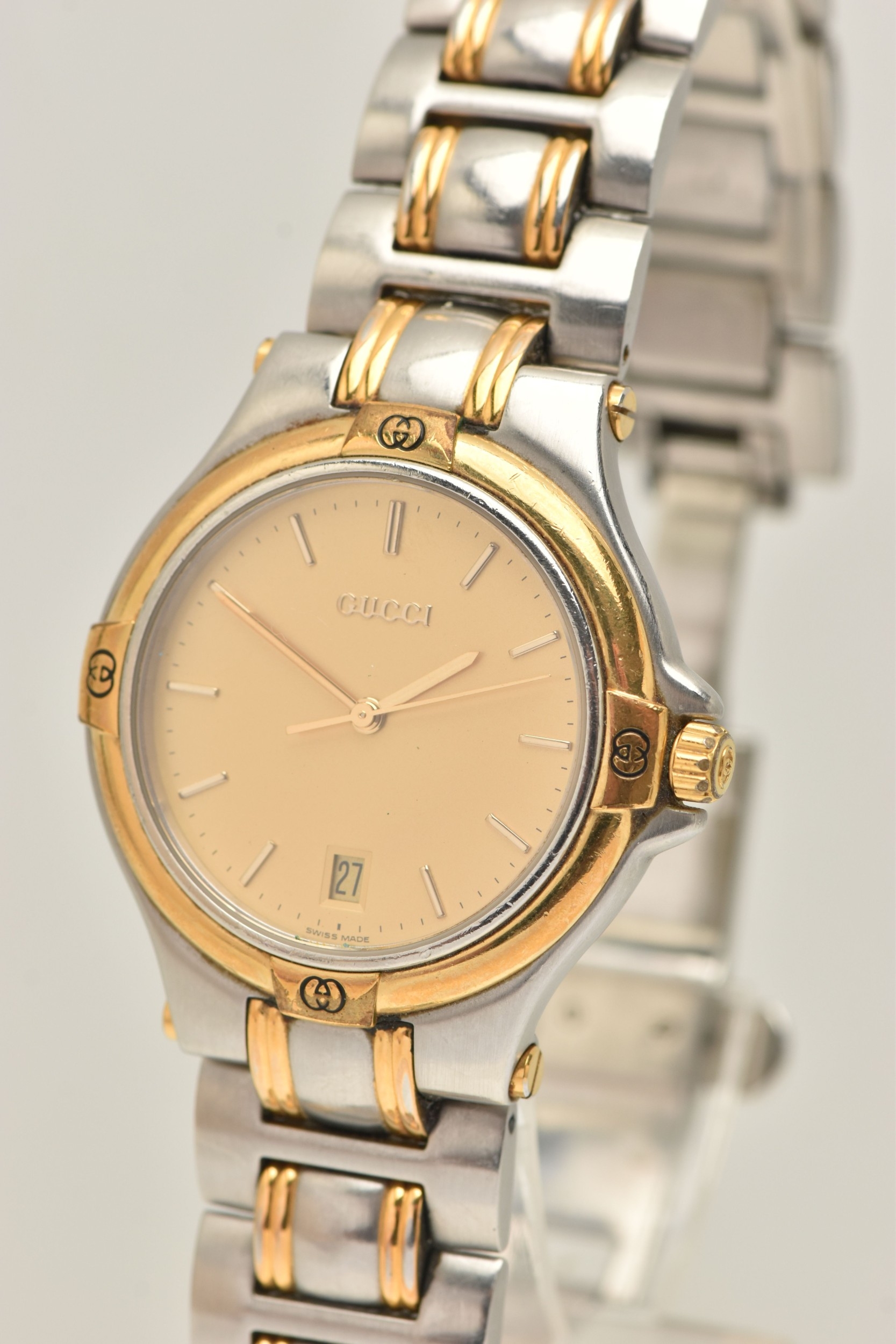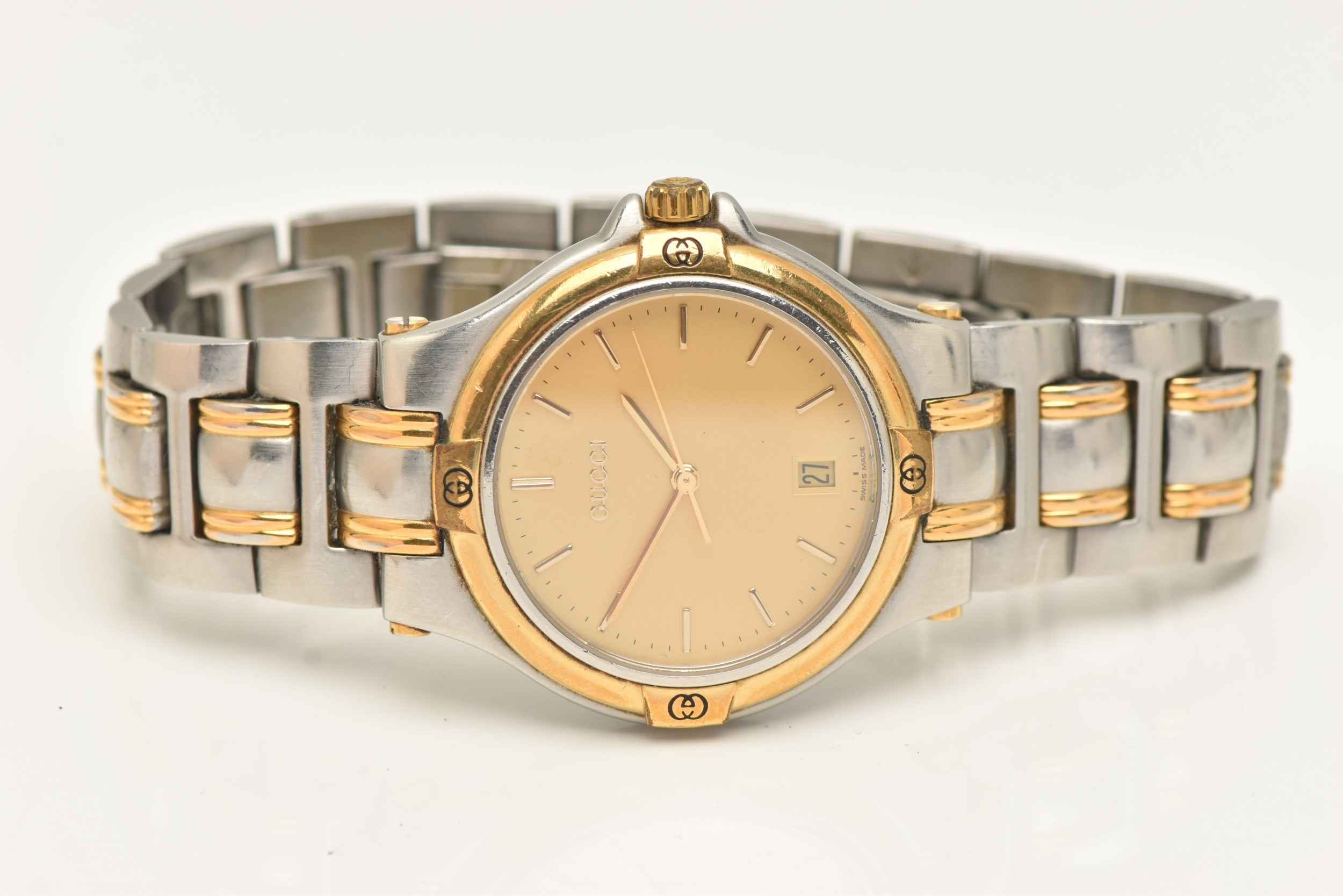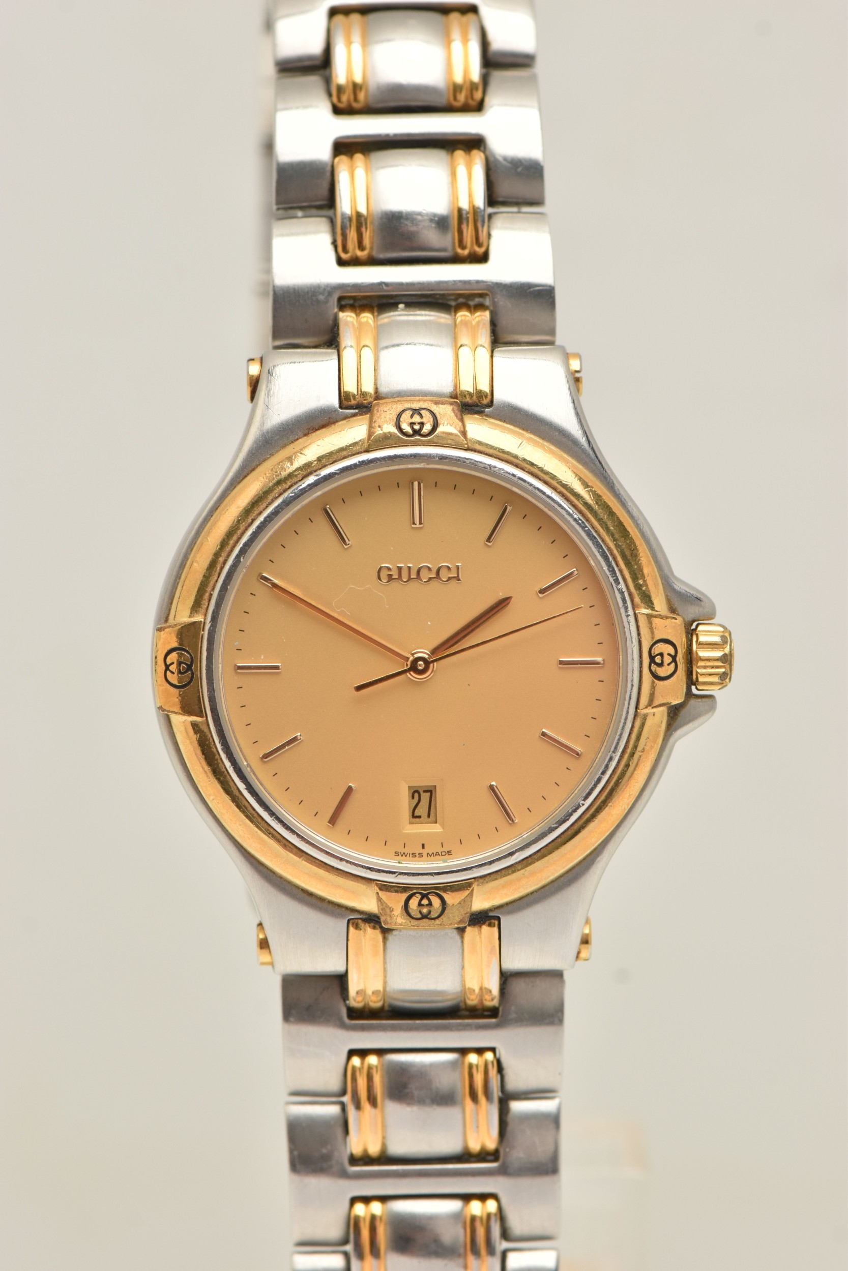 A GENTS 'GUCCI' WRISTWATCH, quartz movement, round dial signed 'Gucci', baton markers, date aperture at the six o'clock position, bi colour case, approximate case width 34mm, fitted with a bi colour bracelet and butterfly clasp, case back numbered 9040M, (condition report: general moderate wear, watch not working, we cannot guarantee the working condition of the watch)