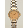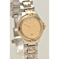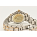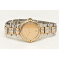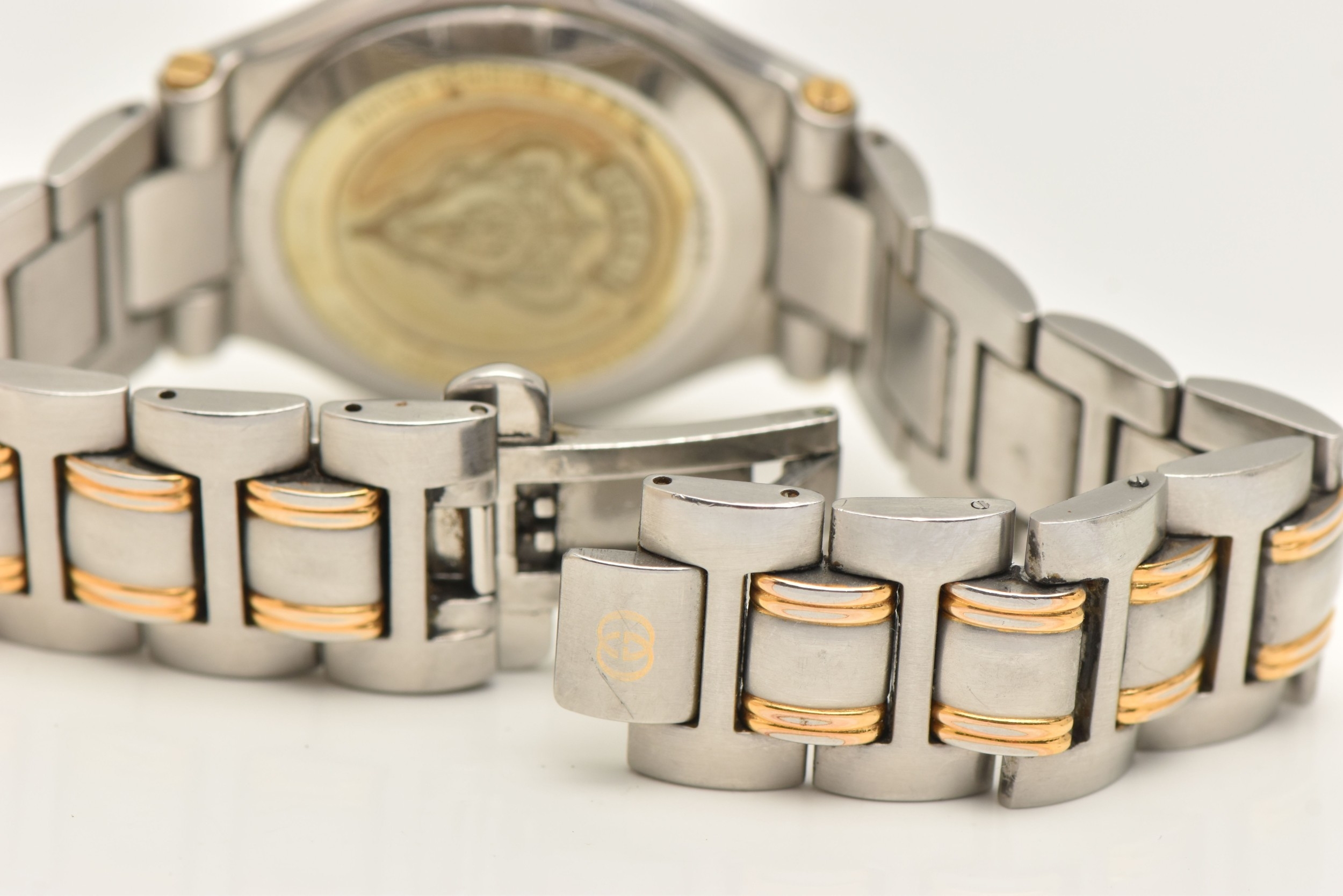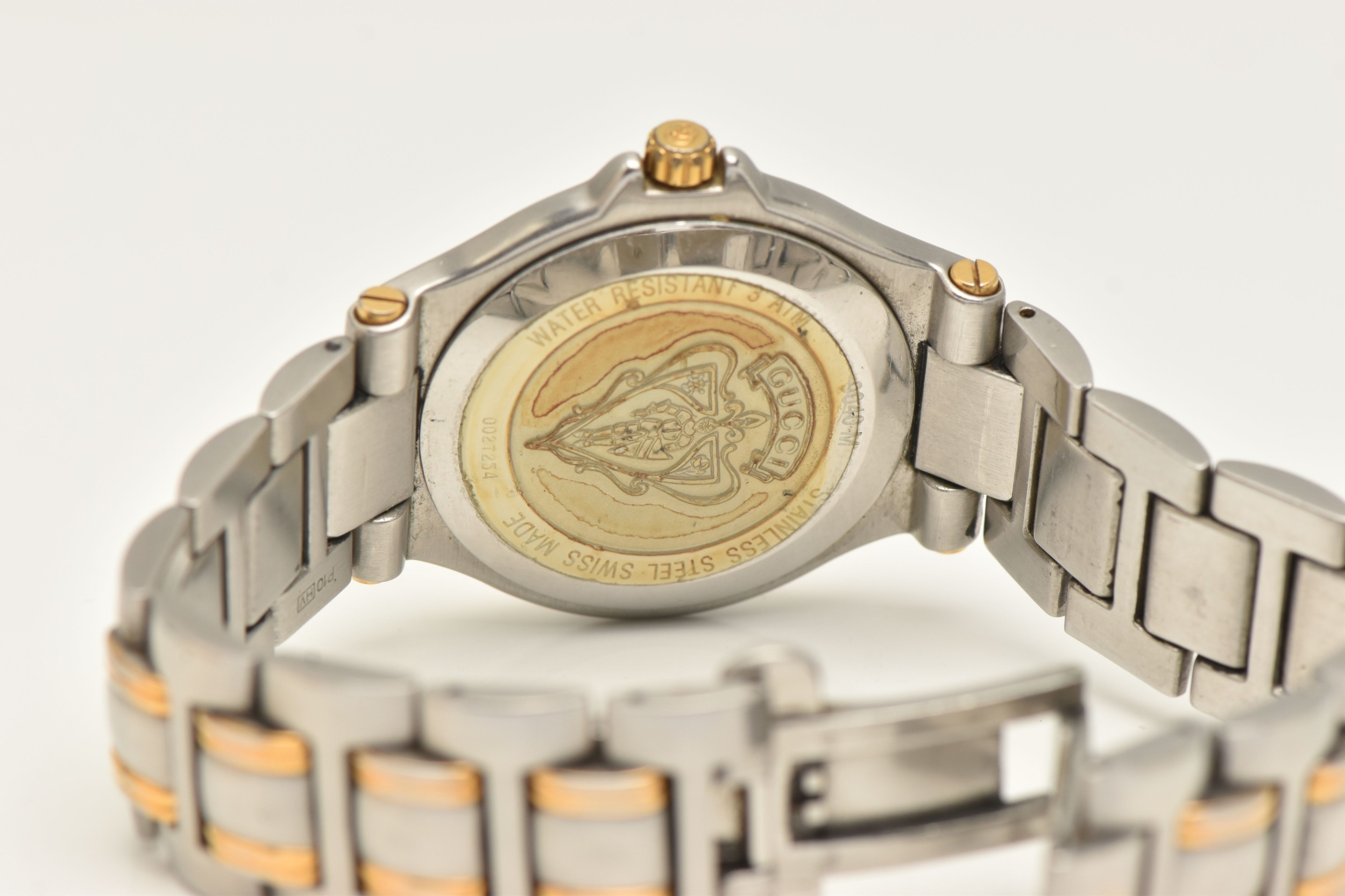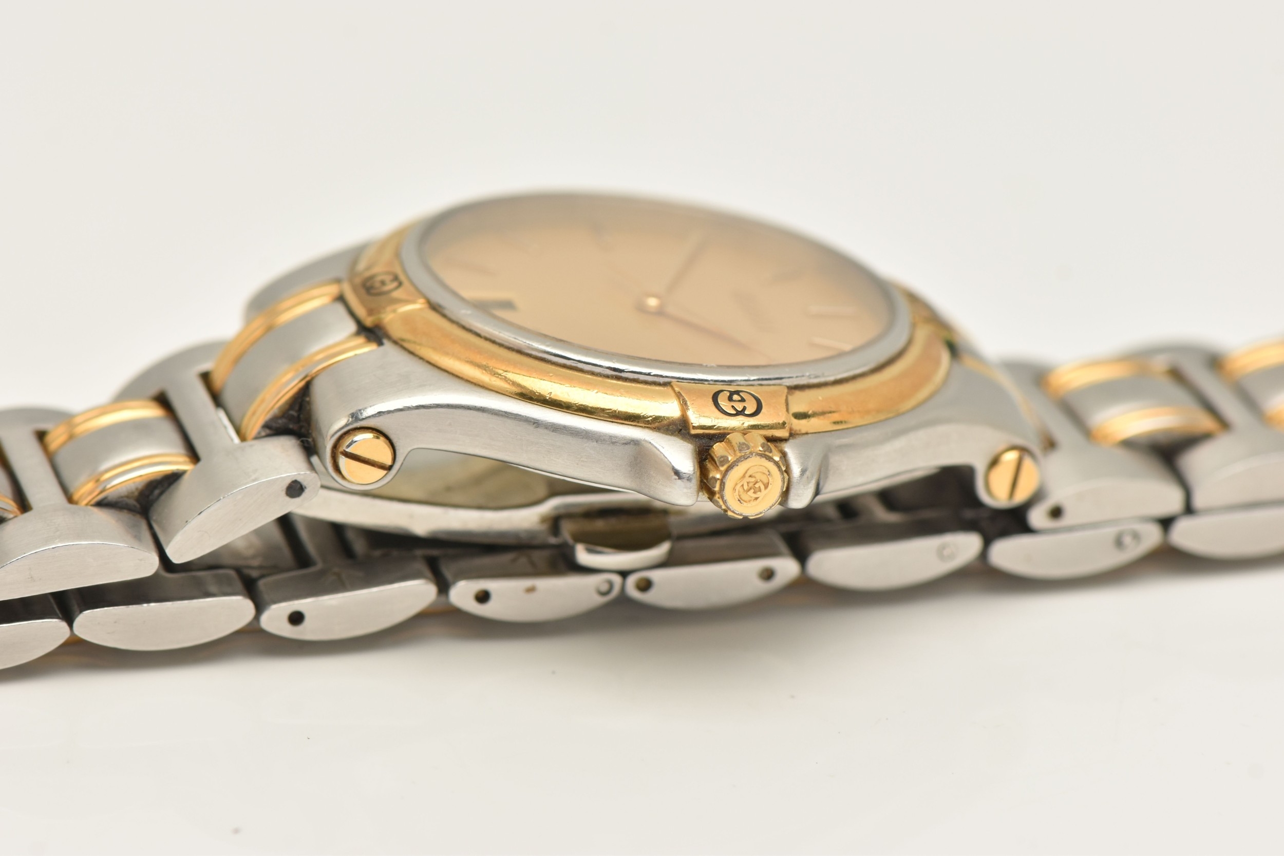 A GENTS 'GUCCI' WRISTWATCH, quartz movement, round dial signed 'Gucci', baton markers, date aperture at the six o'clock position, bi colour case, approximate case width 34mm, fitted with a bi colour bracelet and butterfly clasp, case back numbered 9040M, (condition report: general moderate wear, watch not working, we cannot guarantee the working condition of the watch)