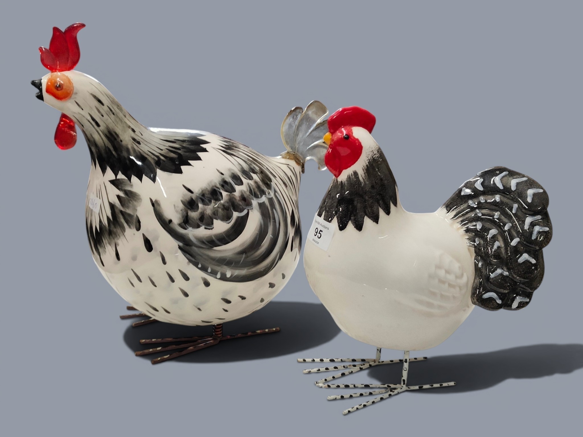 2 DESIGNER GLASS BIRDS AND ROOSTERS