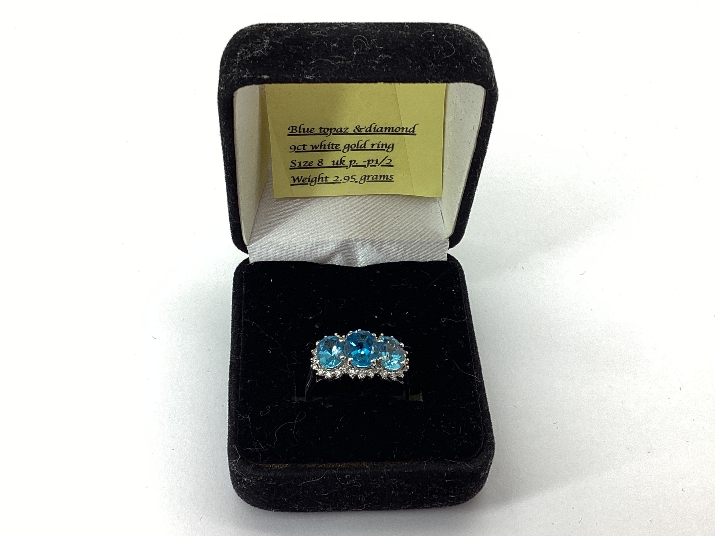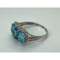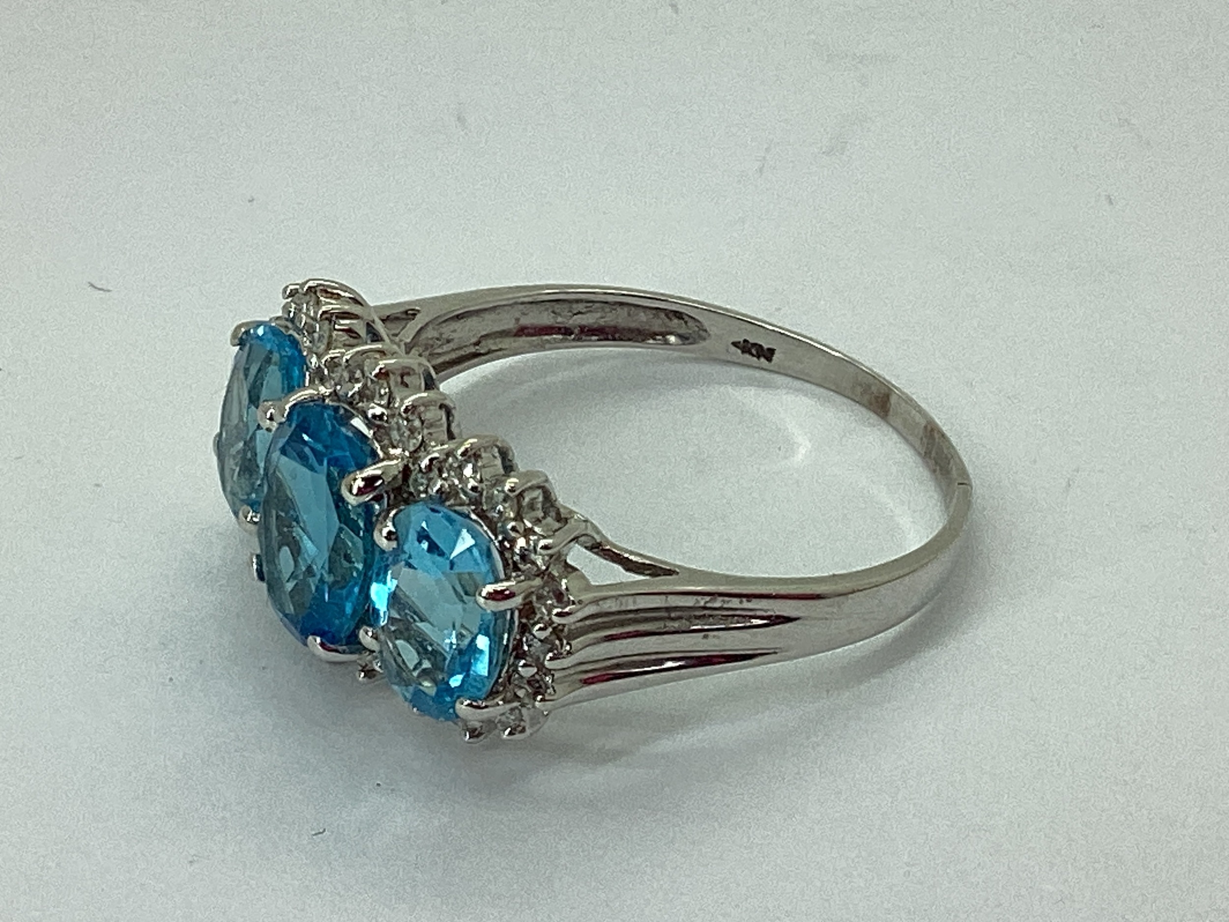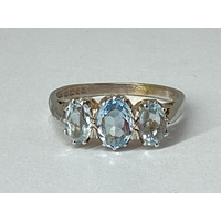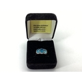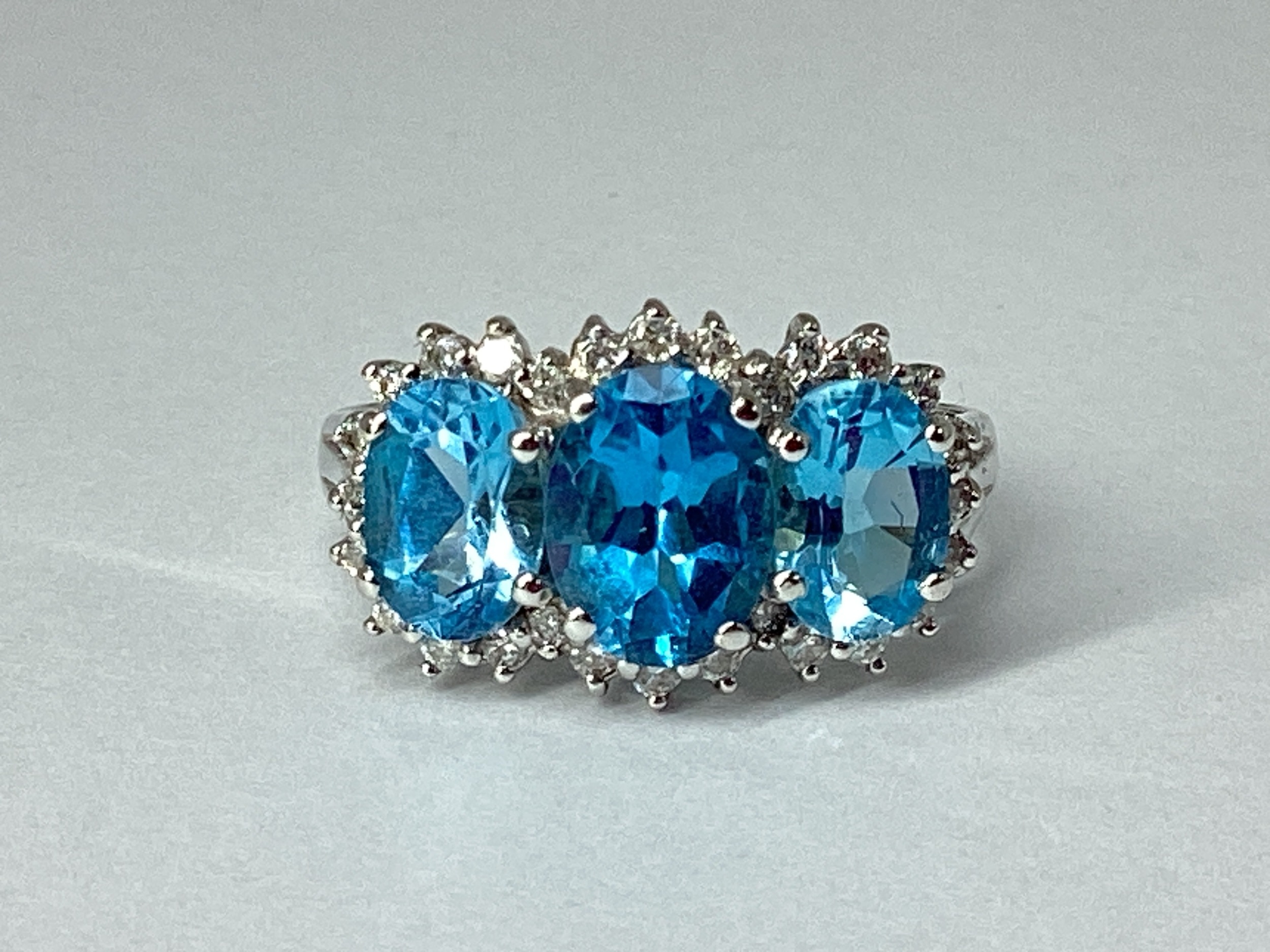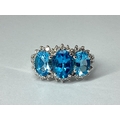 A Blue Topaz and Diamond Triple Cluster Ring, claw set throughout, between reeded shoulders, indistinctly stamped (finger size Q).