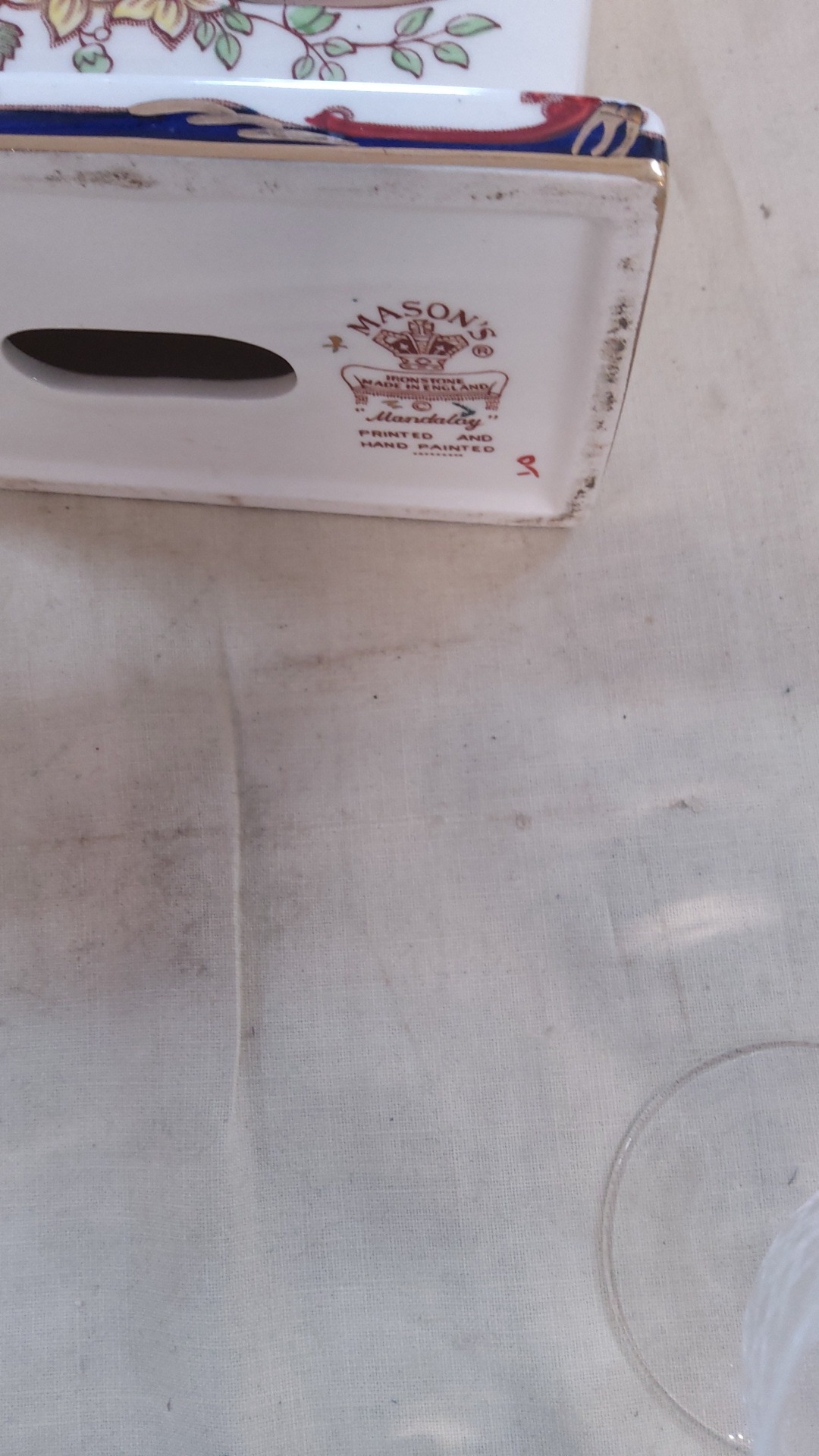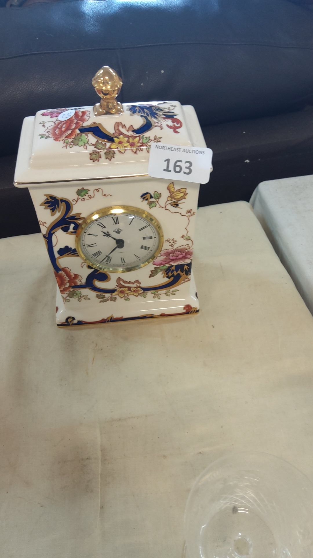 Mason’s ironstone mantel clock in the “Mandalay” pattern, printed and hand-painted with scrolling foliage and peony blooms, the square case mounted with a gilt finial and fitted with a Roman numeral dial behind a gilt bezel.