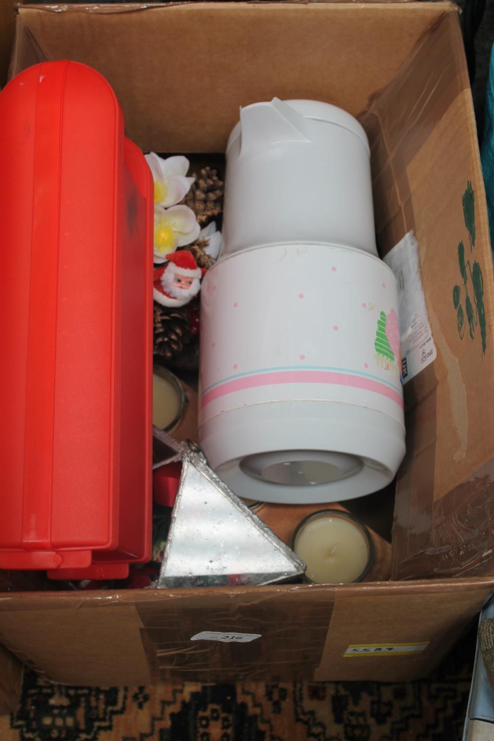 BOX OF XMAS DECORATIONS & CANDLES