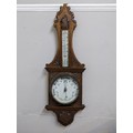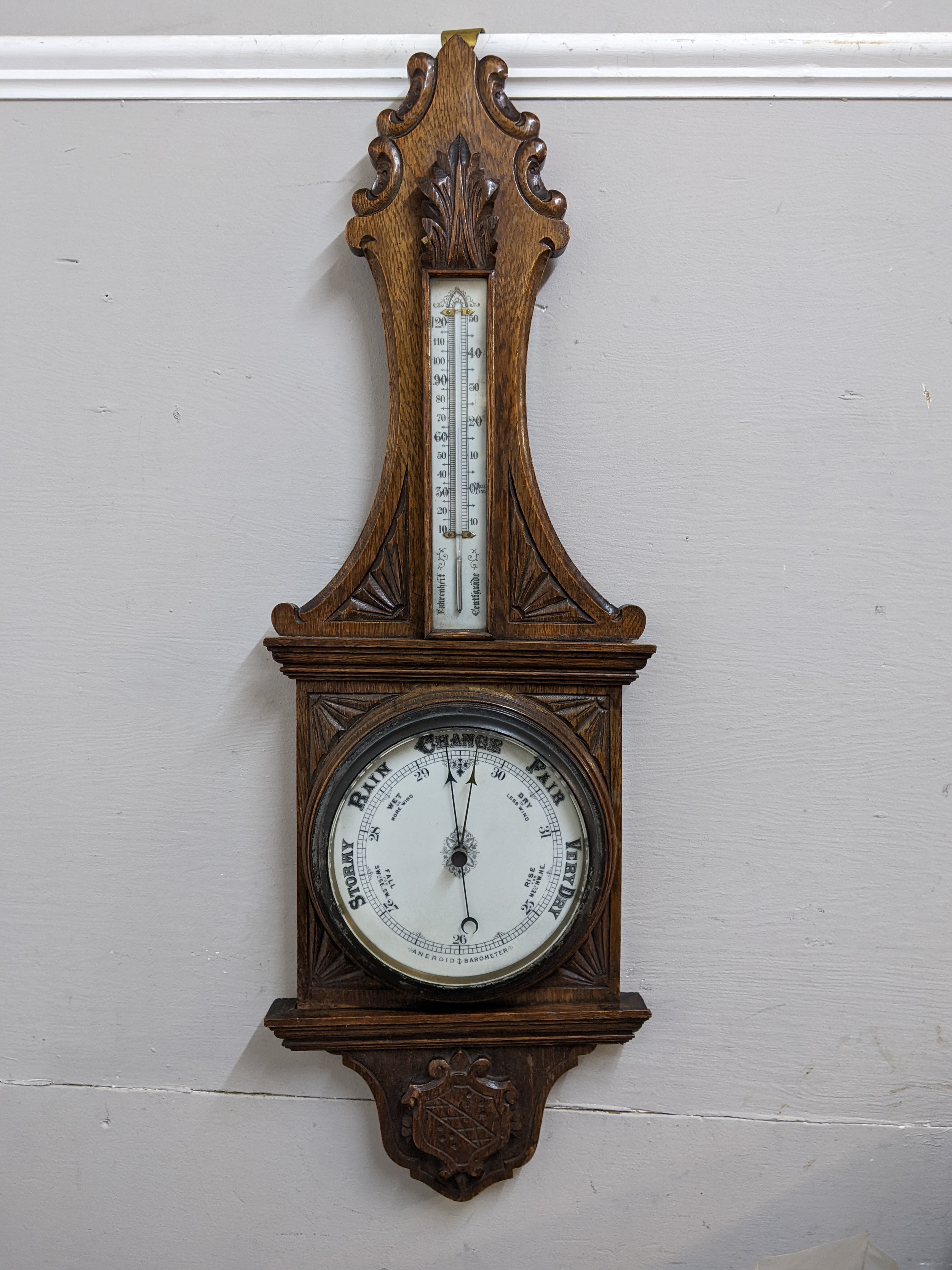 An early 20th century oak barometer with carved ornament and a thermometerLocation: