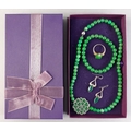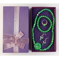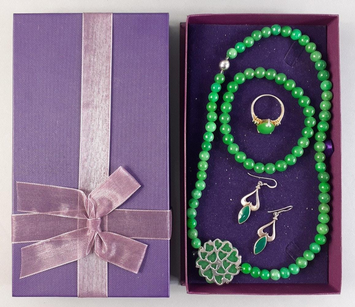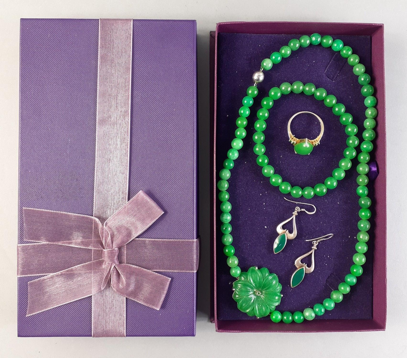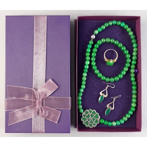 A suite of jade style silver mounted jewellery to include necklace, bracelet, earrings and ring.