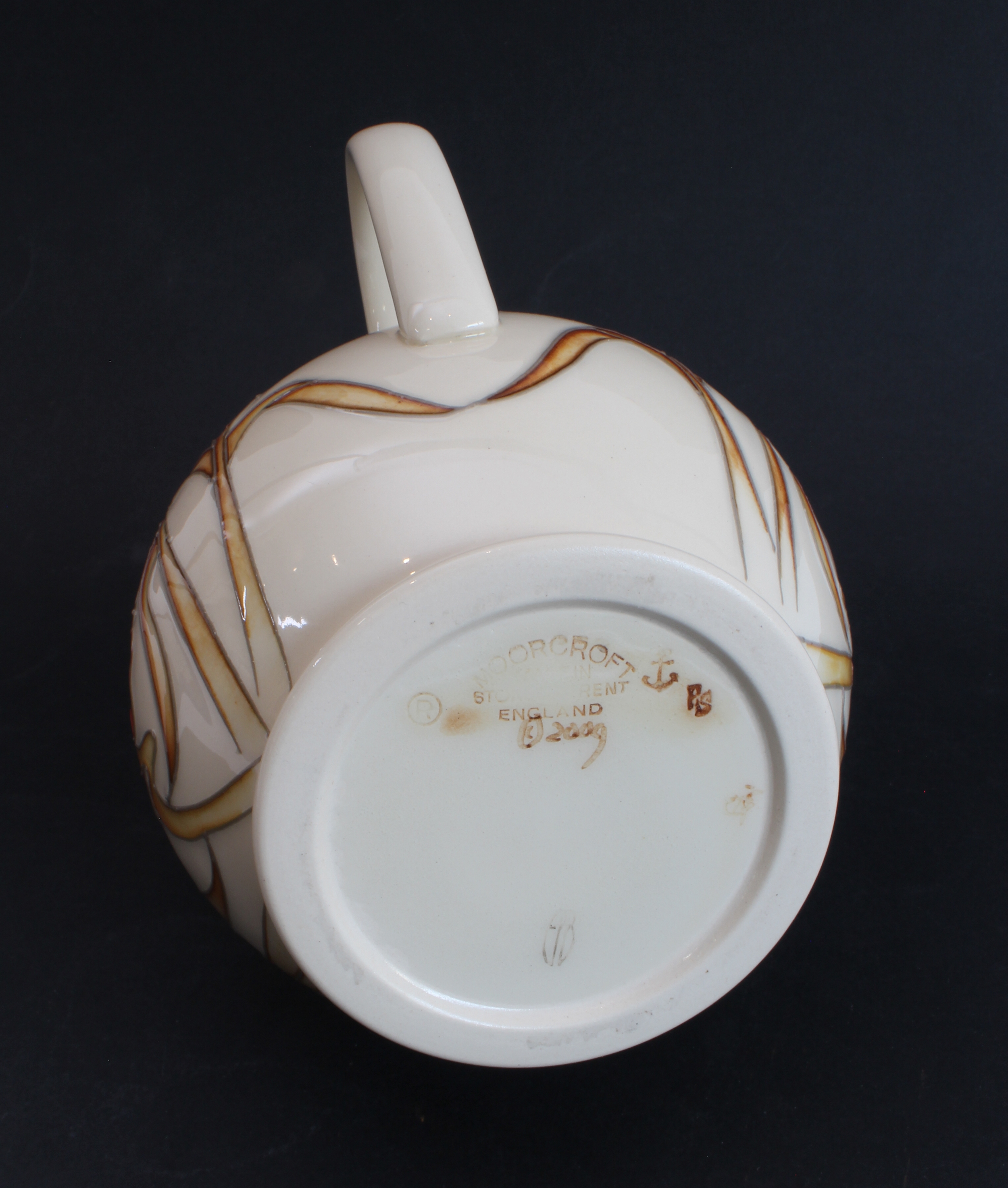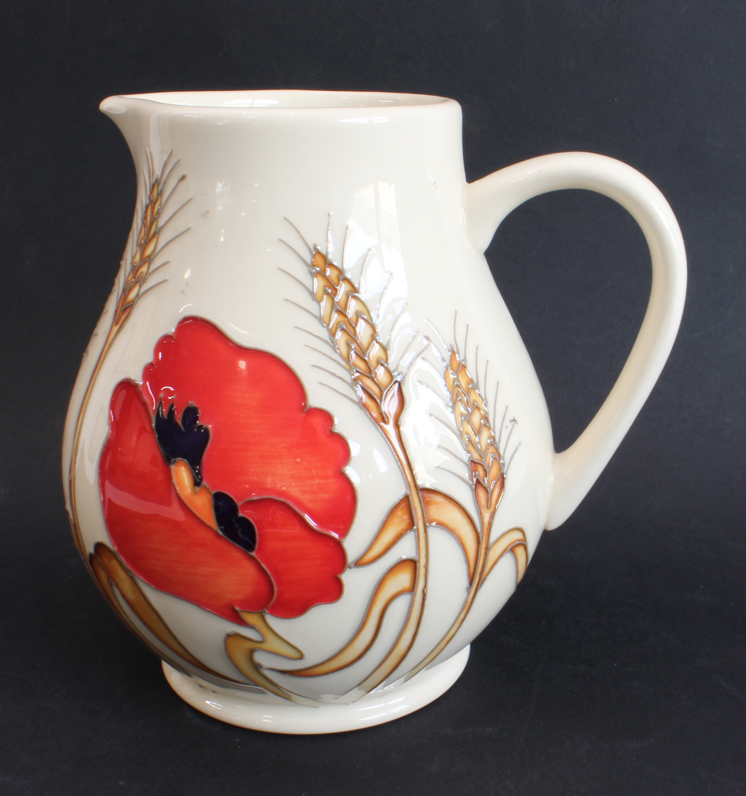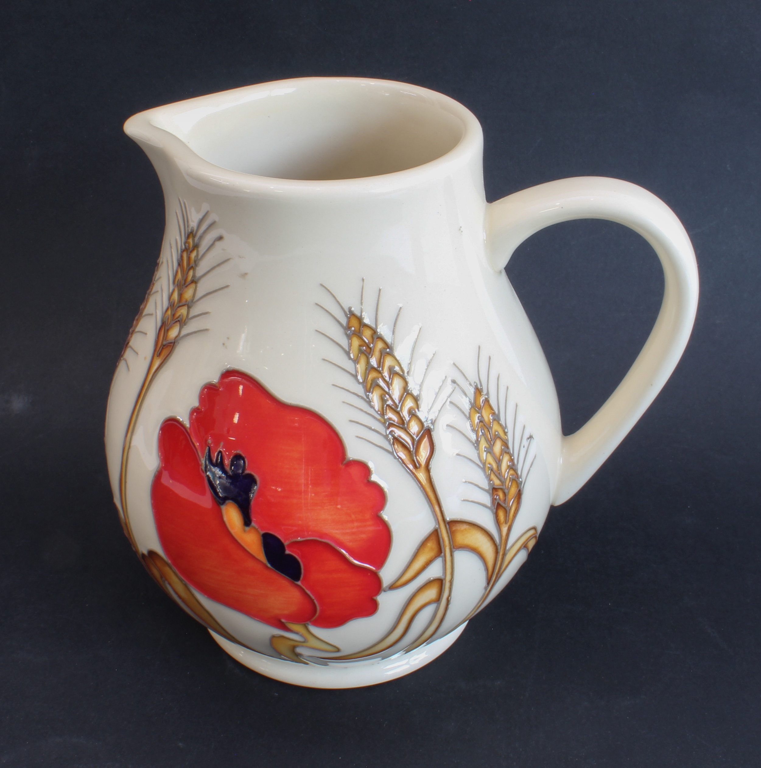 A modern Moorcroft pottery jug of of Art Nouveau inspiration: baluster form, decorated with poppies and ears of corn; impressed and painted marks to underside, dated 2009. (14.5 cm high)
