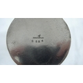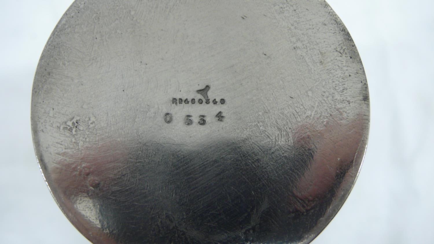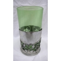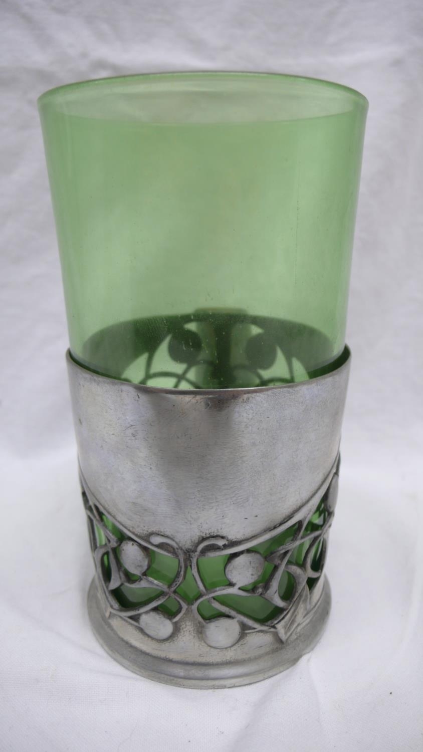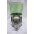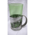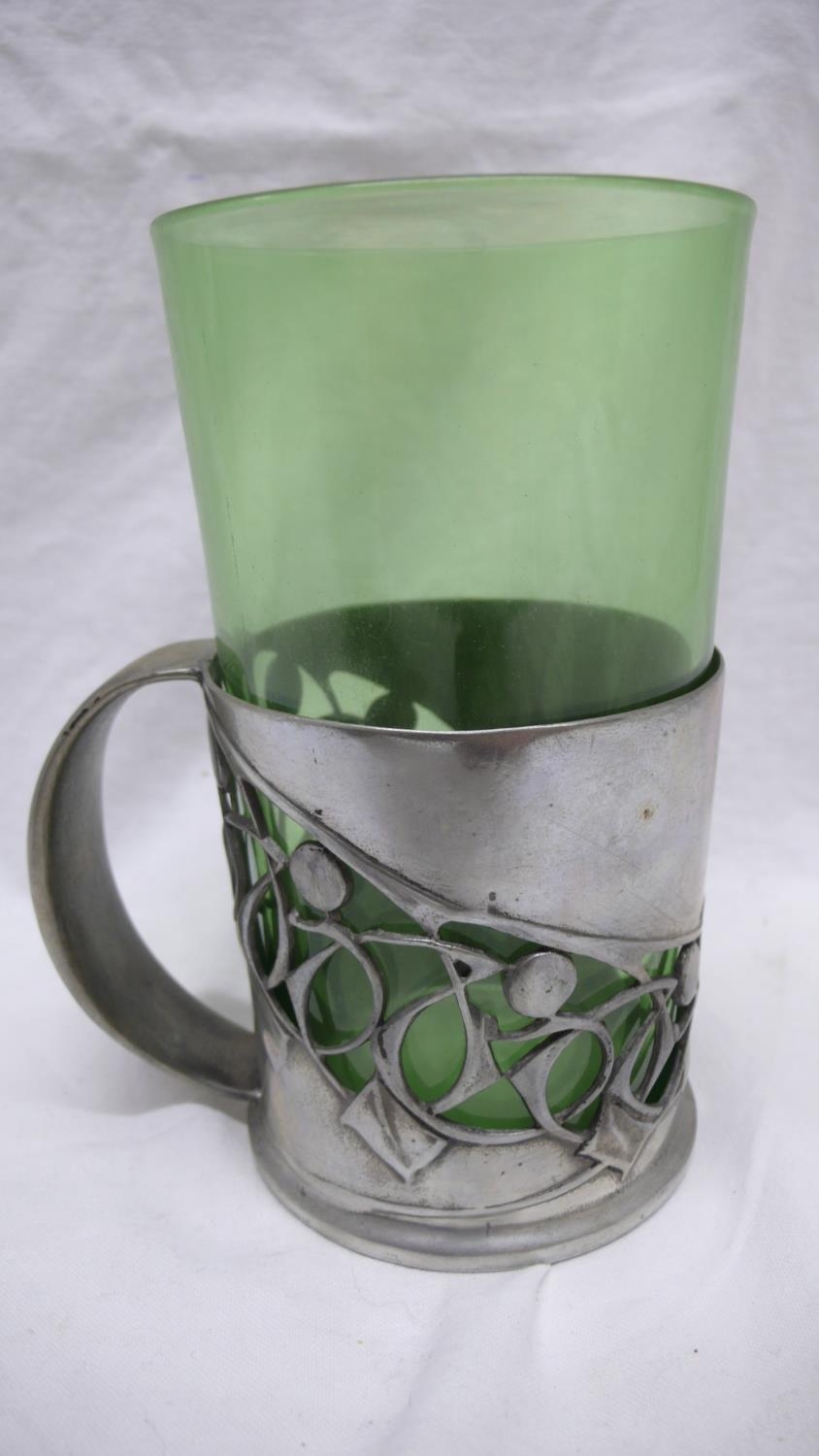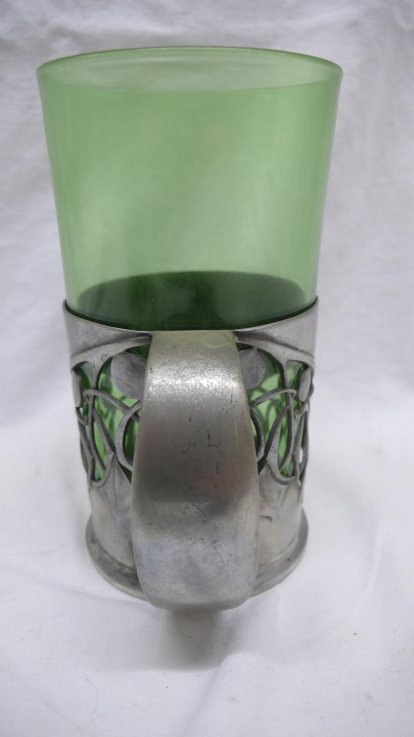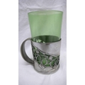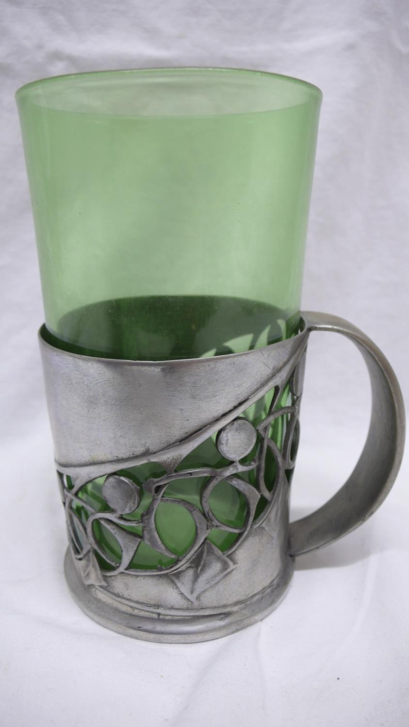 Archibald Knox for Liberty & Co. Pewter hot milk holder with D shaped handle, pierced decoration with five stylized leaves and berries and a green glass liner, No. 0534, Ht. 14 cms