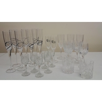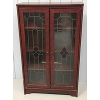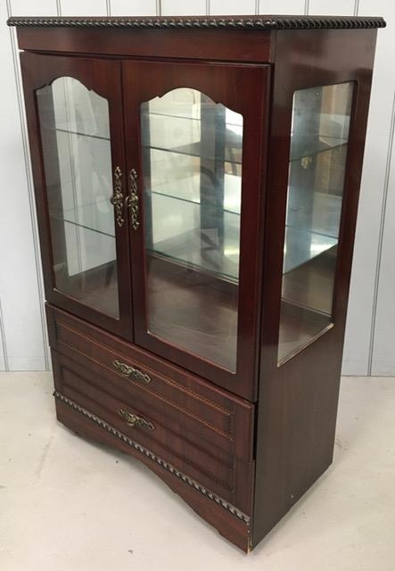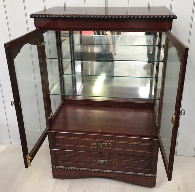 A reproduction, mahogany coloured glazed display cabinet. Features a display area with two internal glass shelves, over twin drawers. Dimensions(cm) H125, W81, D44.