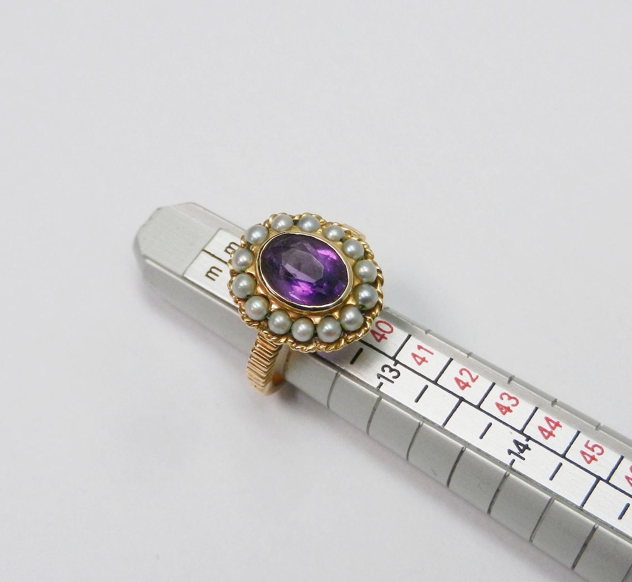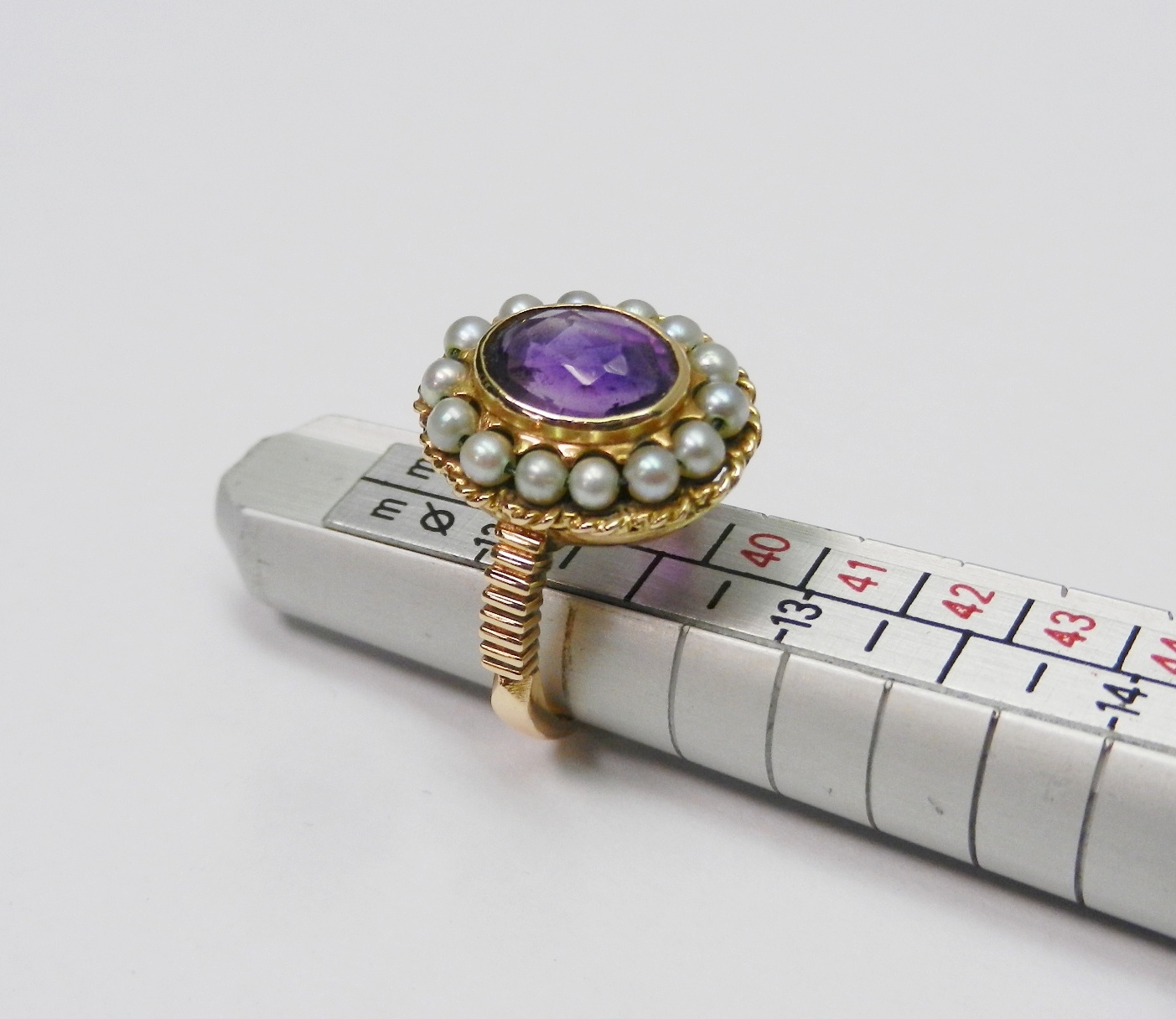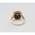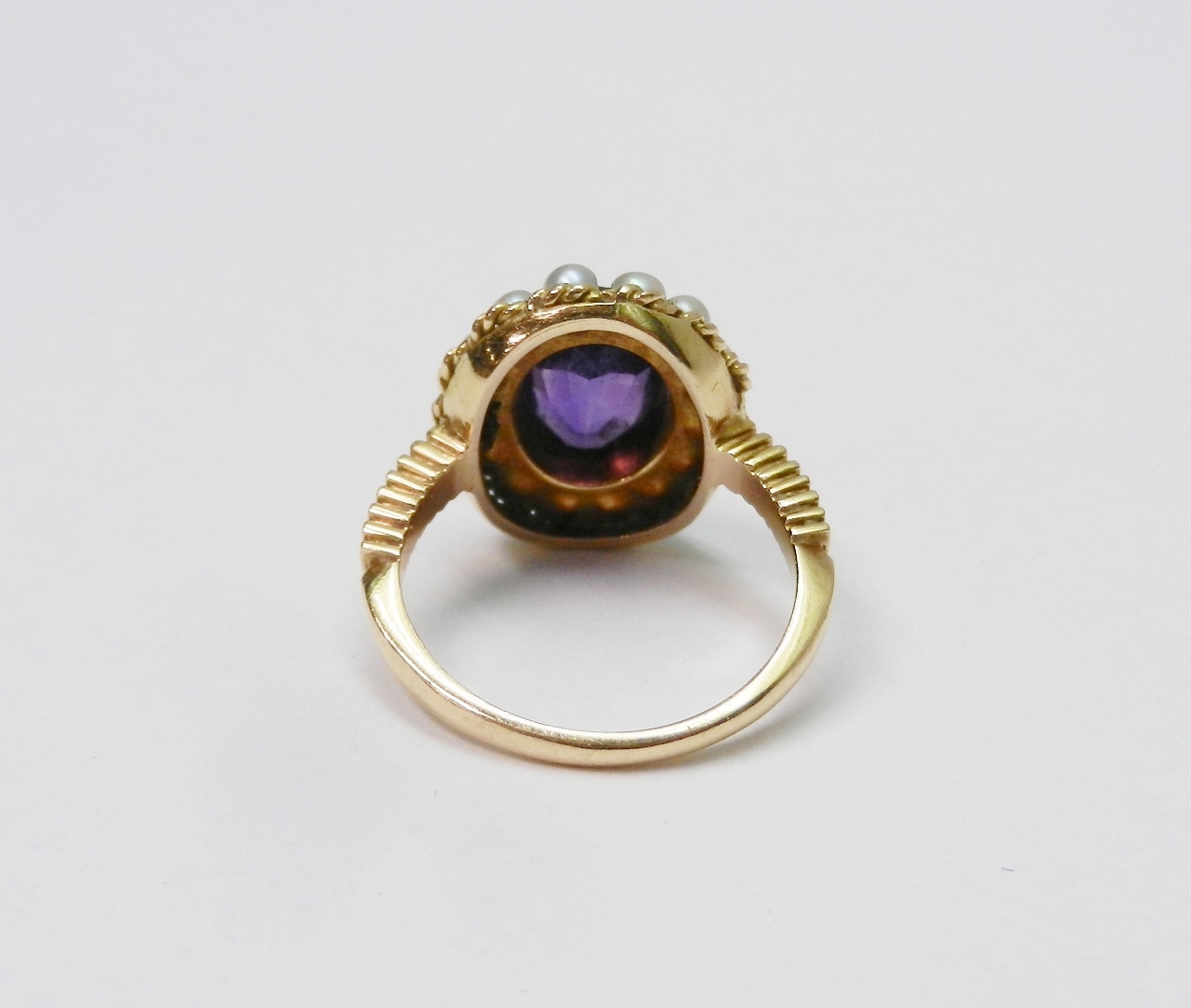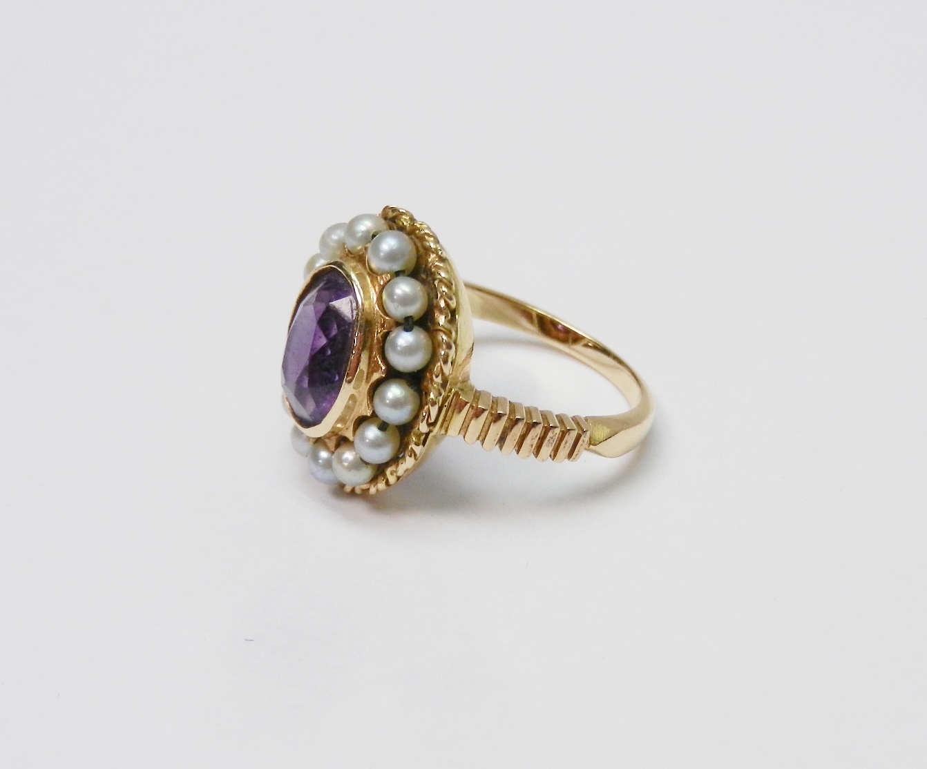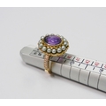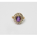 A Georgian style cluster ring comprising a central amethyst surrounded by a halo of strung pearls in an unmarked yellow metal open back setting. Head approx 16 x 13mm oval / central stone approx 8.5 x 6.5mm oval / size L. The ring weighs 4.5g gross - please note no guarantee as to its metal composition is offered or suggested by Wombell's Auctioneers as it not hallmarked.