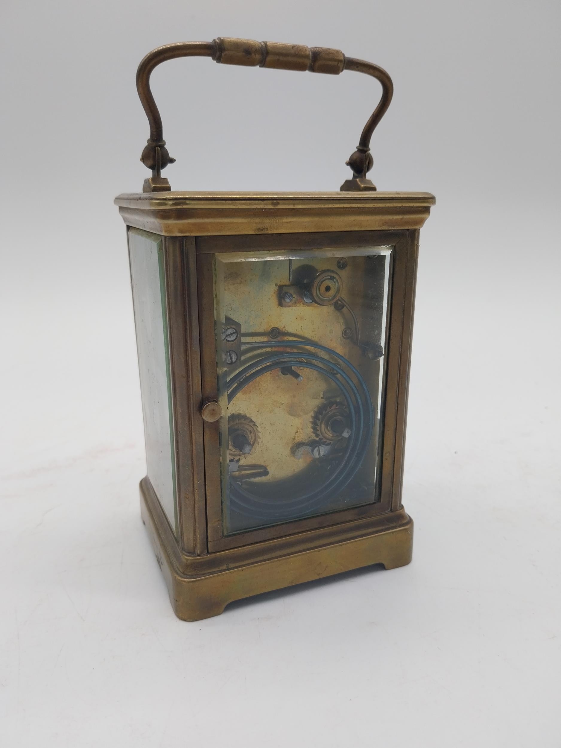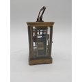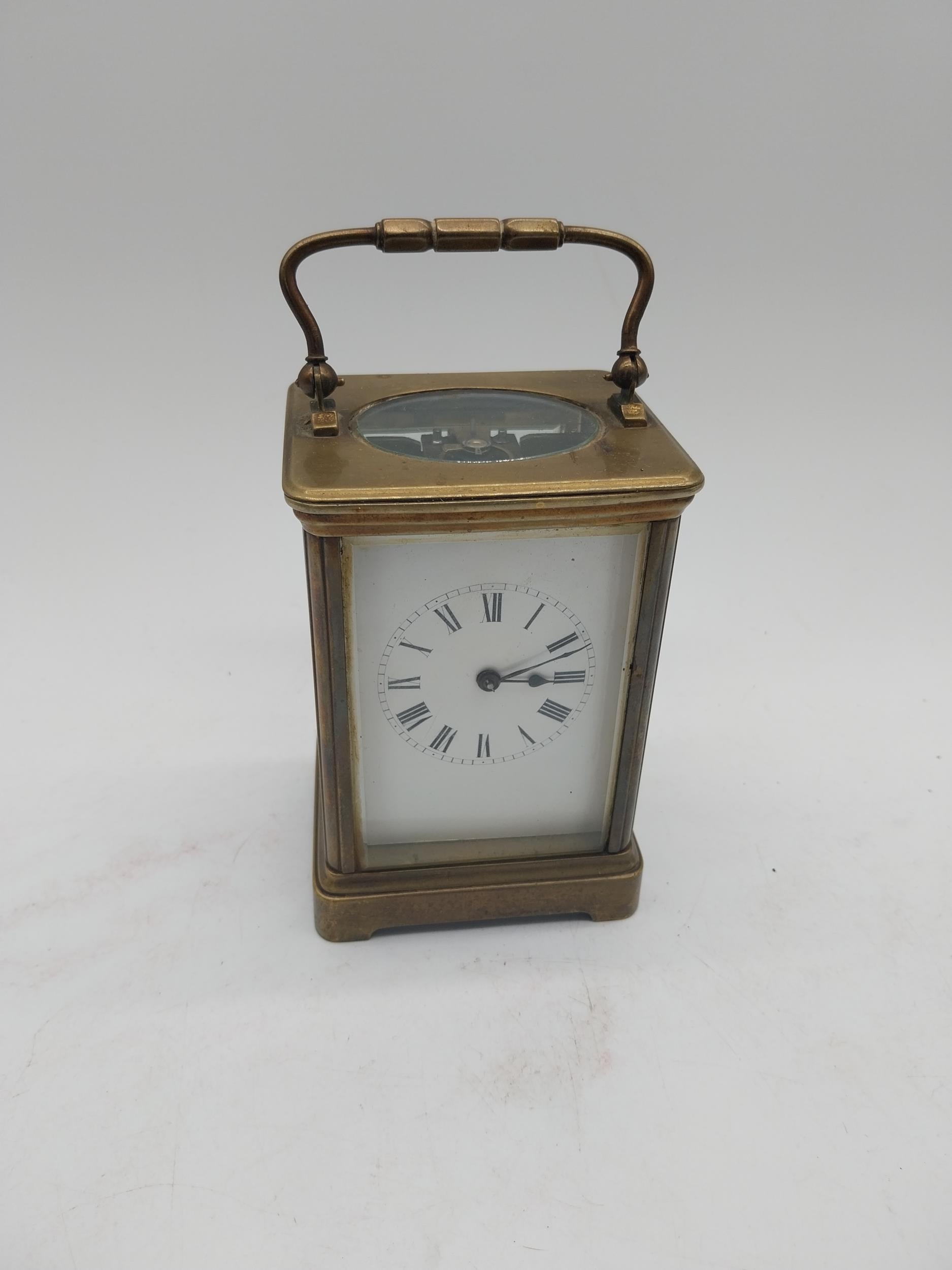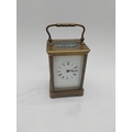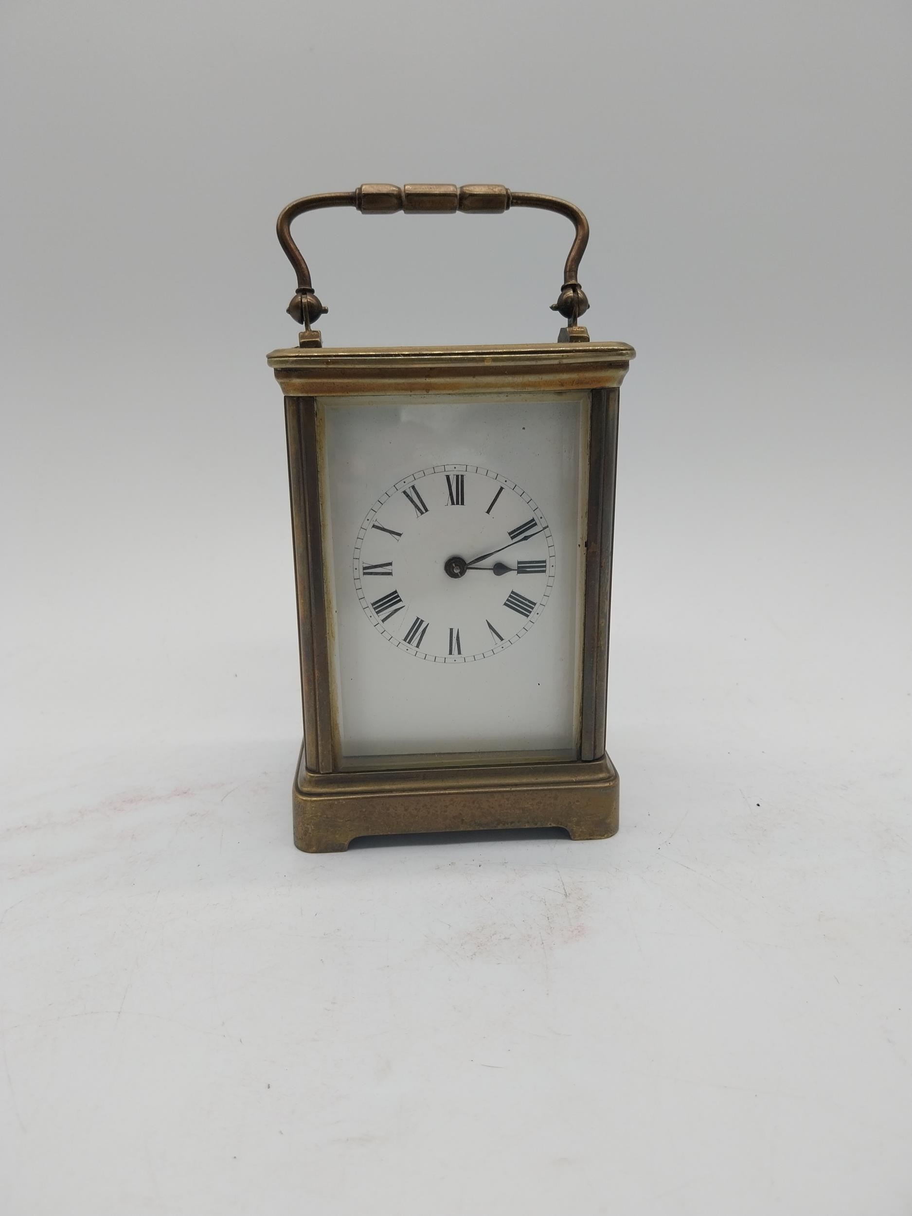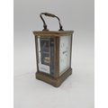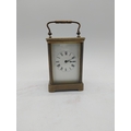 19th C. brass carriage clock with white enamel dial {18 cm H x 9 cm W x 8 cm D}.