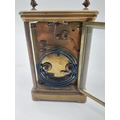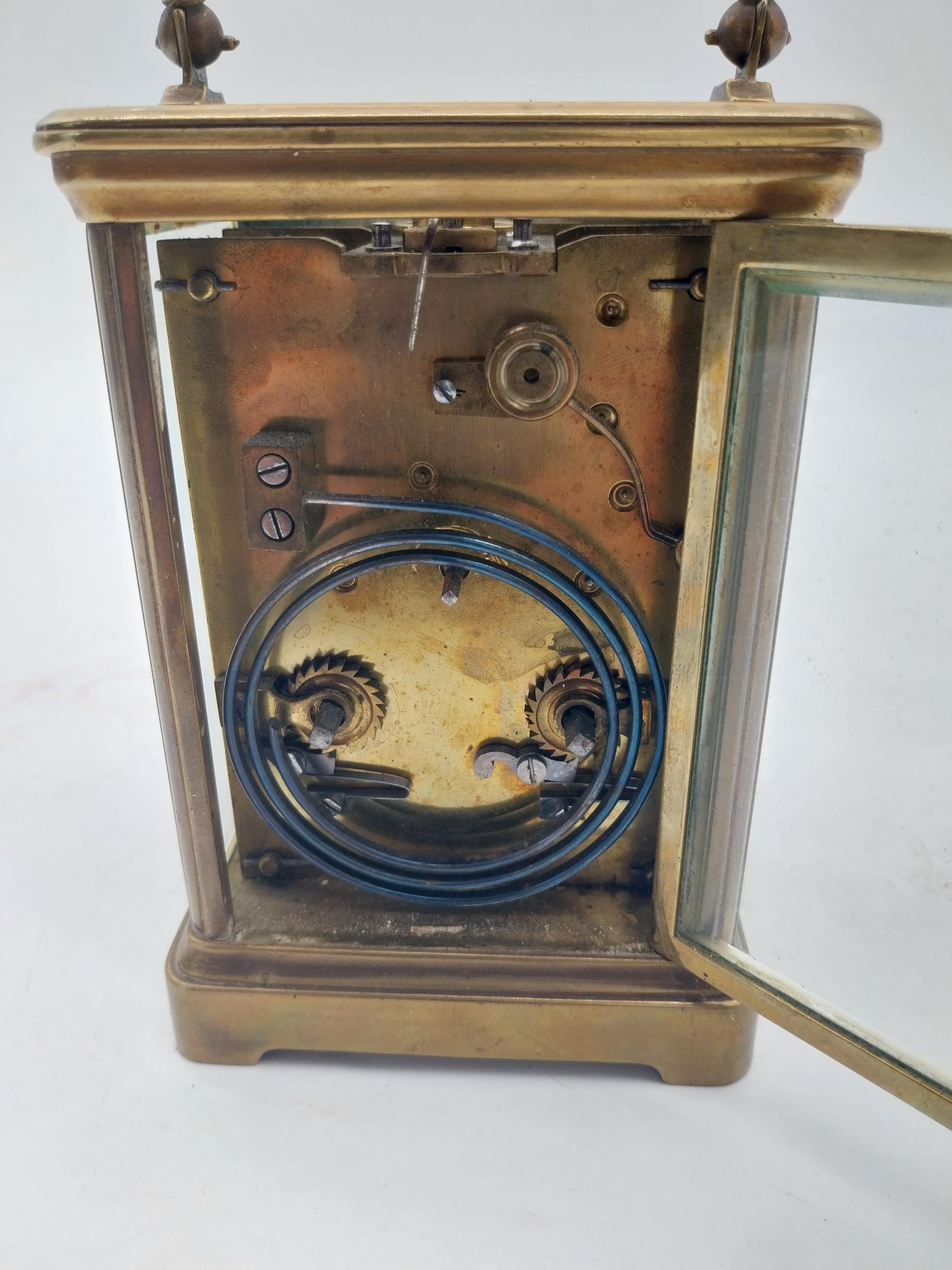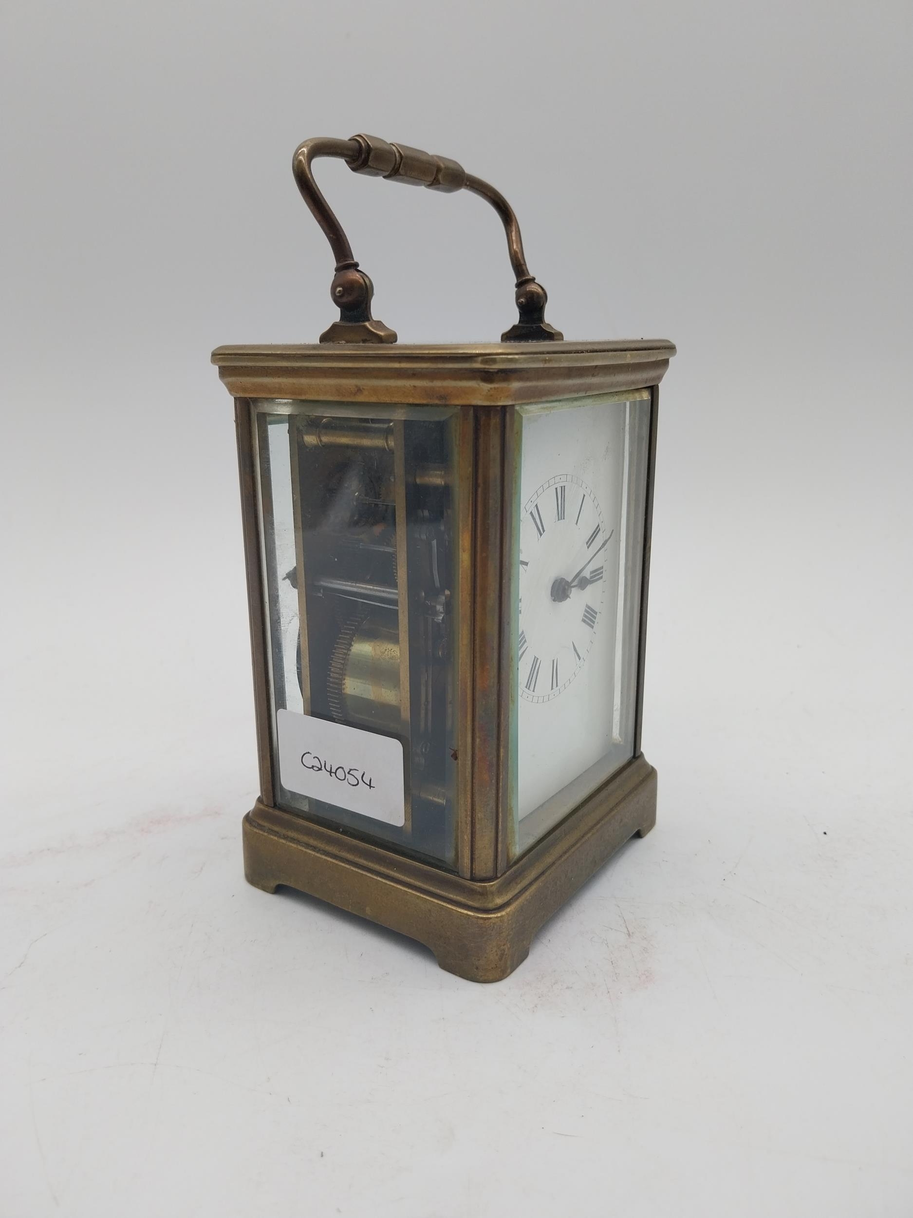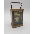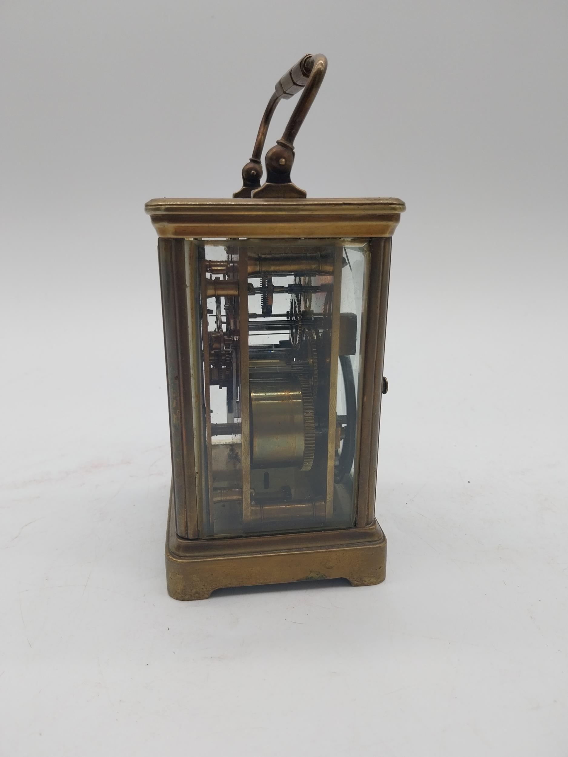 19th C. brass carriage clock with white enamel dial {18 cm H x 9 cm W x 8 cm D}.