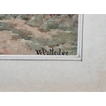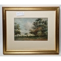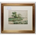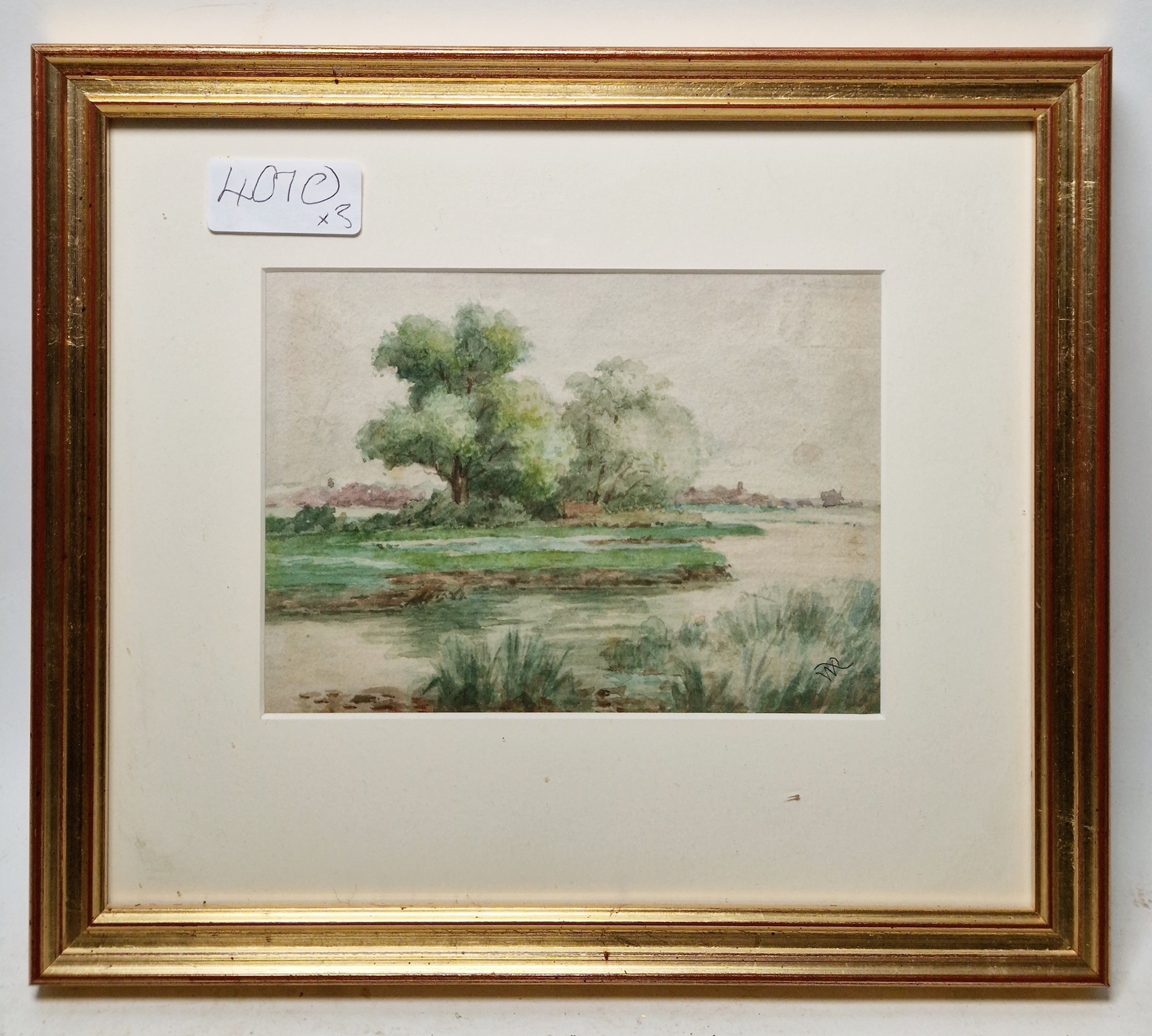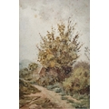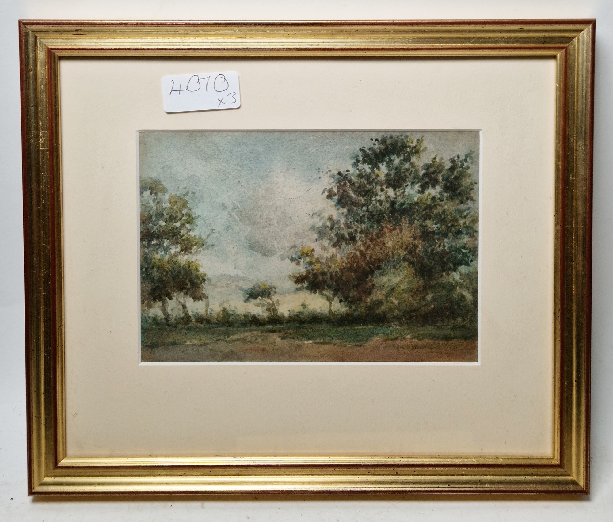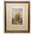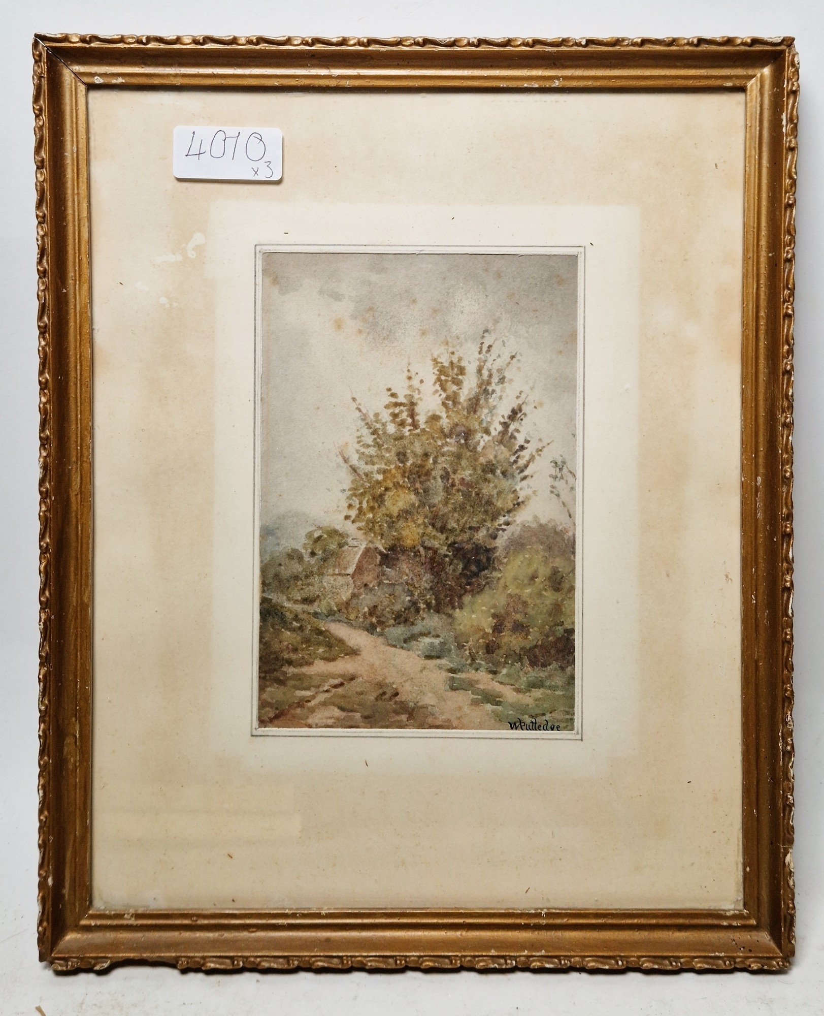 Rural scene with dwelling and tree next to track, signed lower right, framed and glazed, mount aperture 15.5cm x 10.5cm, together with two further small watercolour landscapes by the same hand (3)