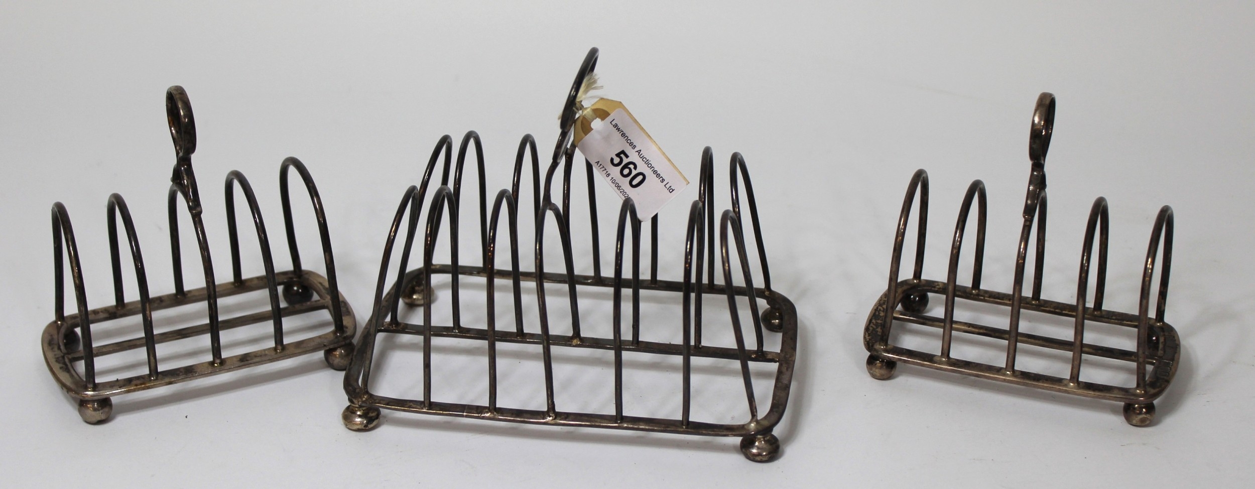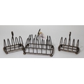 Early 19th Century silver six division toast rack (at fault), together with a pair of similar later toast racks, 18oz t