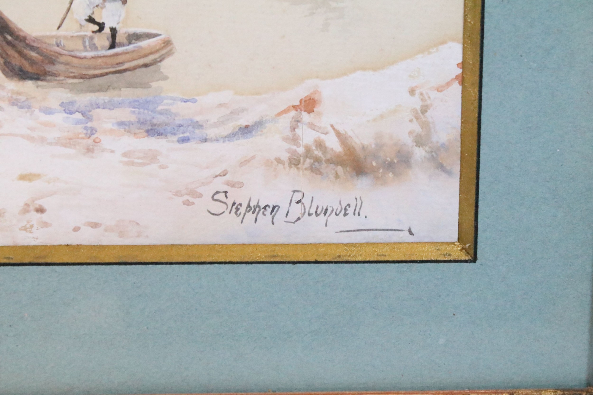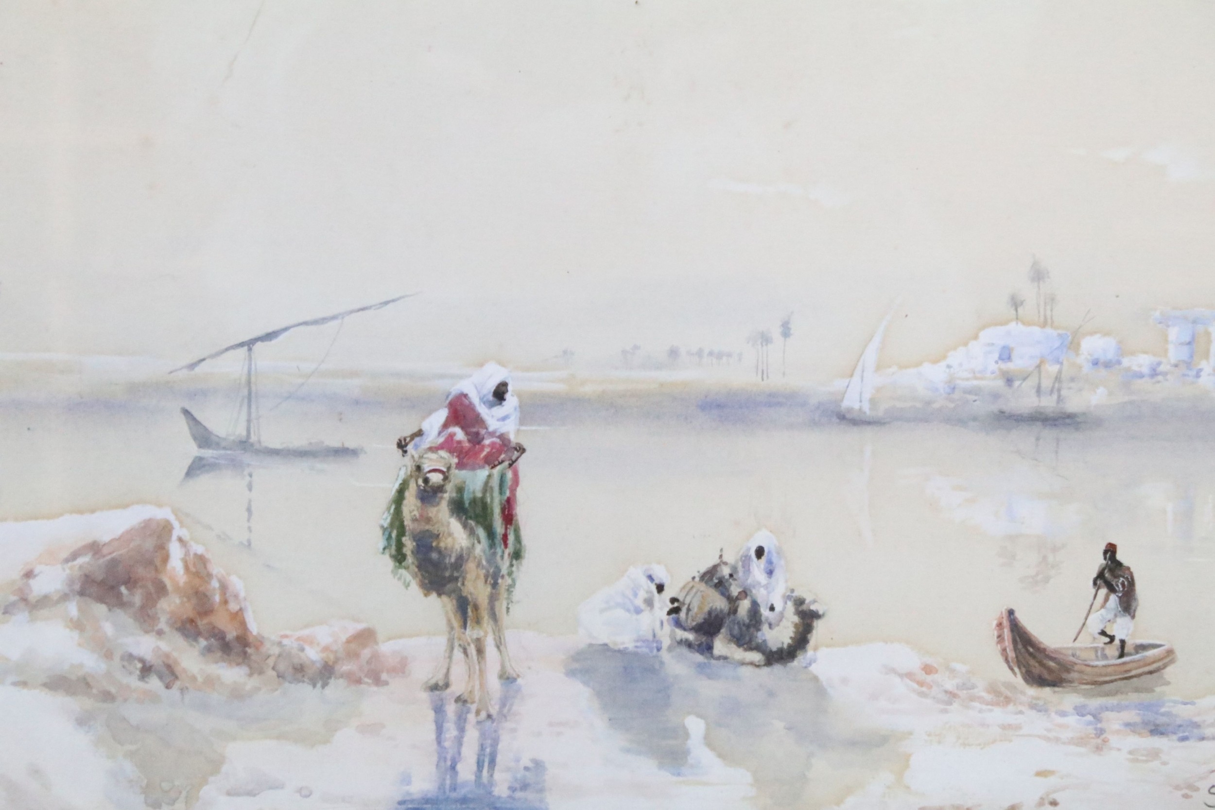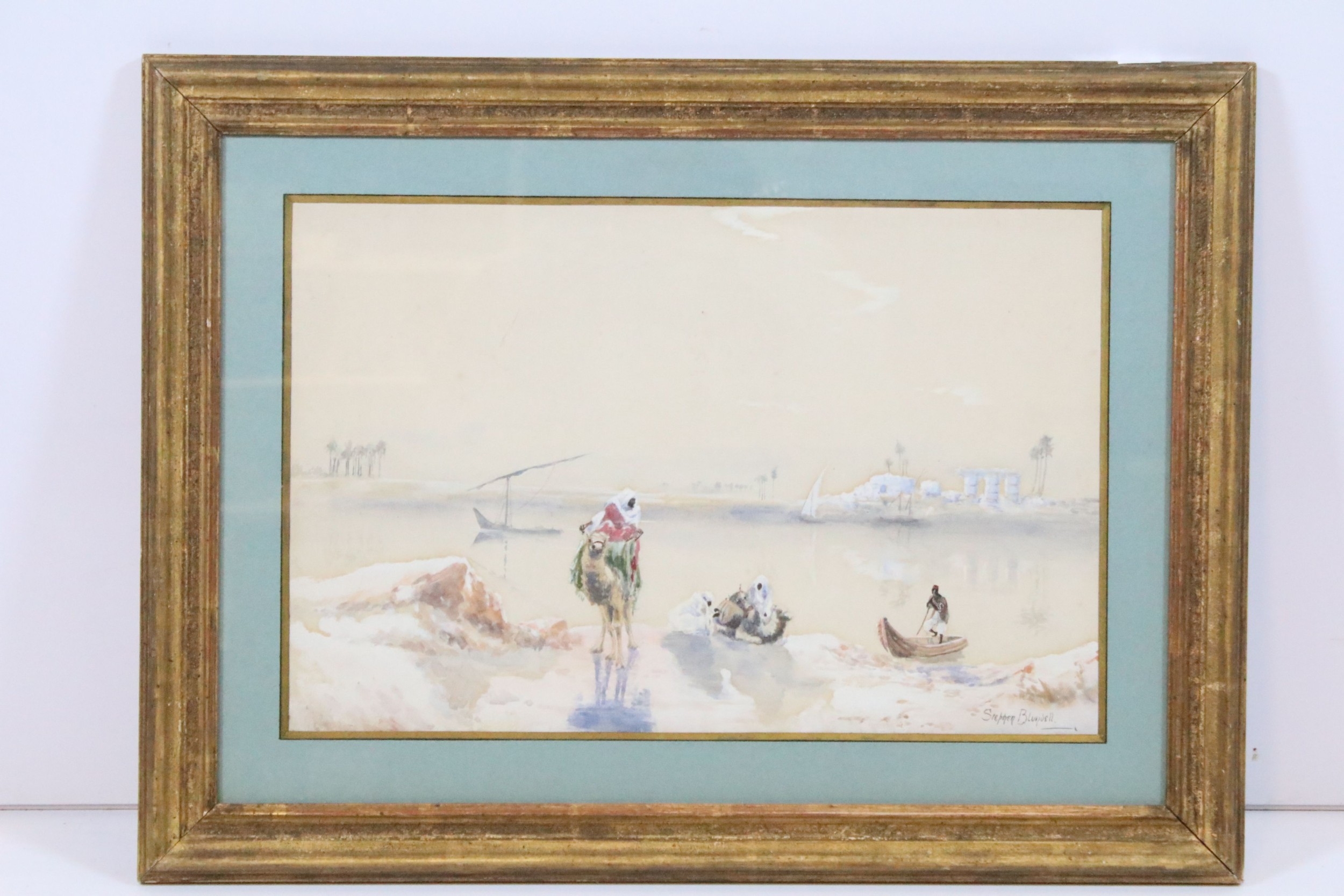 Stephen Blundell (20th century), Middle Eastern view with figures, camels and sailboats by the River Nile, watercolour, signed lower right, 27 x 41cm, framed and glazed