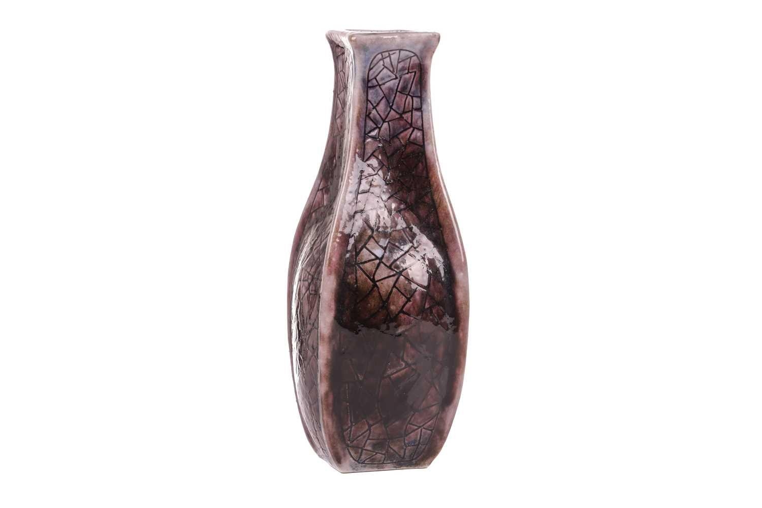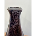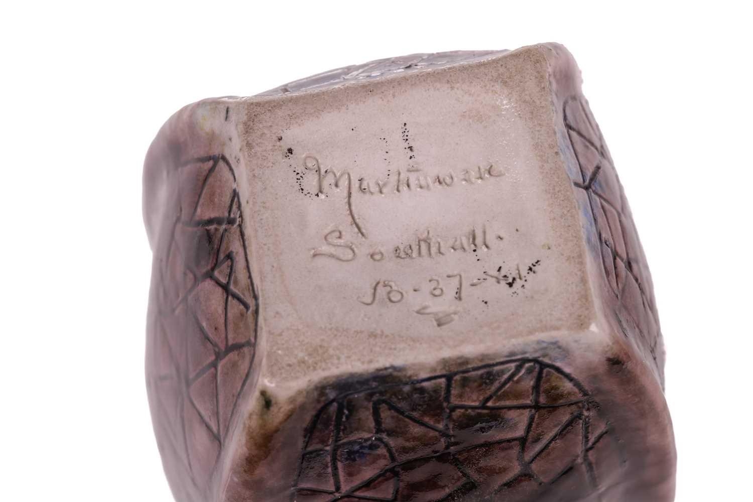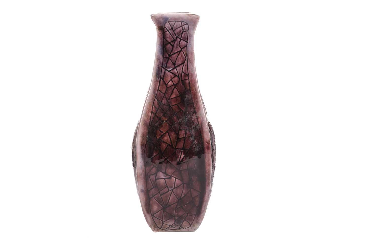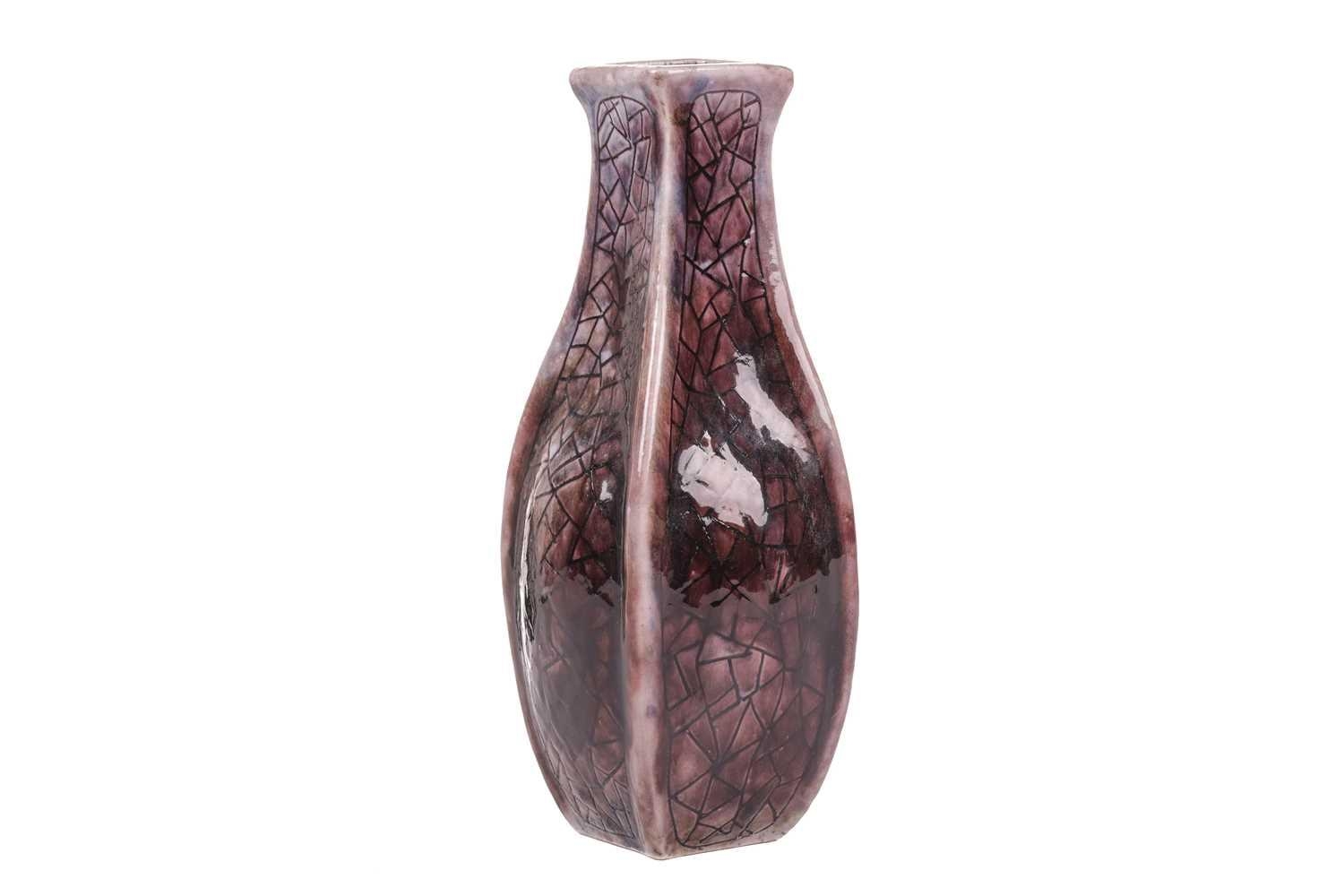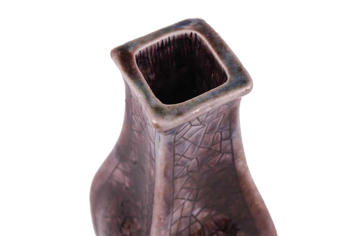 Clement Martin for Martin Brothers, a purple-glazed vase of shaped, square form, 'cracked ice' decoration, incised 'Martinware Southall' and dated 10-37, 22.5 cm.