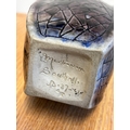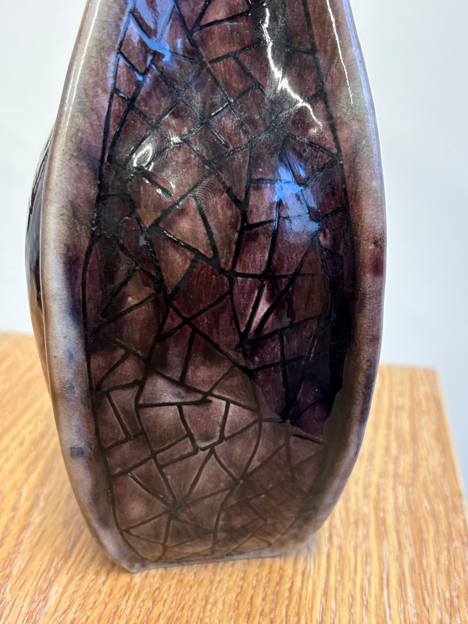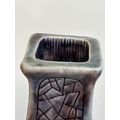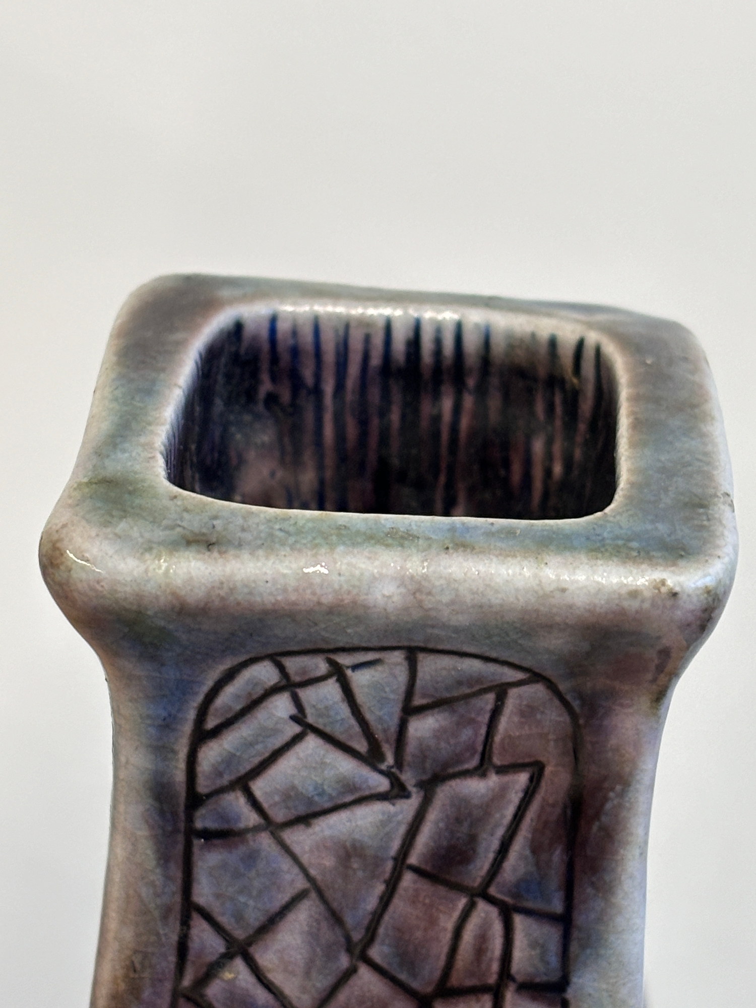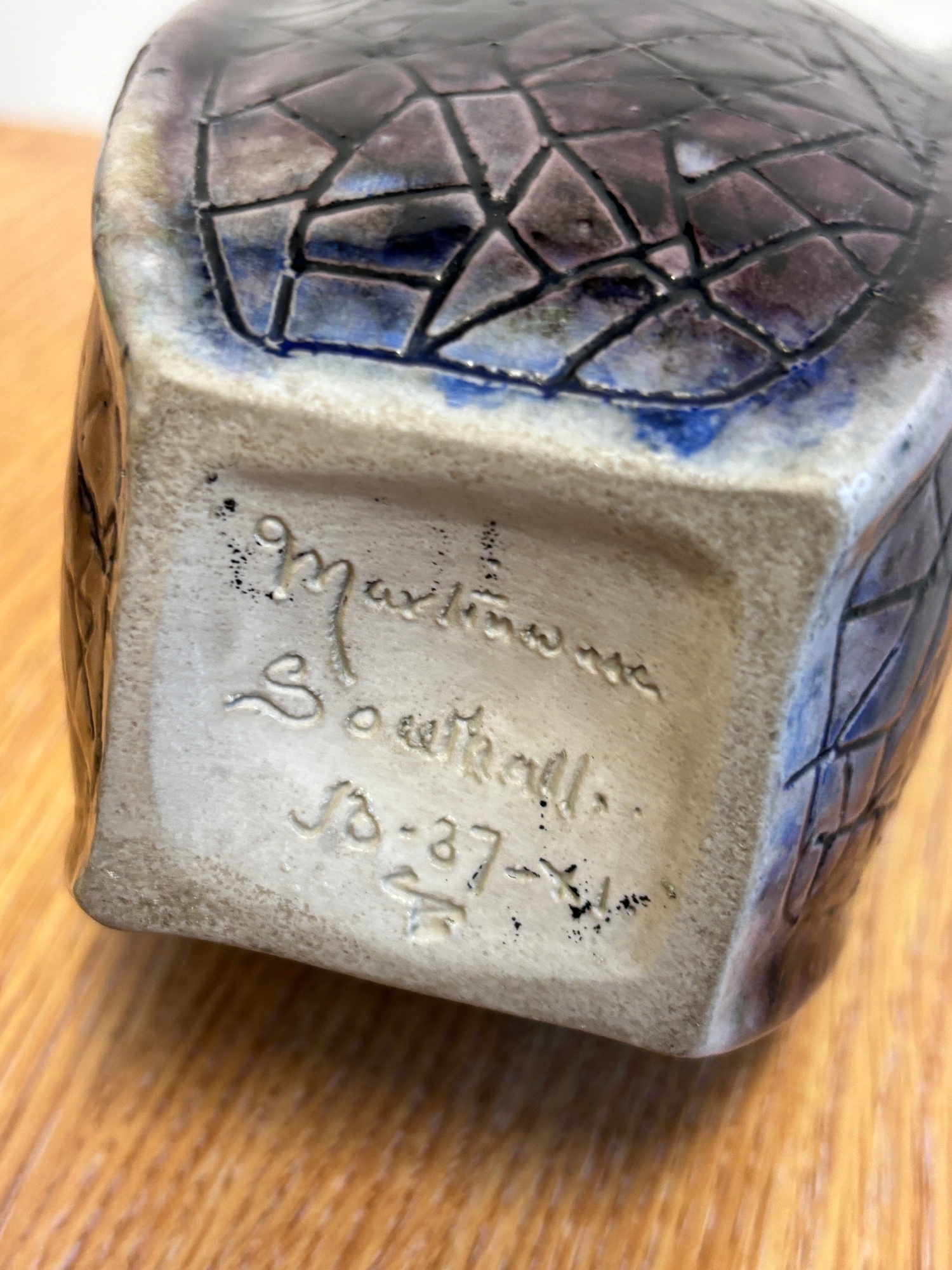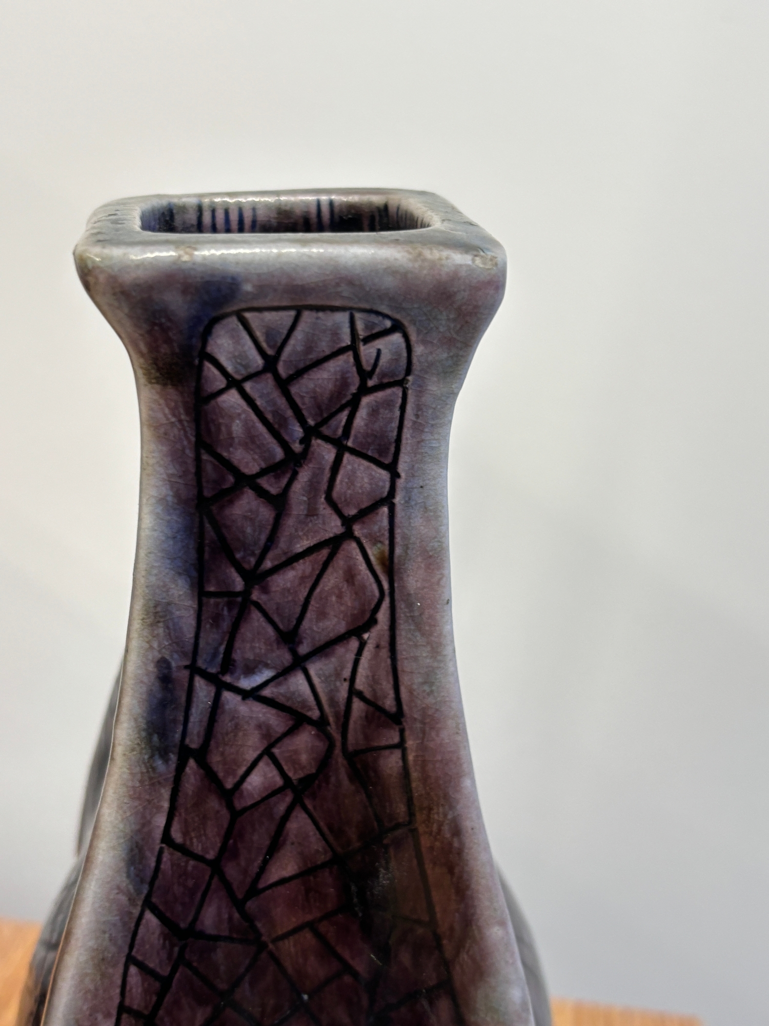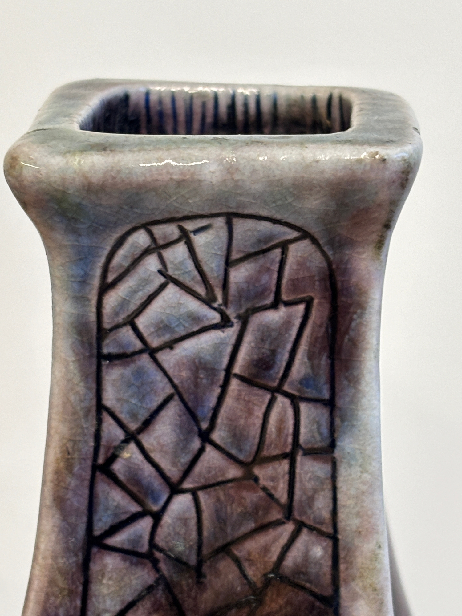 Clement Martin for Martin Brothers, a purple-glazed vase of shaped, square form, 'cracked ice' decoration, incised 'Martinware Southall' and dated 10-37, 22.5 cm.