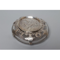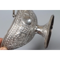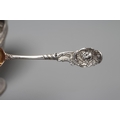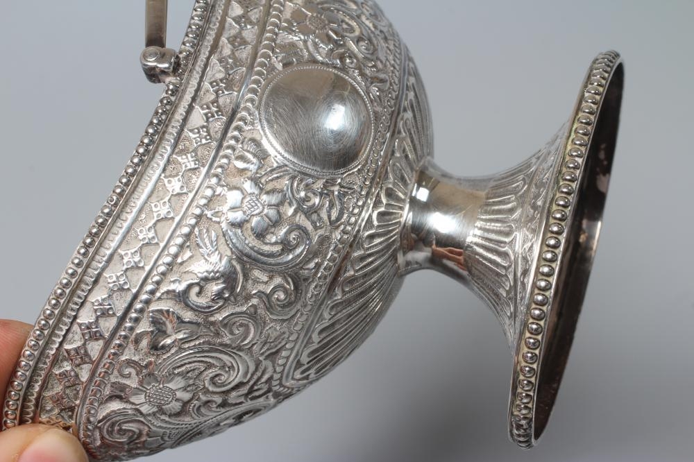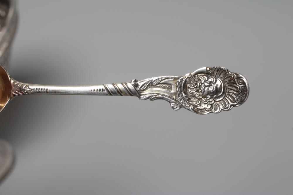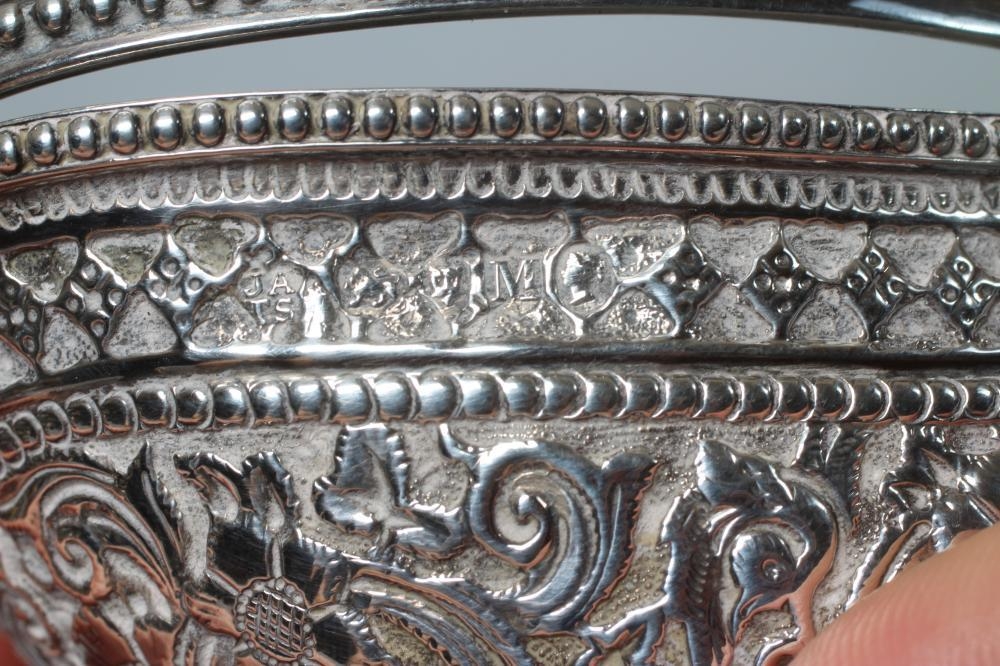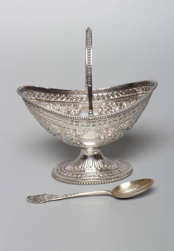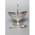 A VICTORIAN SILVER OVAL SUGAR BASKET by John Aldwinckle & Thomas Slater, London 1887, chased and repousse with Indianesque style banding on a low pedestal and with overhead swing handle, 5" wide, together with a later spoon by Ackroyd Rhodes, London 1900, with mask finial, 4ozs 17dwts total (2) (Illustrated)