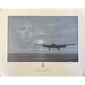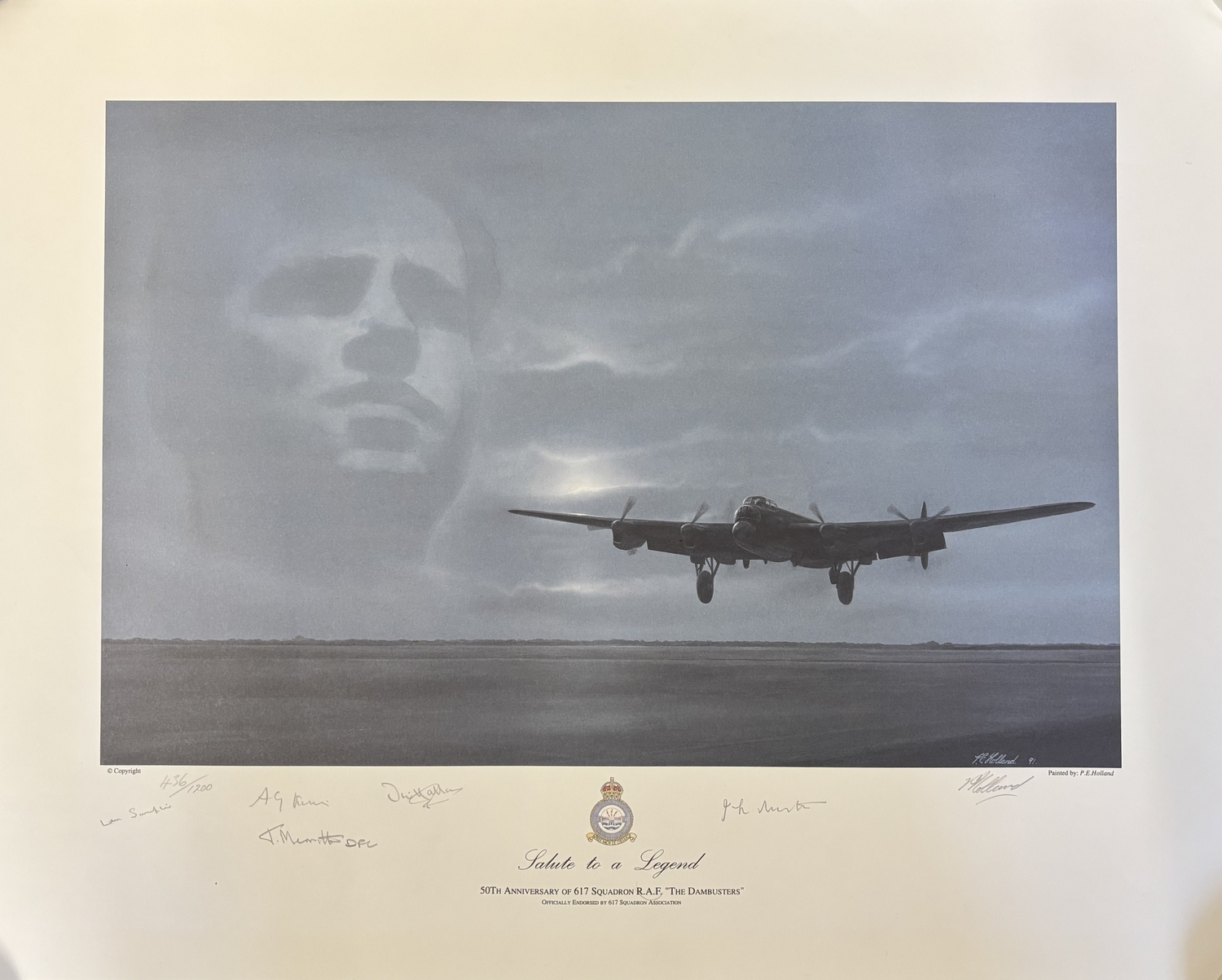 Dambusters 617 Squadron Salute to a Legend 24x19inch multi'signed P.E Holland print. A superb Limited-Edition print depicting a Lancaster and a ghostly image of Guy Gibson. Original painted by P E Holland and limited to 1200 (this being 436). Signed by Mr Holland and five members of 617 Squadron.