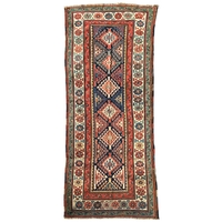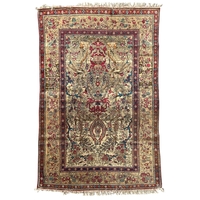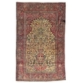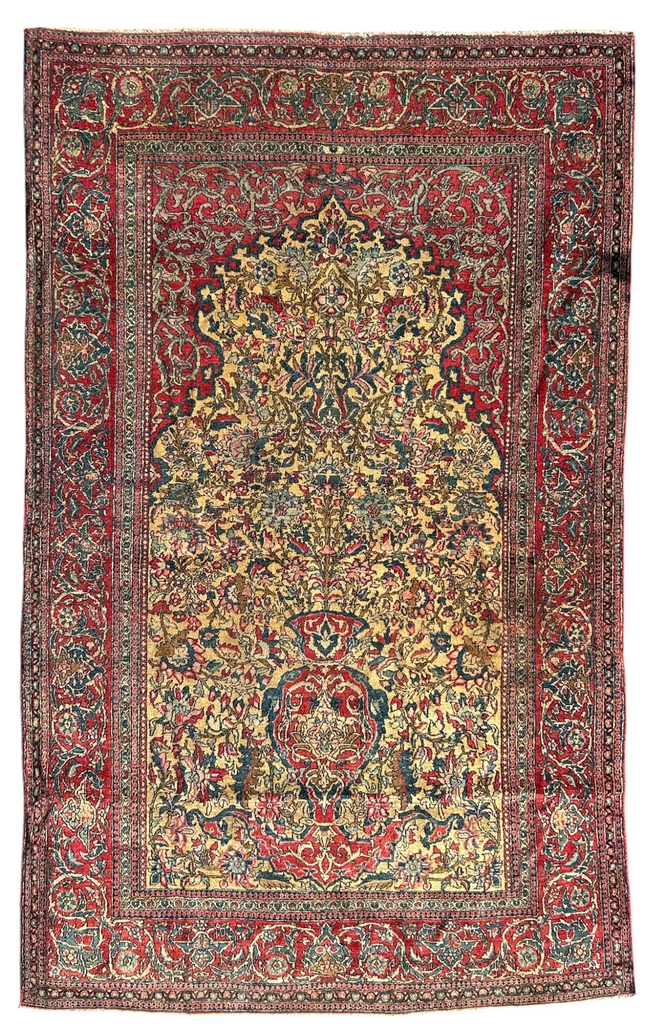 The mustard field with urn issuing flowers beneath the mihrab flanked by raspberry upper spandrels of scrolling vines. Enclosed by floral borders and flanked by carnation guard stripes.