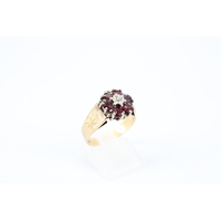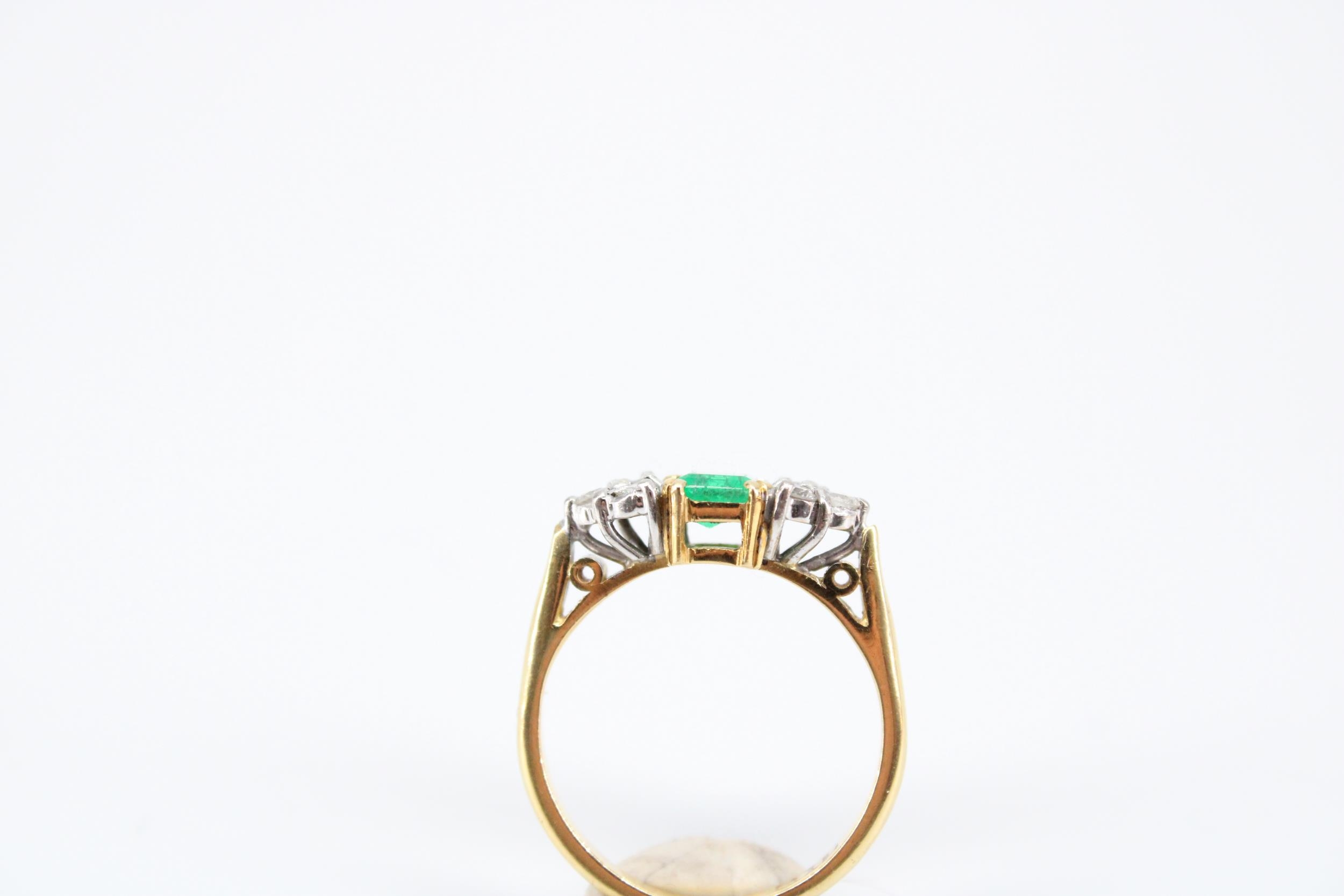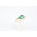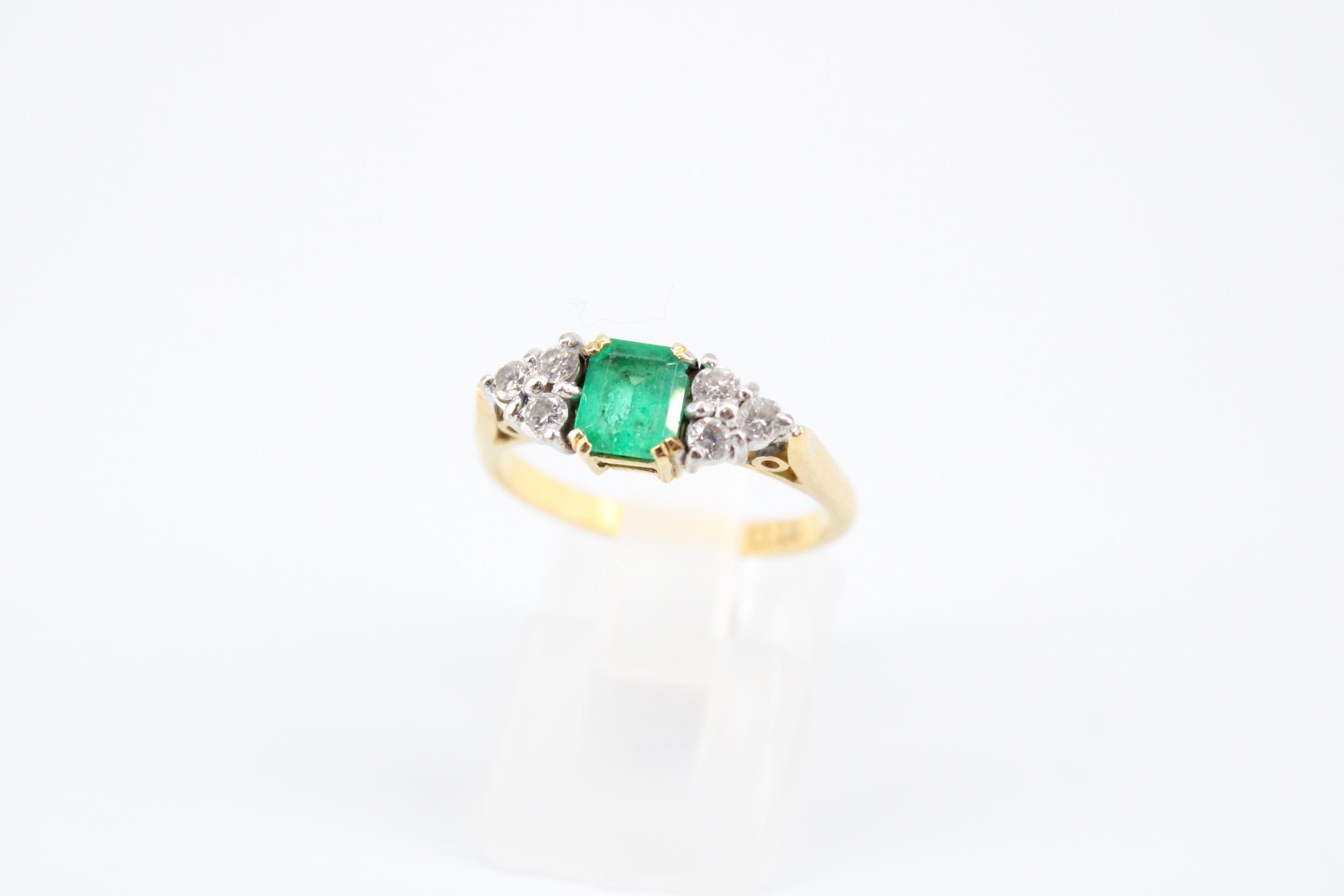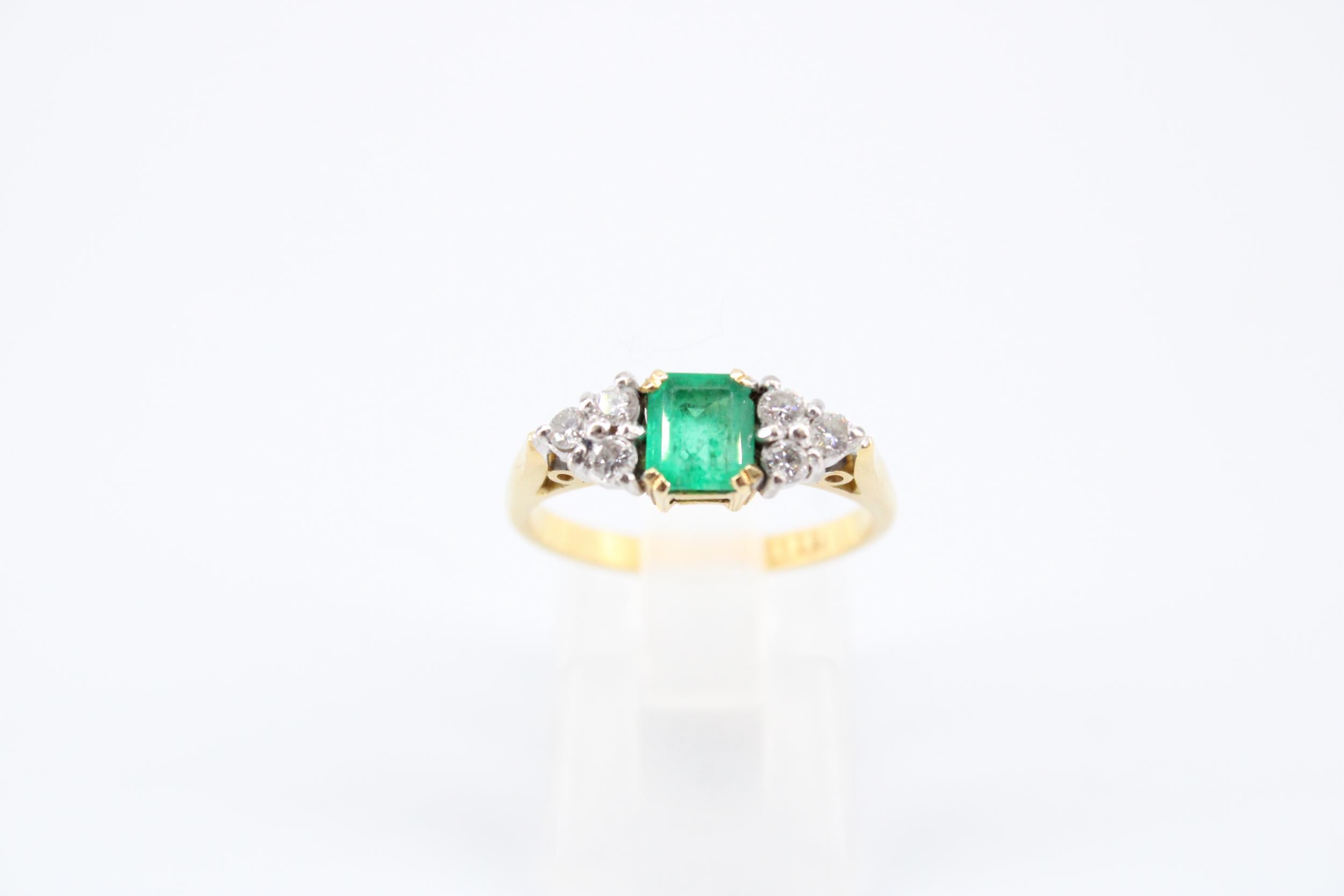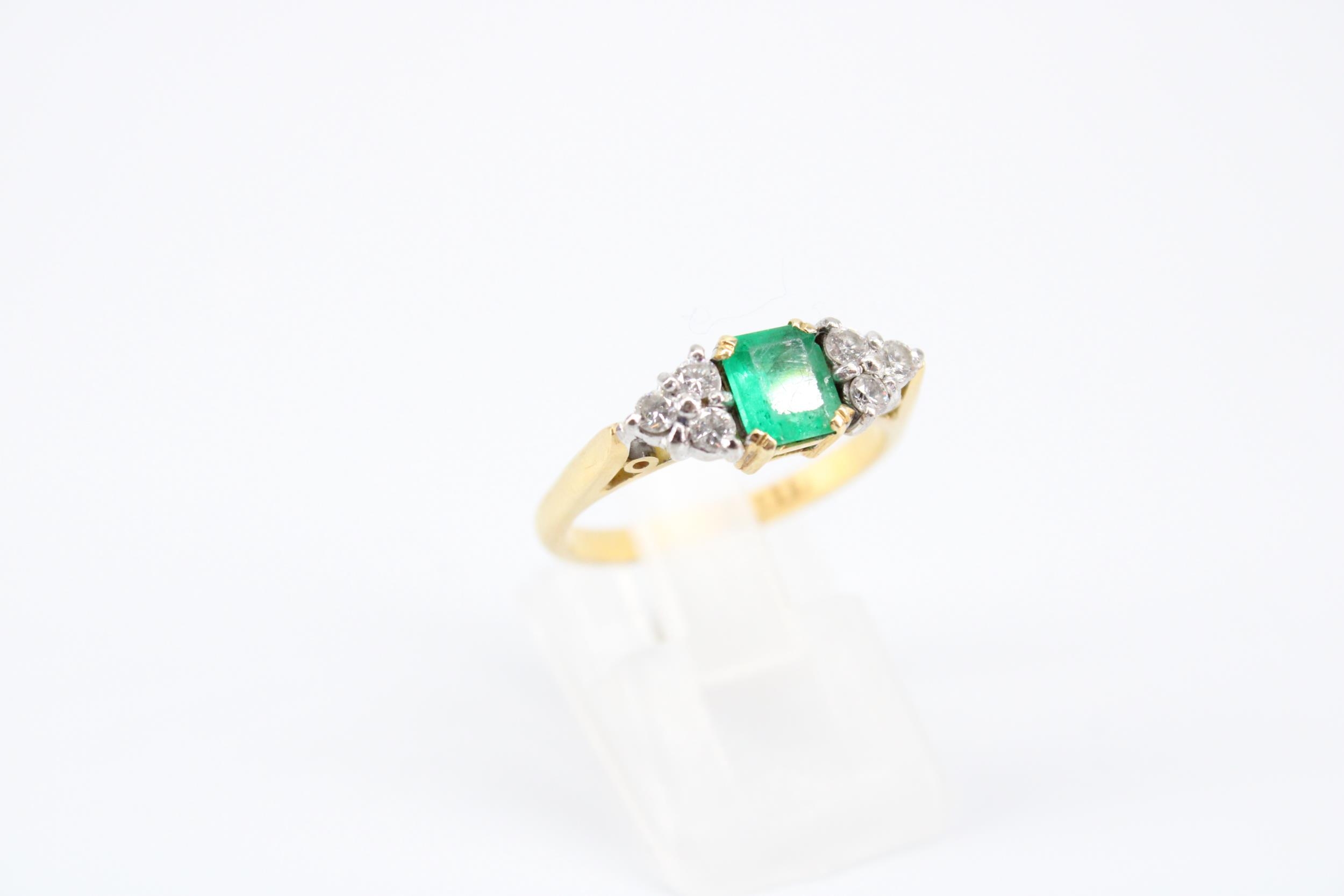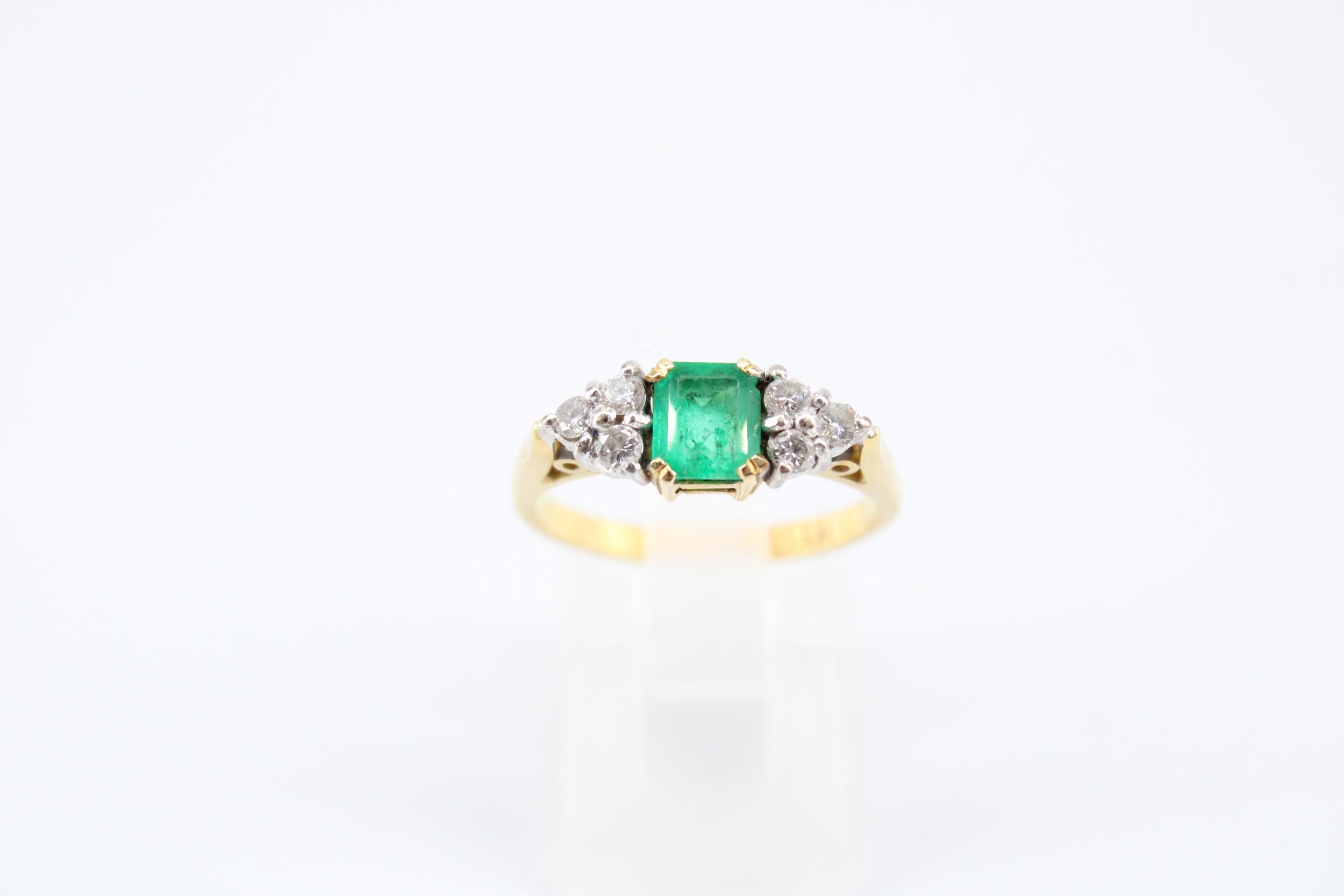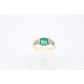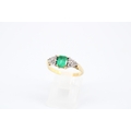 An 18ct Emerald & Diamond Ring, Featuring a Central Radiant Cut Emerald with clusters of three diamonds each side.